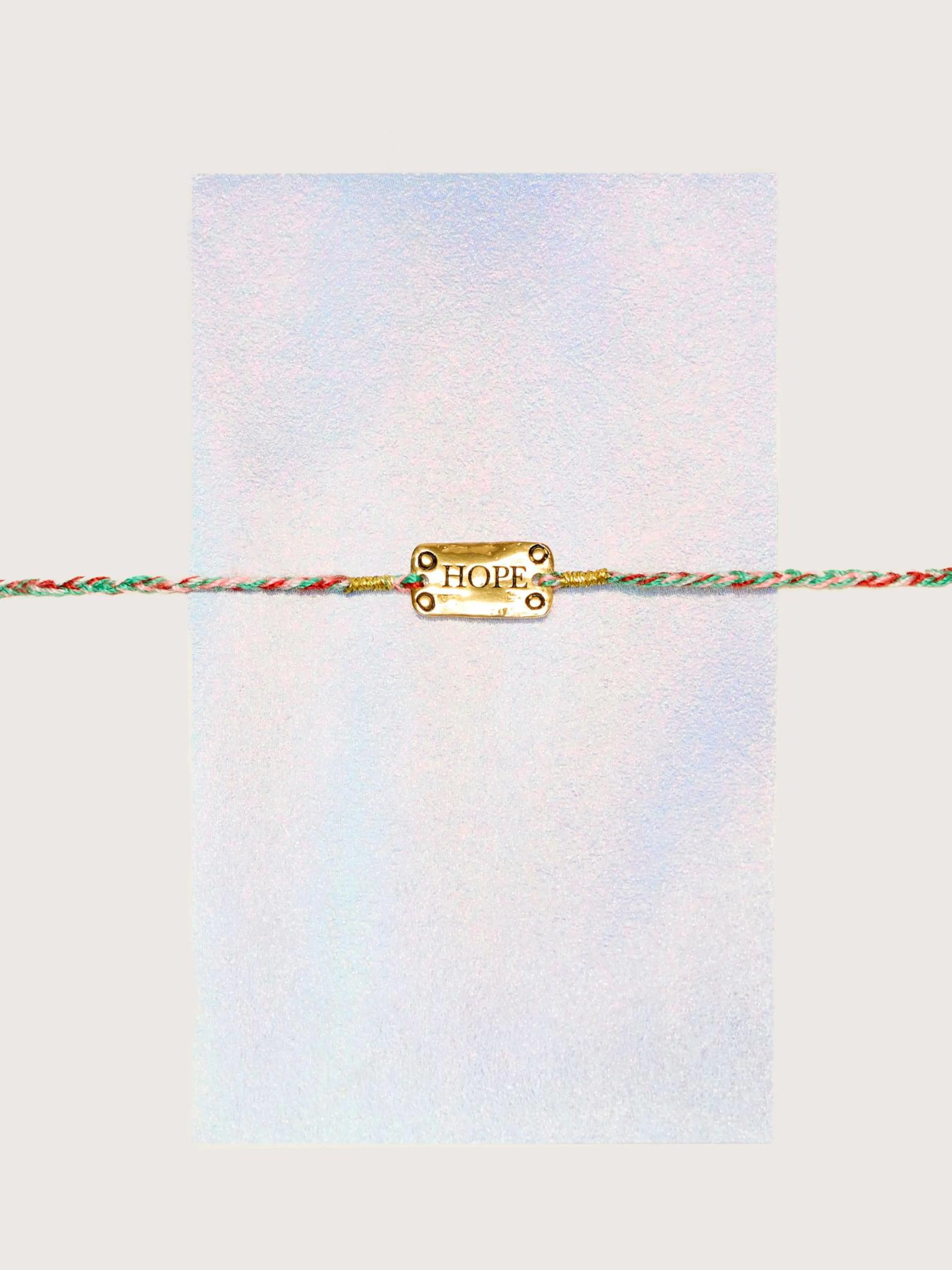 De Hope armband is een handgemaakte, verstelbare vlecht van fijn koord versierd met een vergulde “Hope” bedel.