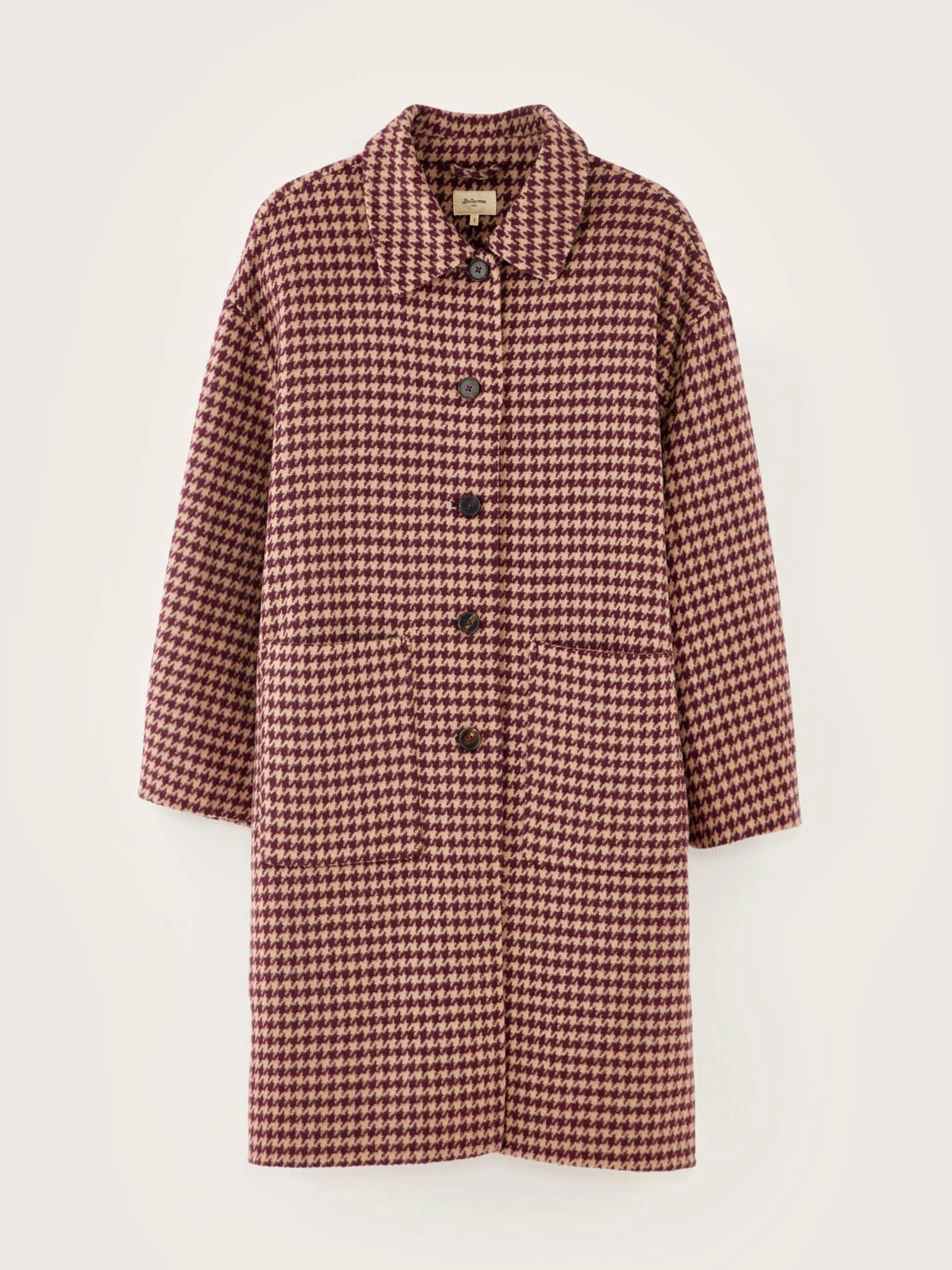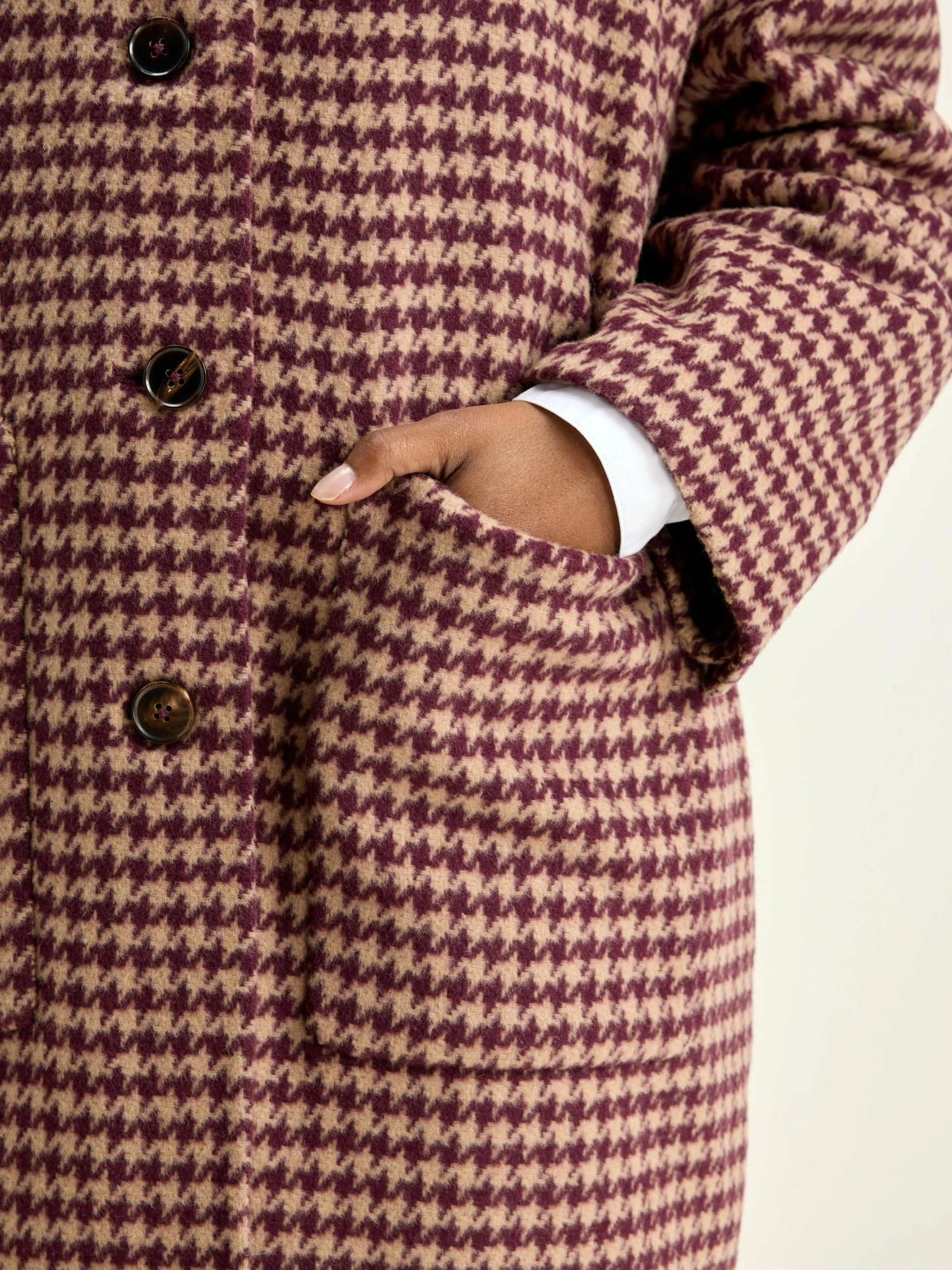 Klassieke mantel met knoopsluiting vooraan, met pied-de-poulestof, een lage schouderlijn en opgestikte zakken.