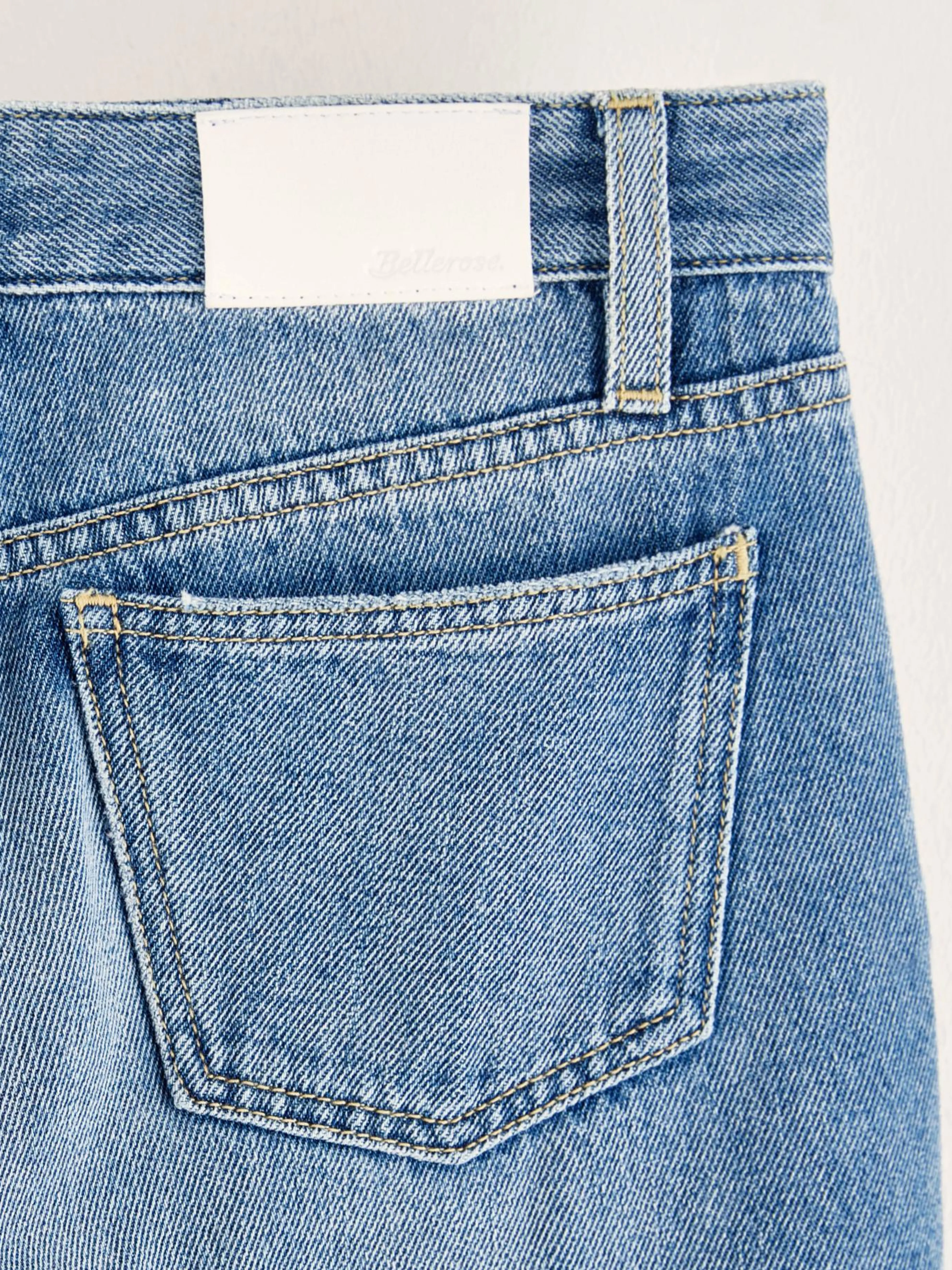 Comfortabele jeans met lage taille, in middenblauw met gelaserprinte sterren.