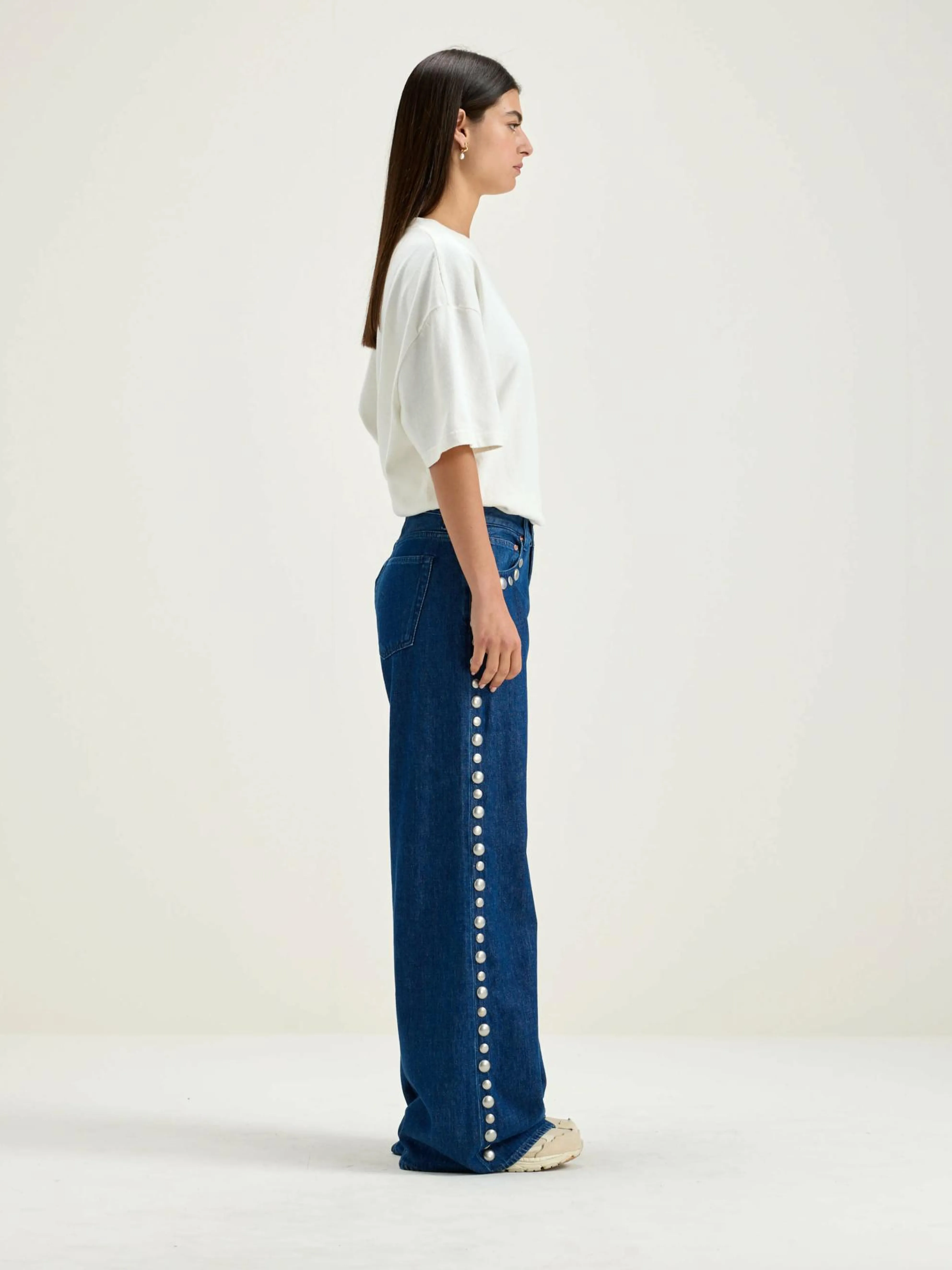 - Zilverkleurige sierknopjes langs de naden van de broekspijpen