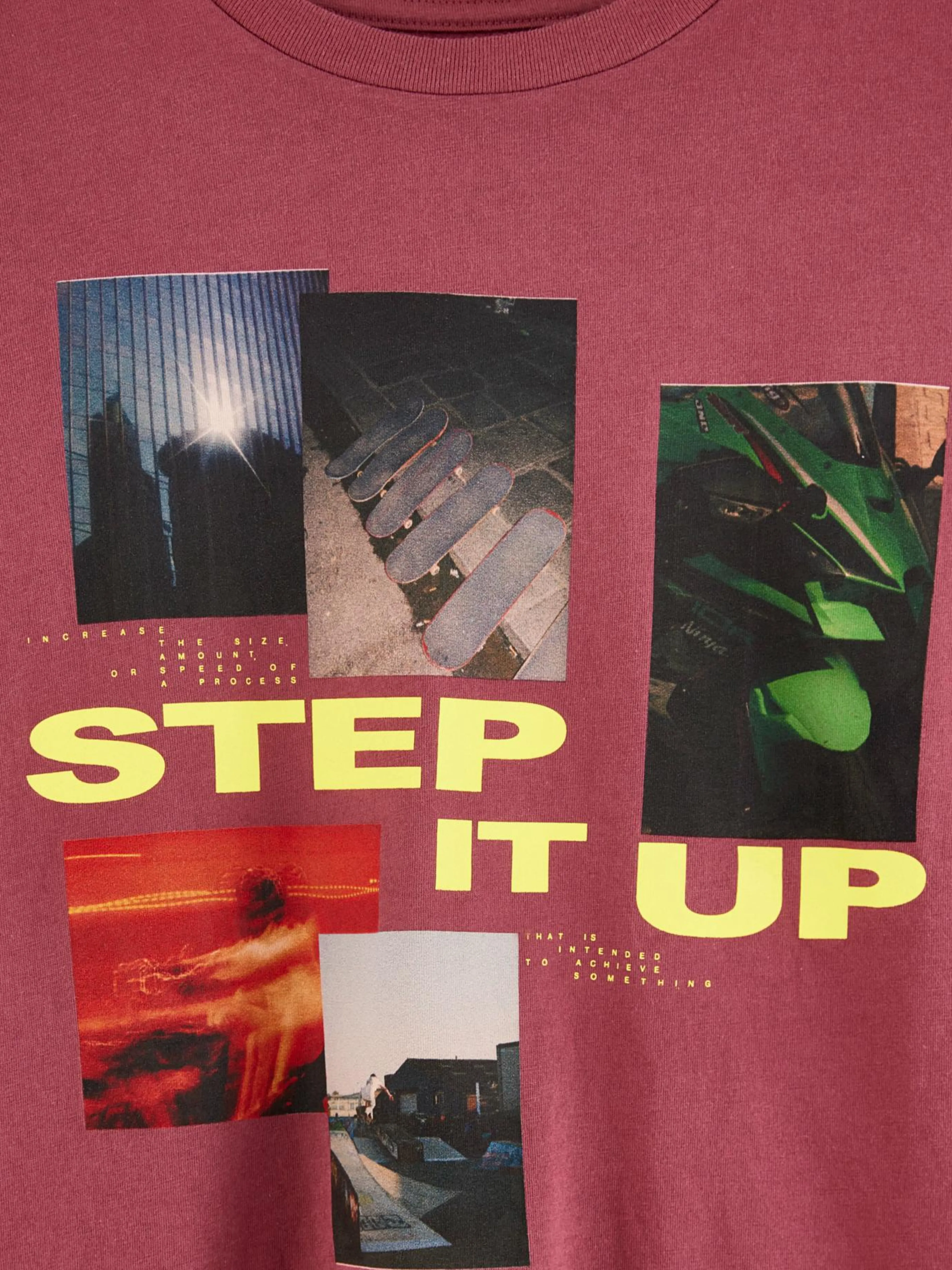 Klassiek rozerood T-shirt met lange mouwen, van geborstelde katoenjersey en met “Step it up”-fotoprint op de voorzijde.