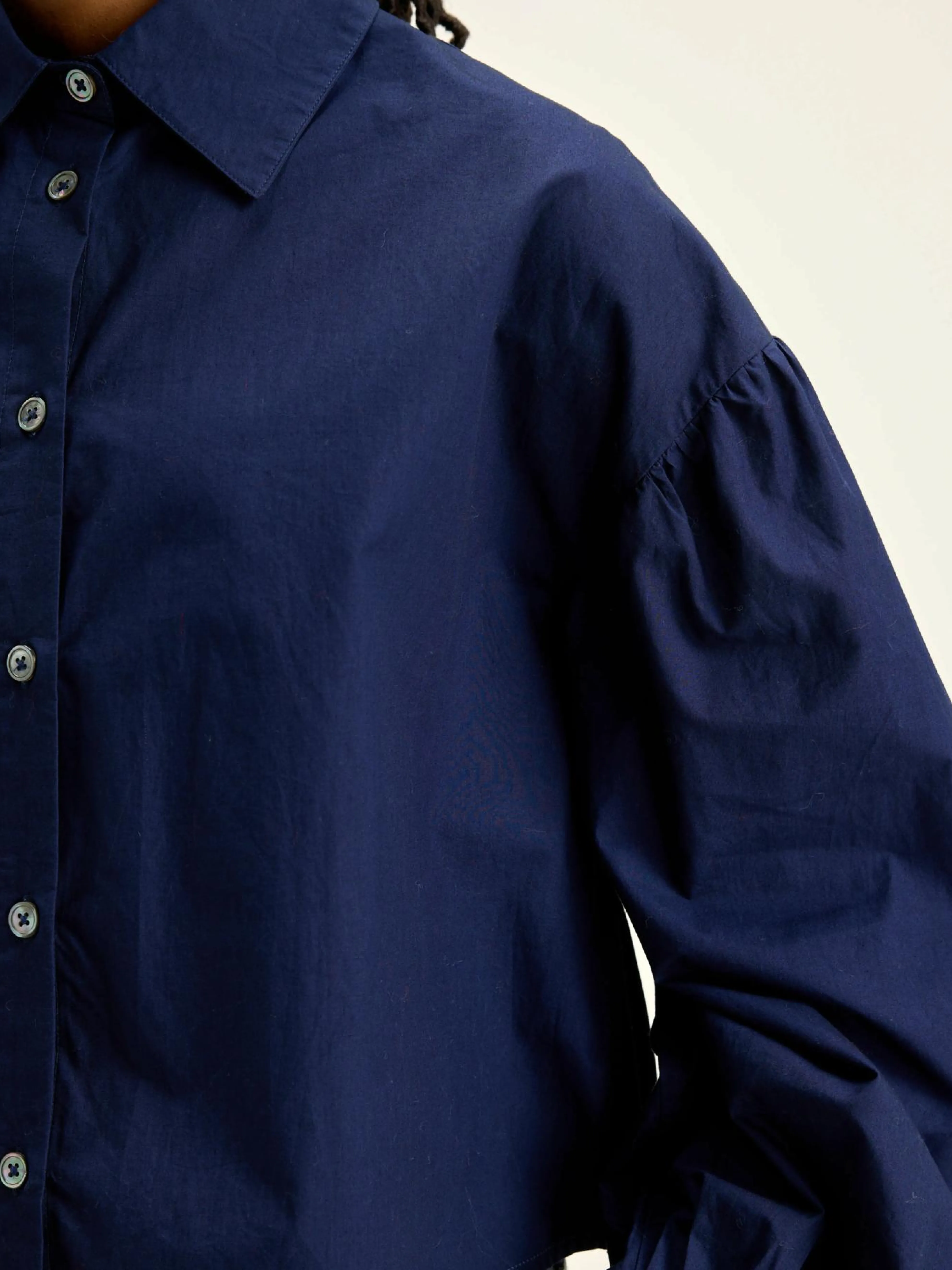 Marineblauw, cropped hemd met grotere kraag en pofmouwen, van katoenpopeline.