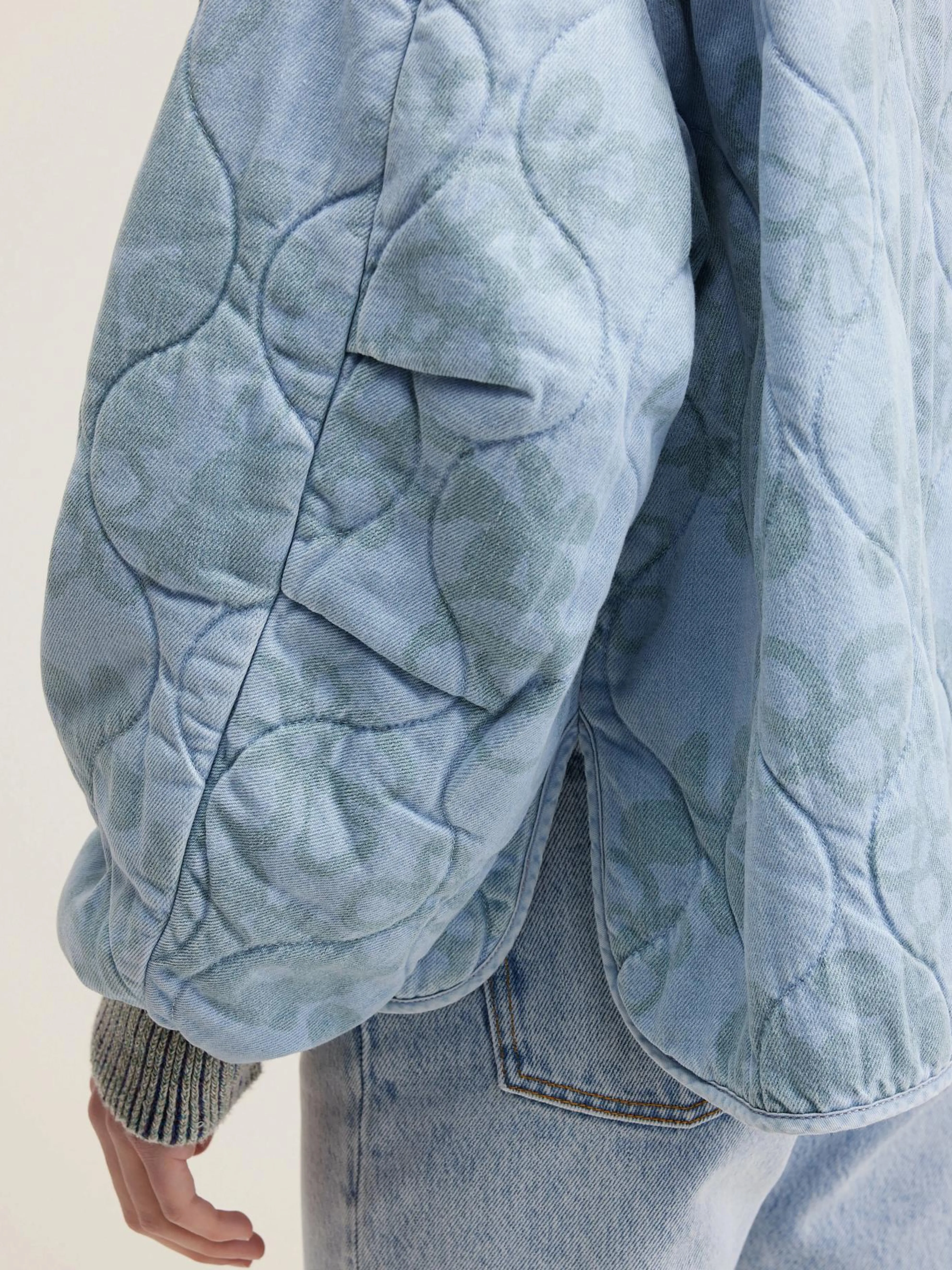 Oversized jack in gewatteerde stijl van lichtblauw denim met eenvoudige ton-sur-ton bloemenprints.
