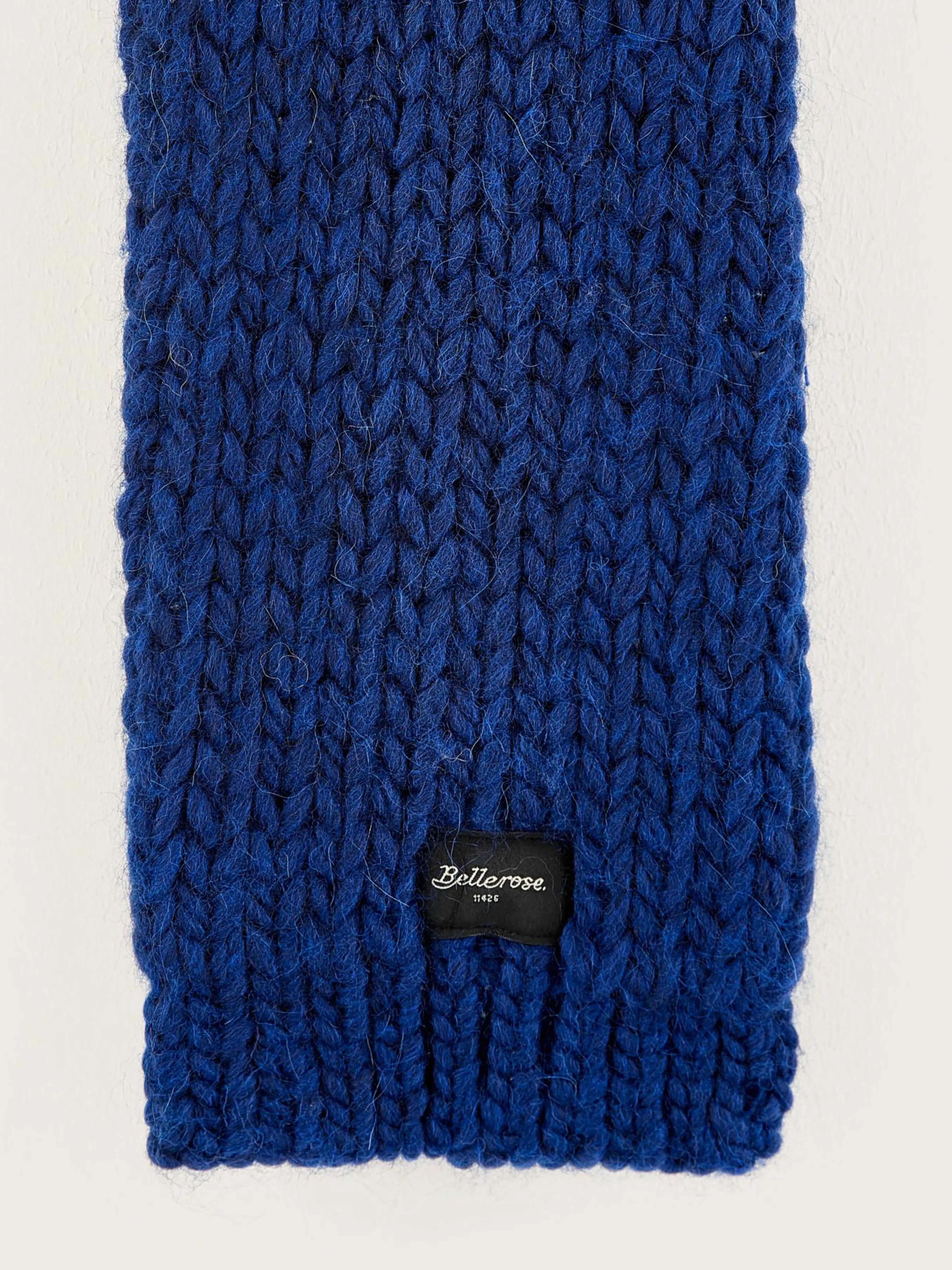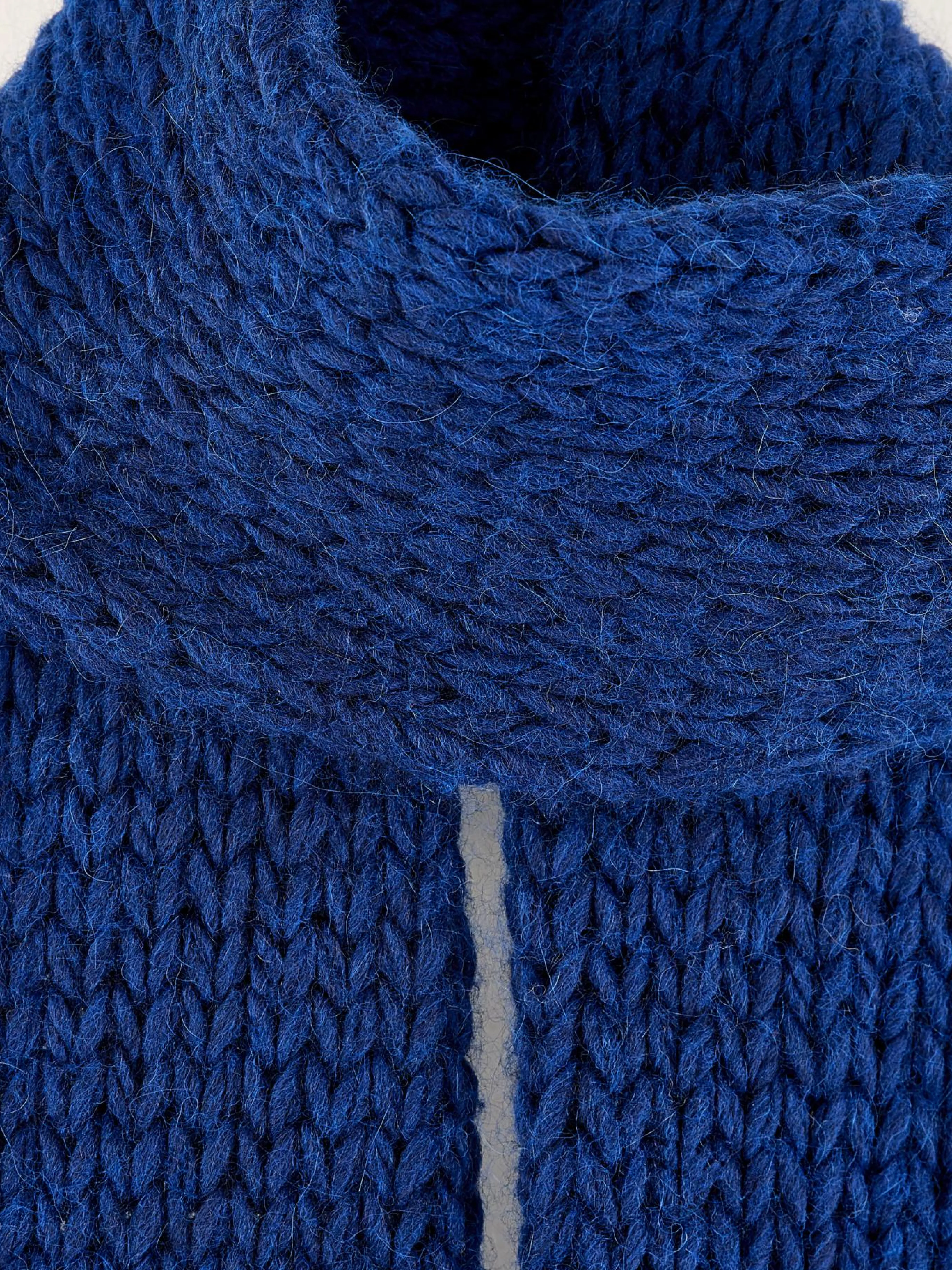 Kobaltblauwe, jersey gebreide sjaal met dik garen.