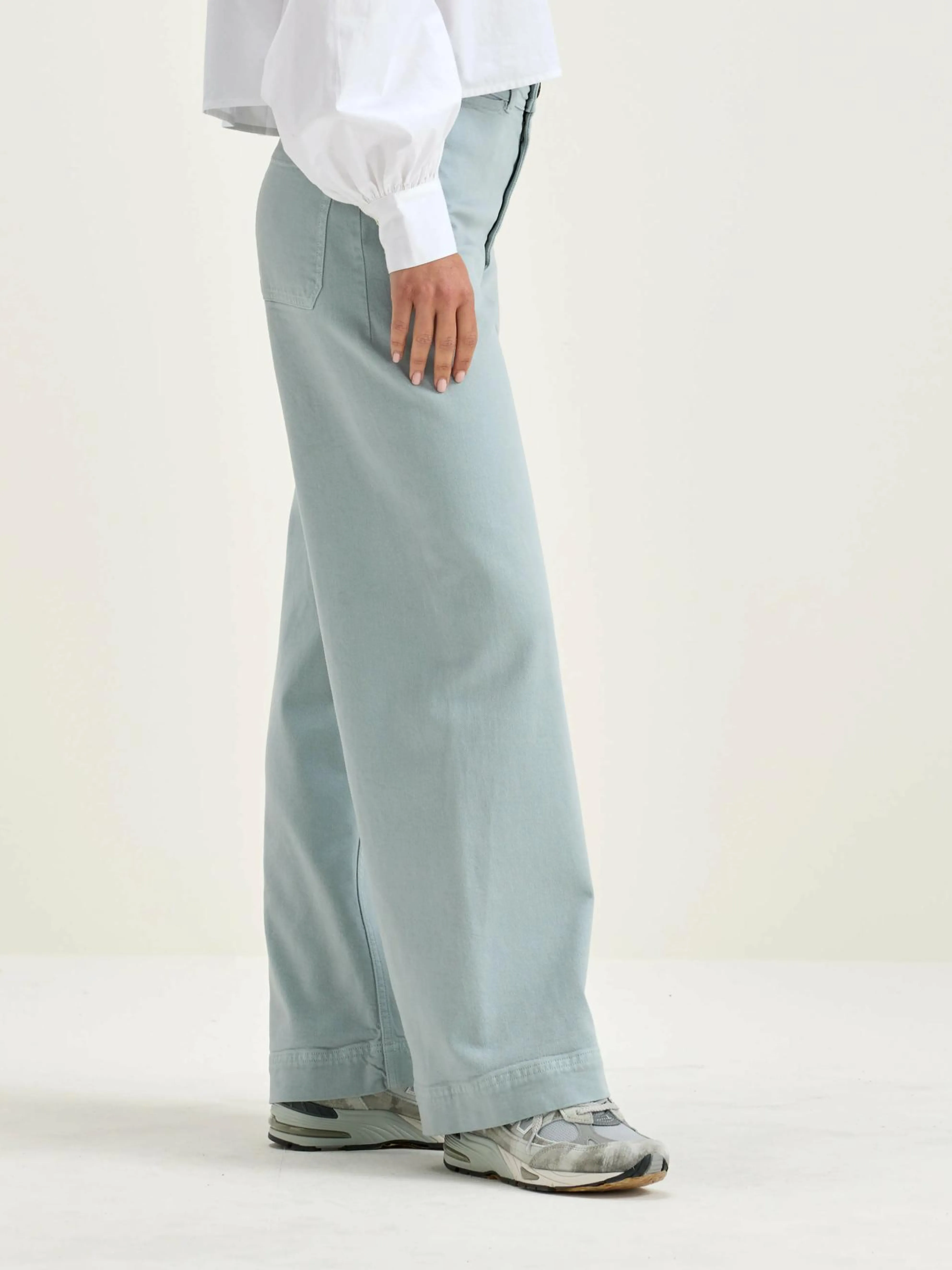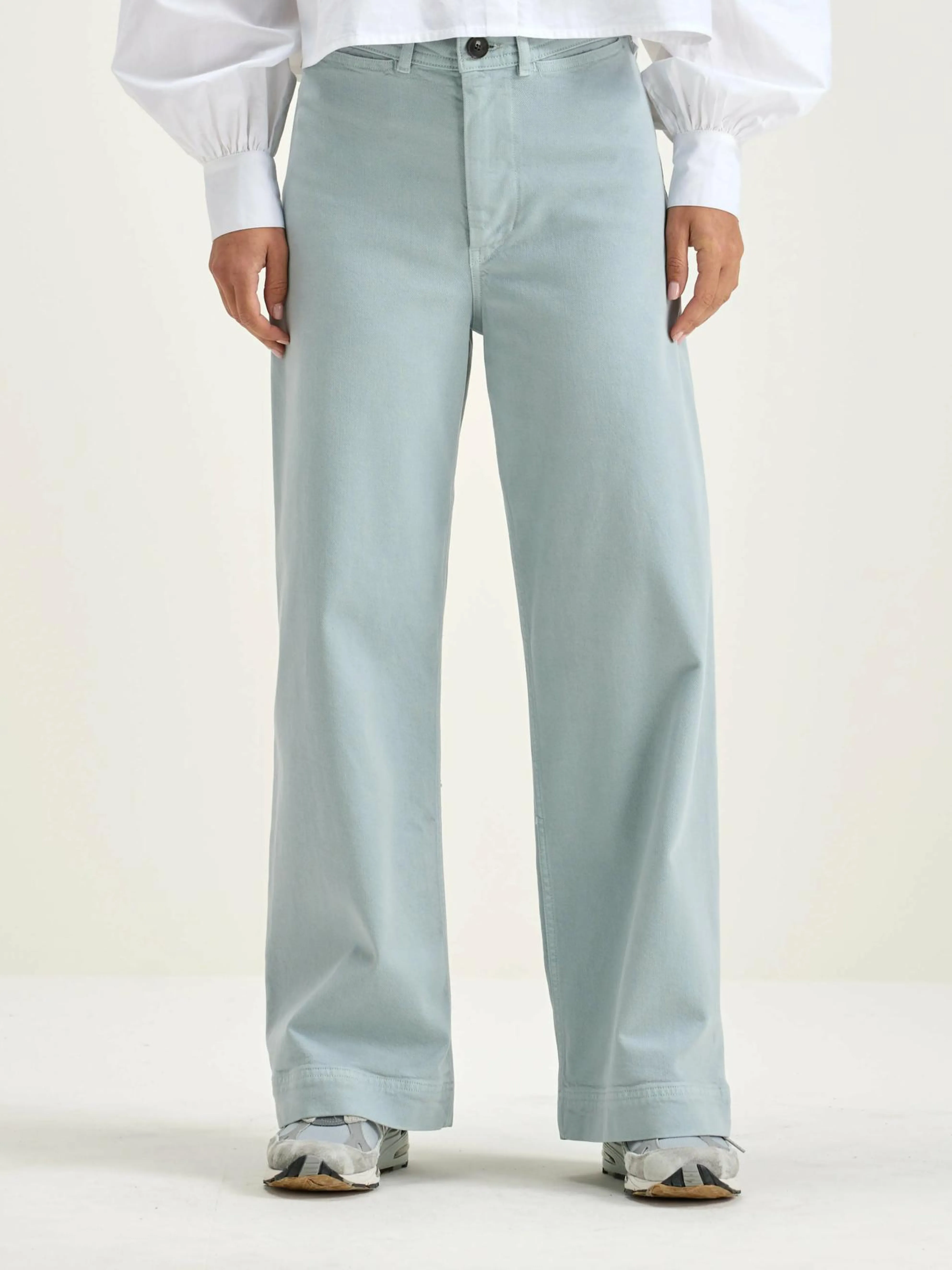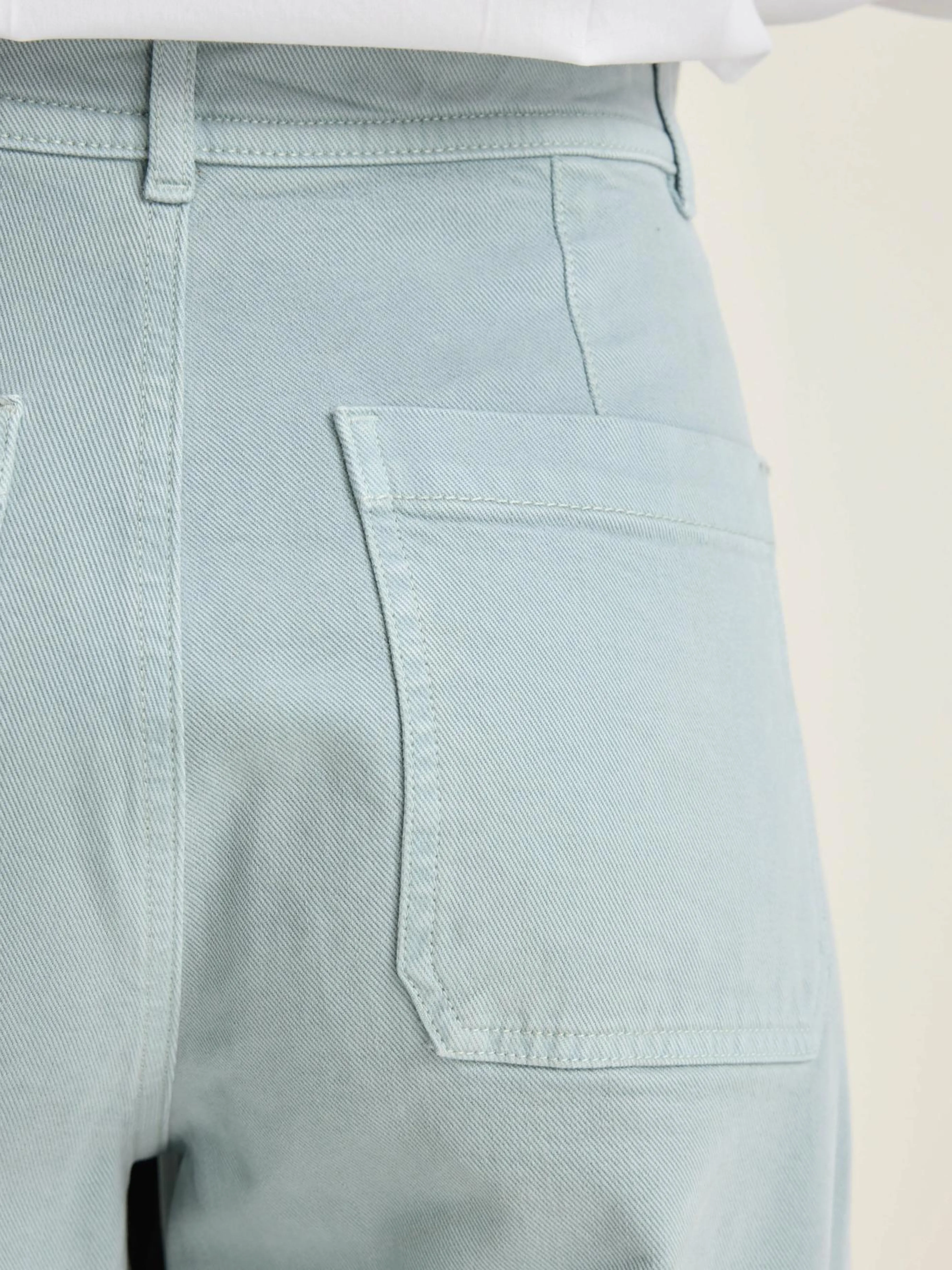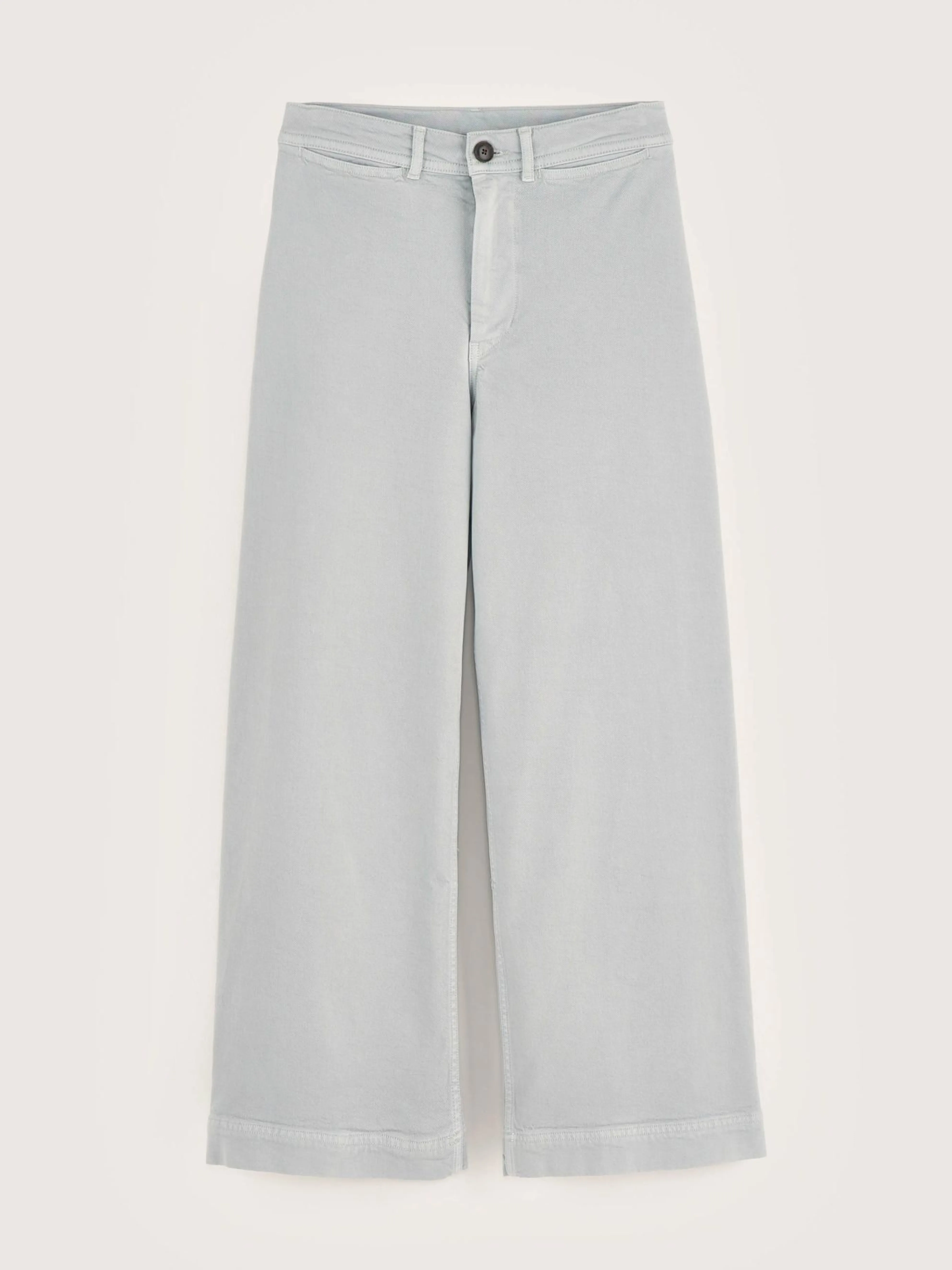 High-waist broek van grijze keperstof, met wijde pijpen.