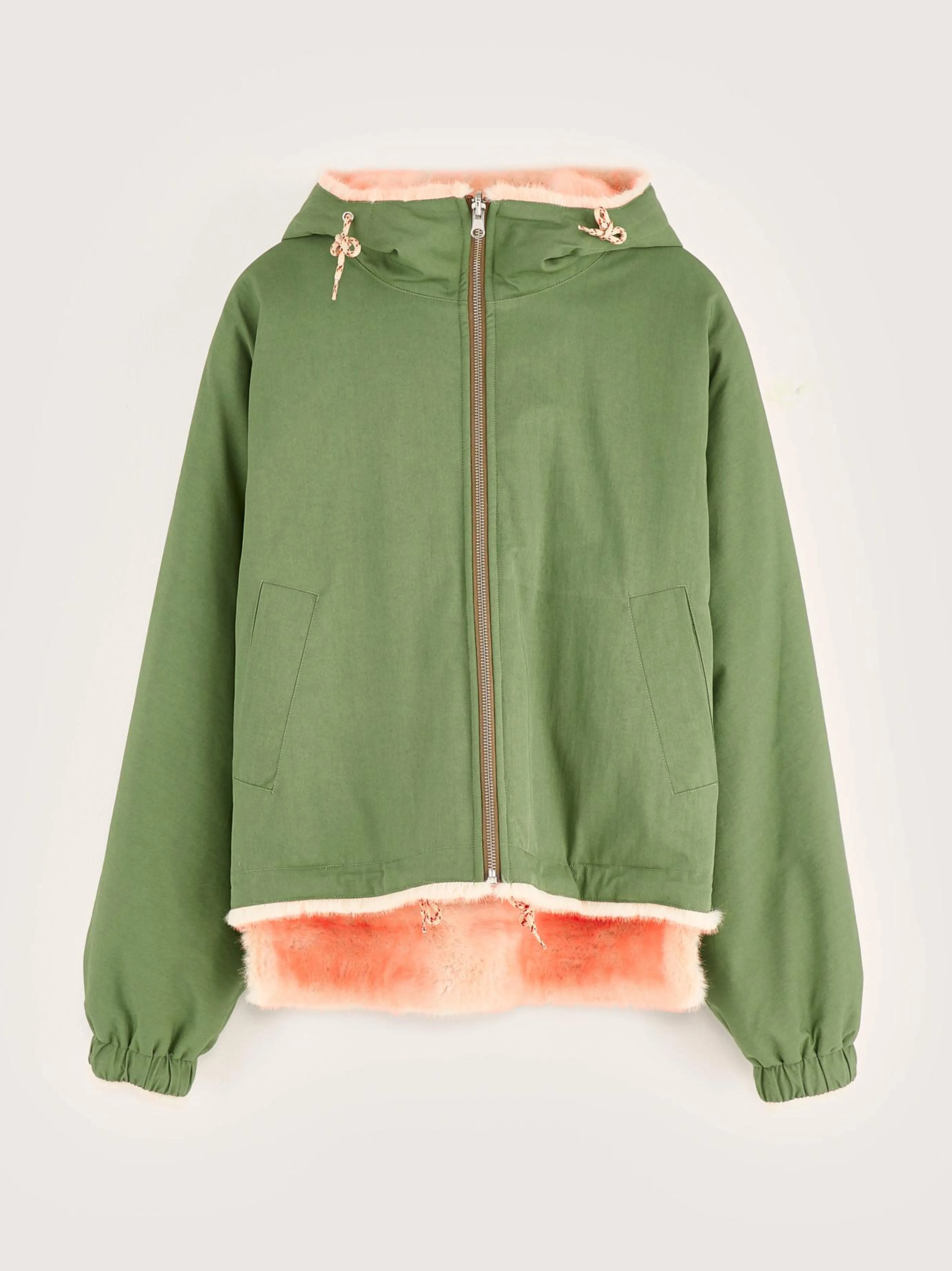Omkeerbaar jasje met capuchon, van groen canvas met voering in nepbont.