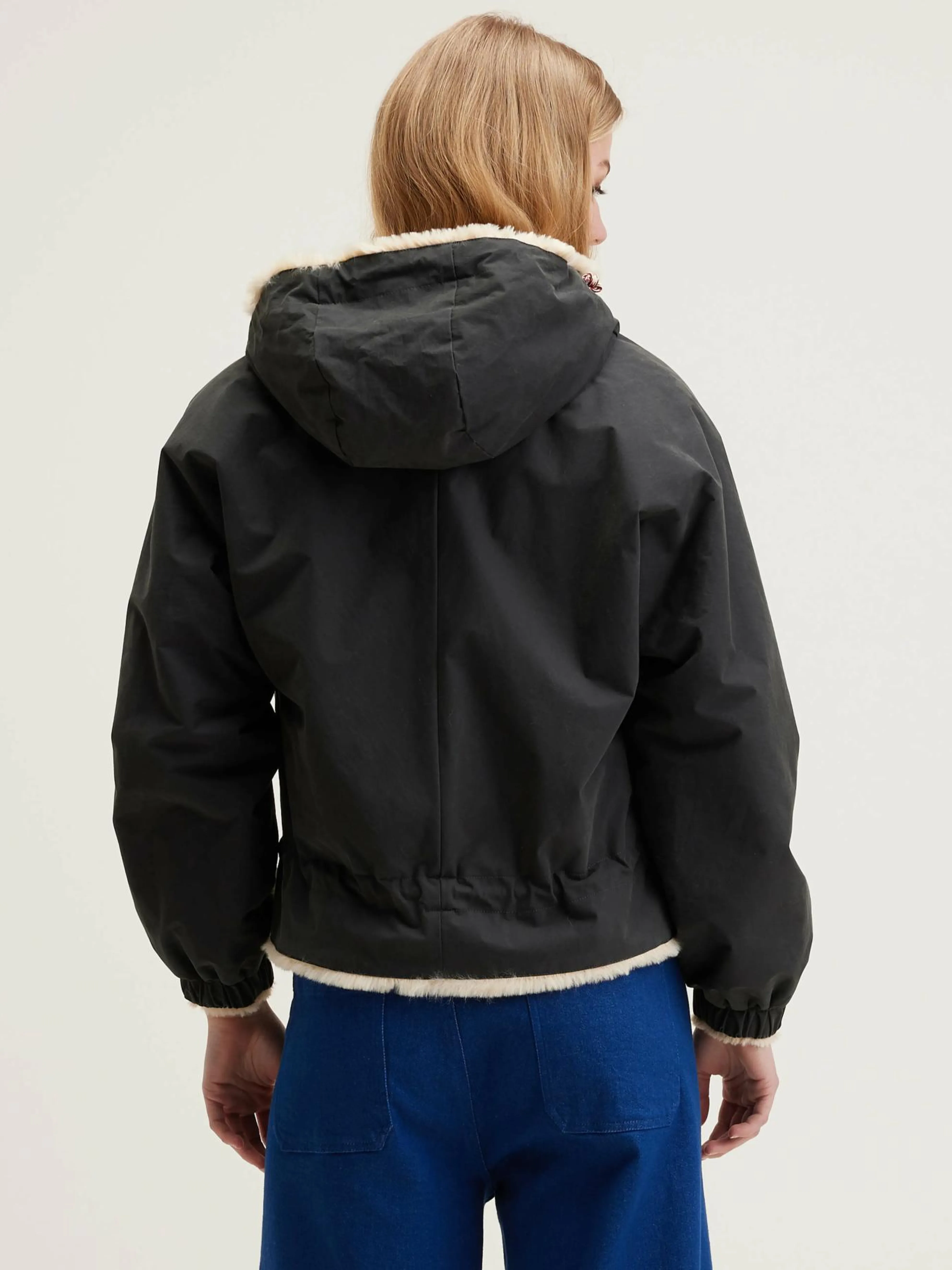 Omkeerbare jas van marineblauw canvaskatoen met capuchon en voering van ecru imitatiebont.