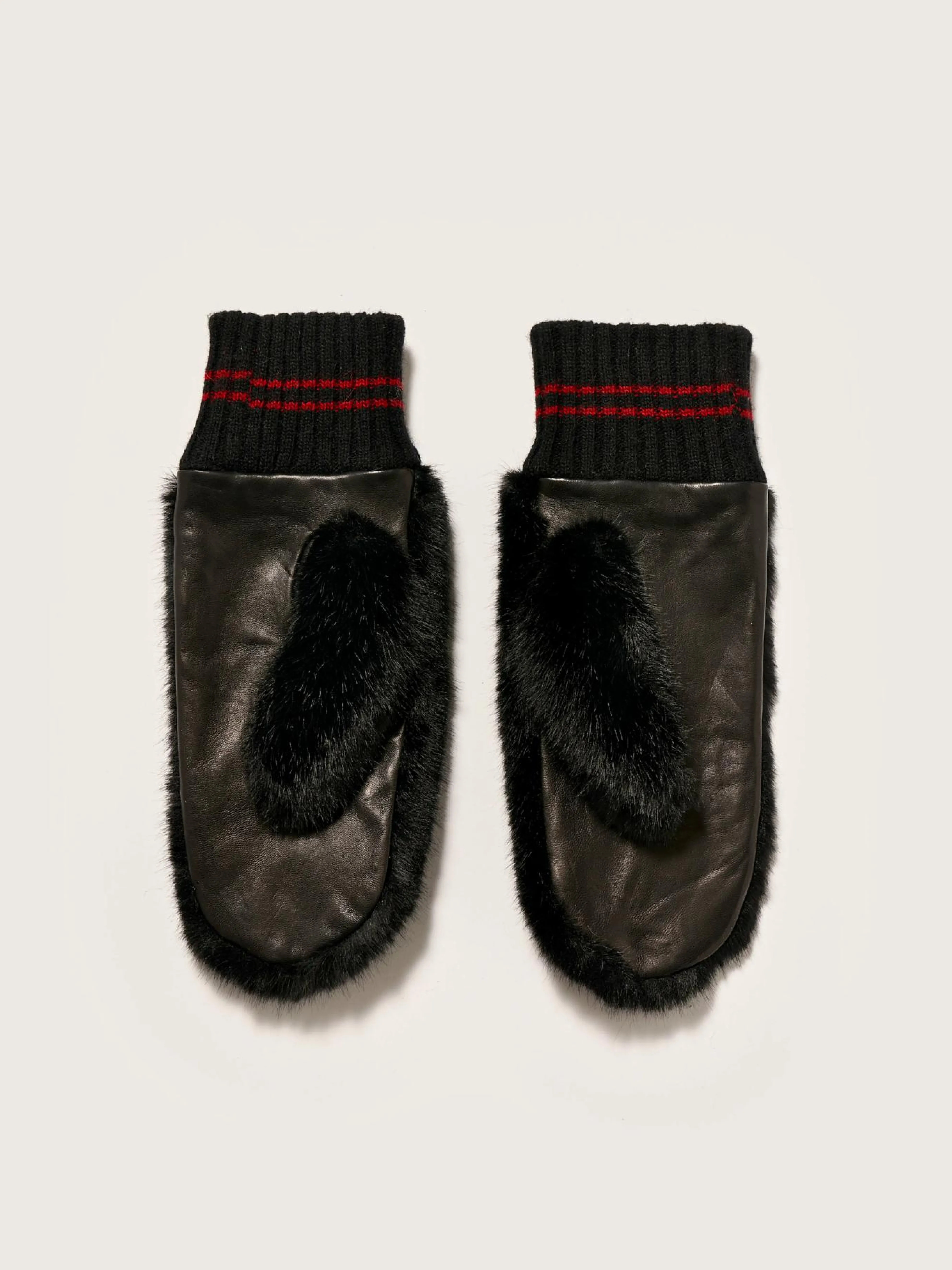 Wanten van zwart nepbont, met leer ter hoogte van de handpalmen en een ribgebreide rand aan de polsen.