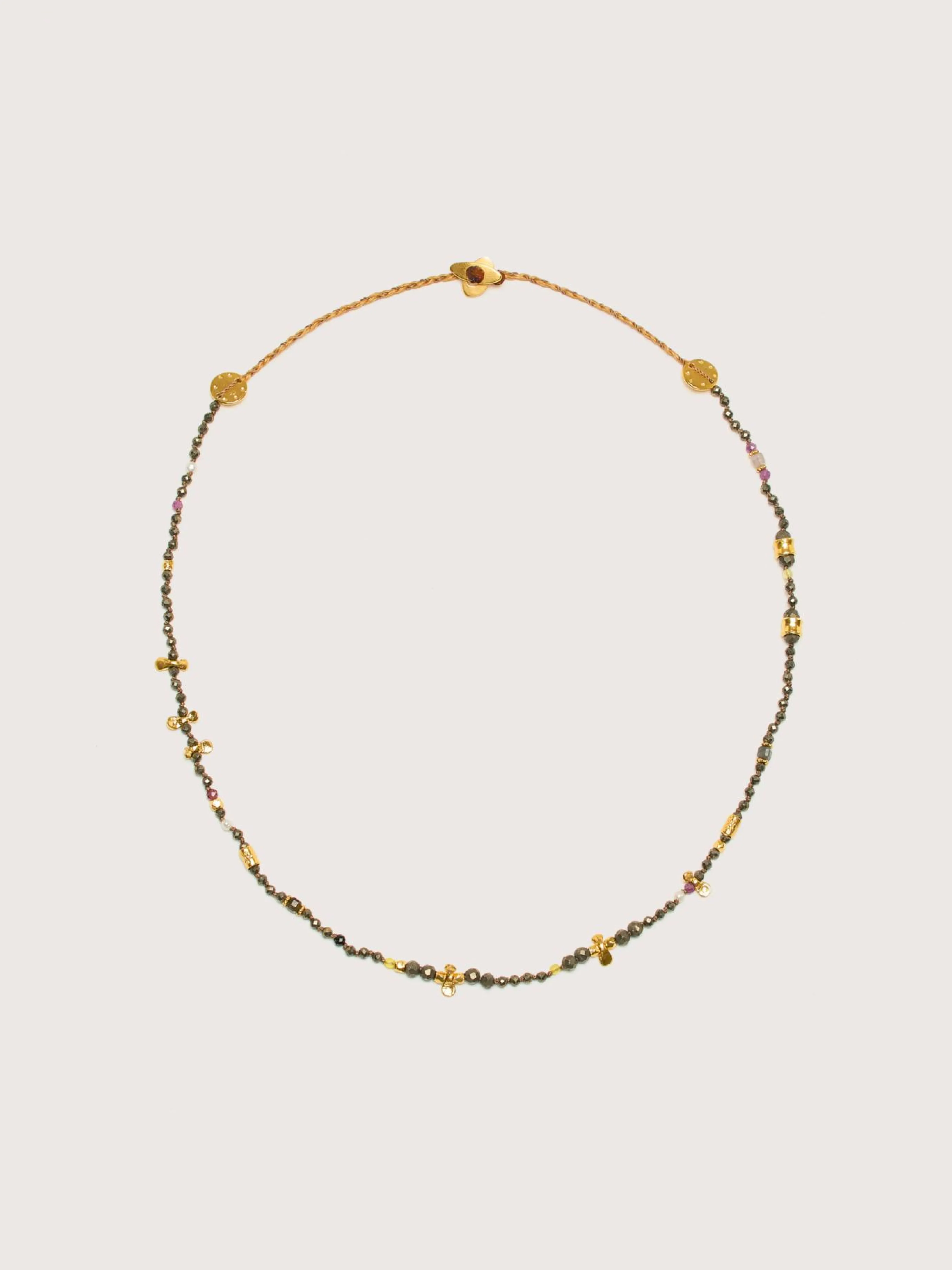 The Mary Gaitani Pyrite necklace is handmade in Greece with pyrite stones and 18k gold-plated charms on a waxed cord.