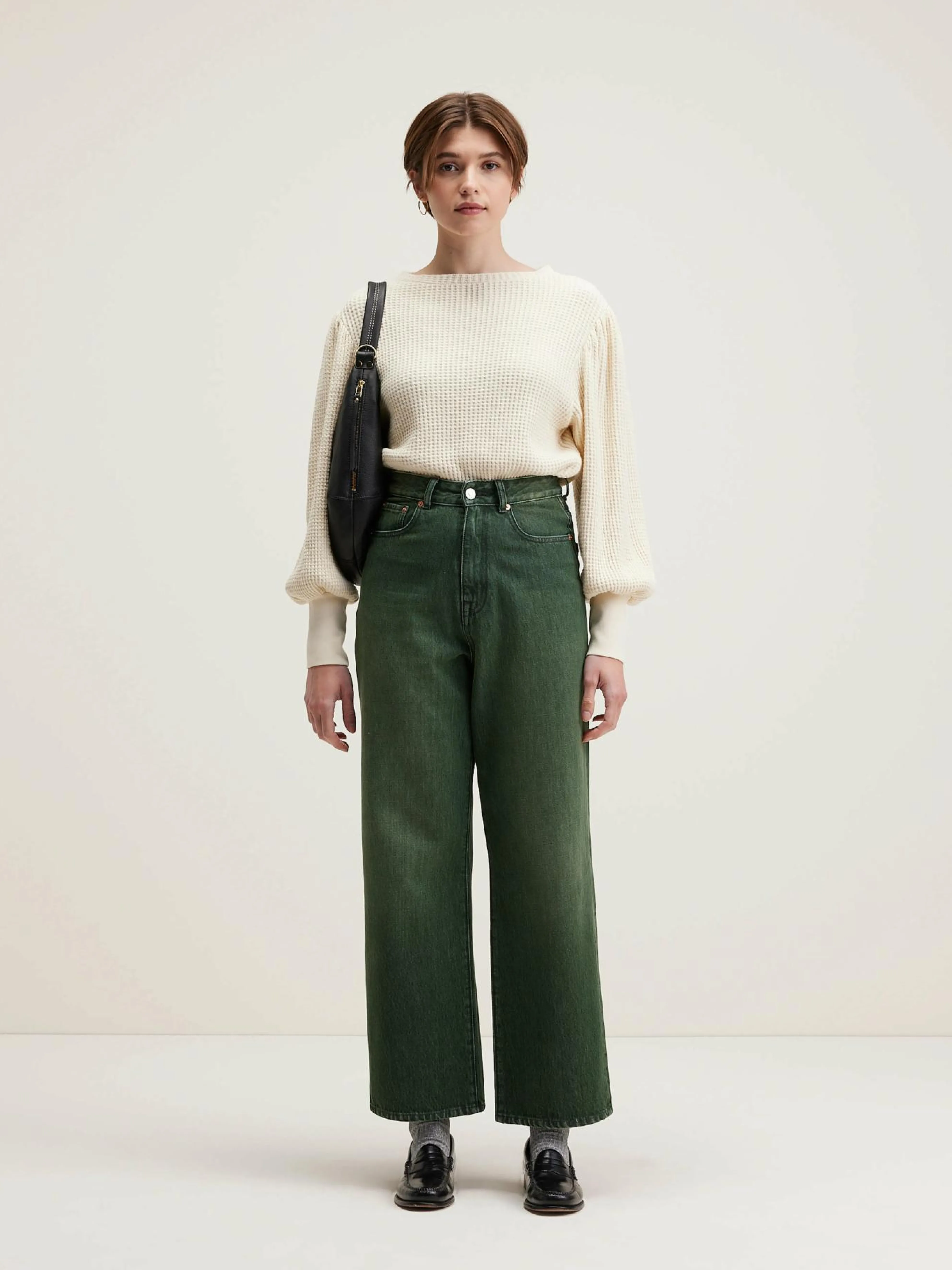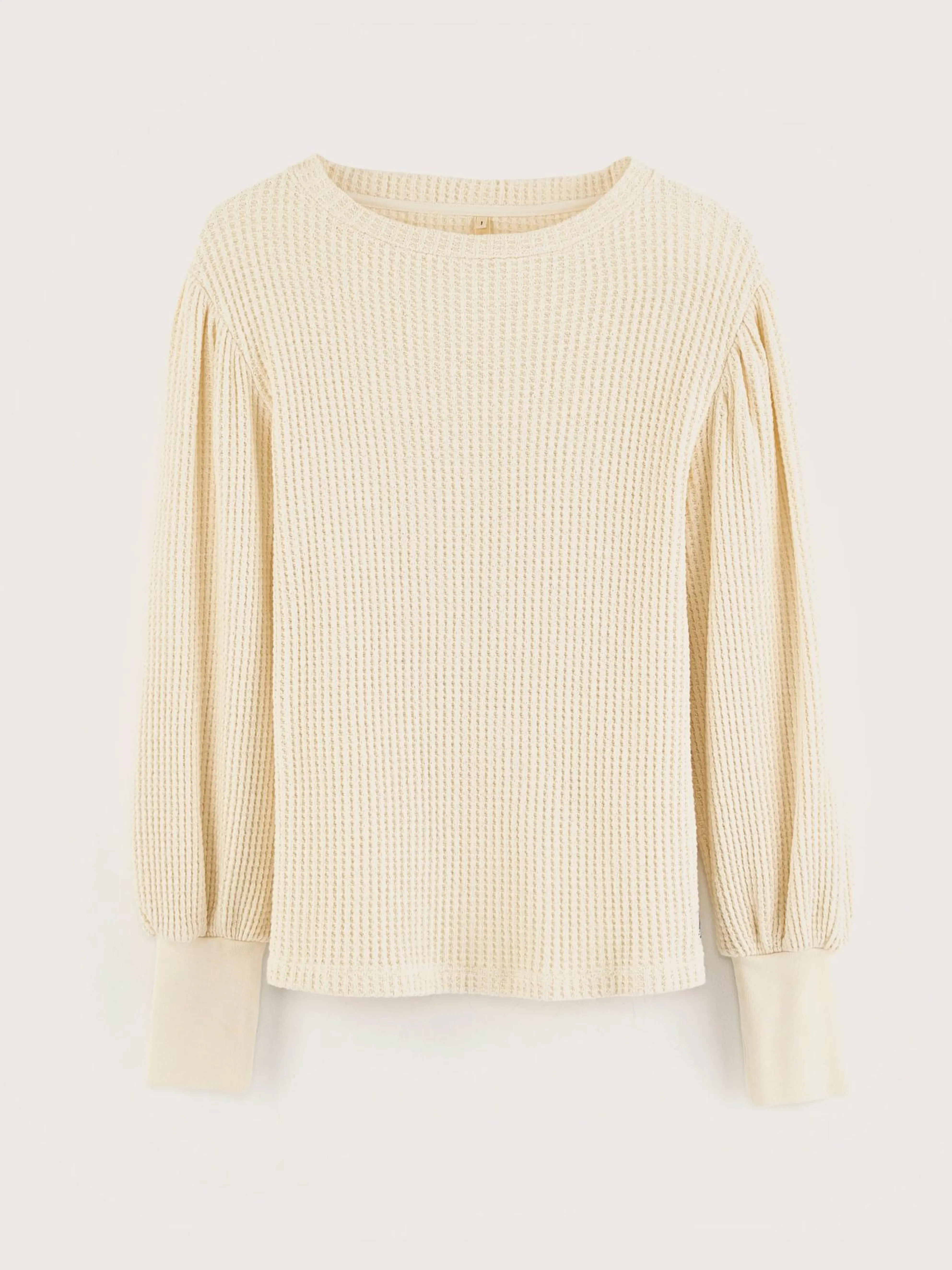 Gewafeld t-shirt met lange pofmouwen, van crèmekleurig katoen.