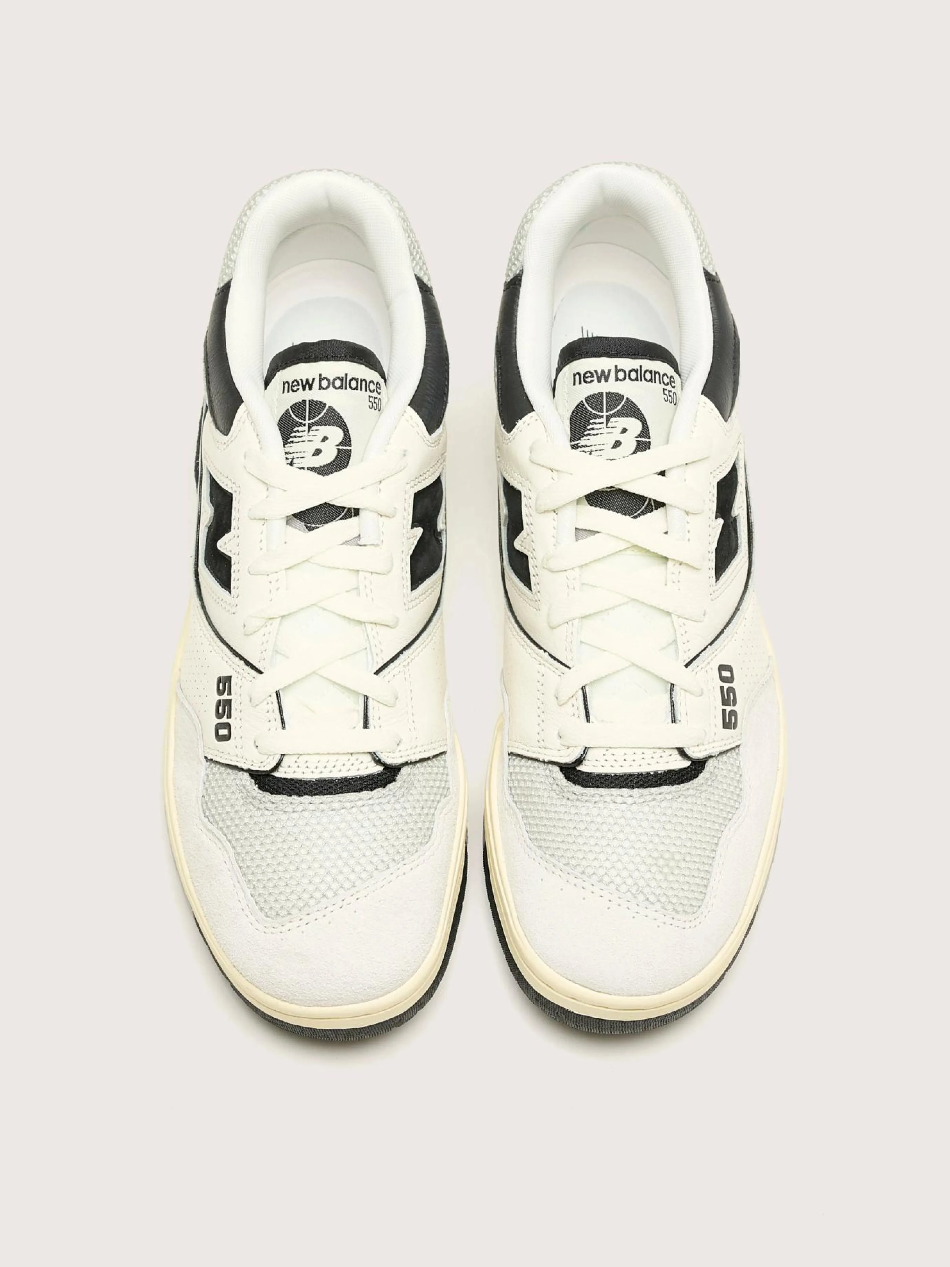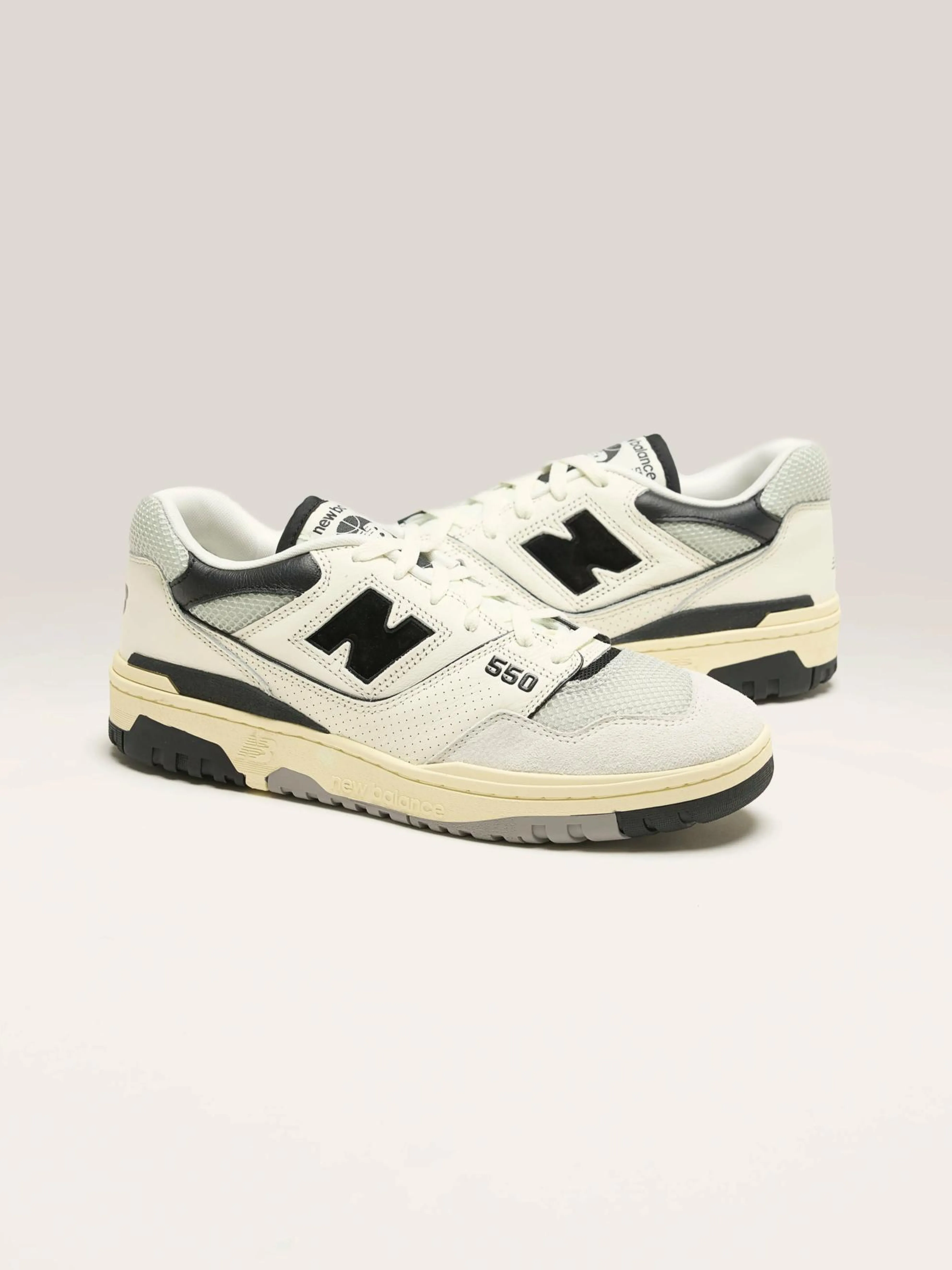 De New Balance 550 low-top alledaagse sneakers hebben een bovenwerk van leder, synthetisch suède, en mesh.