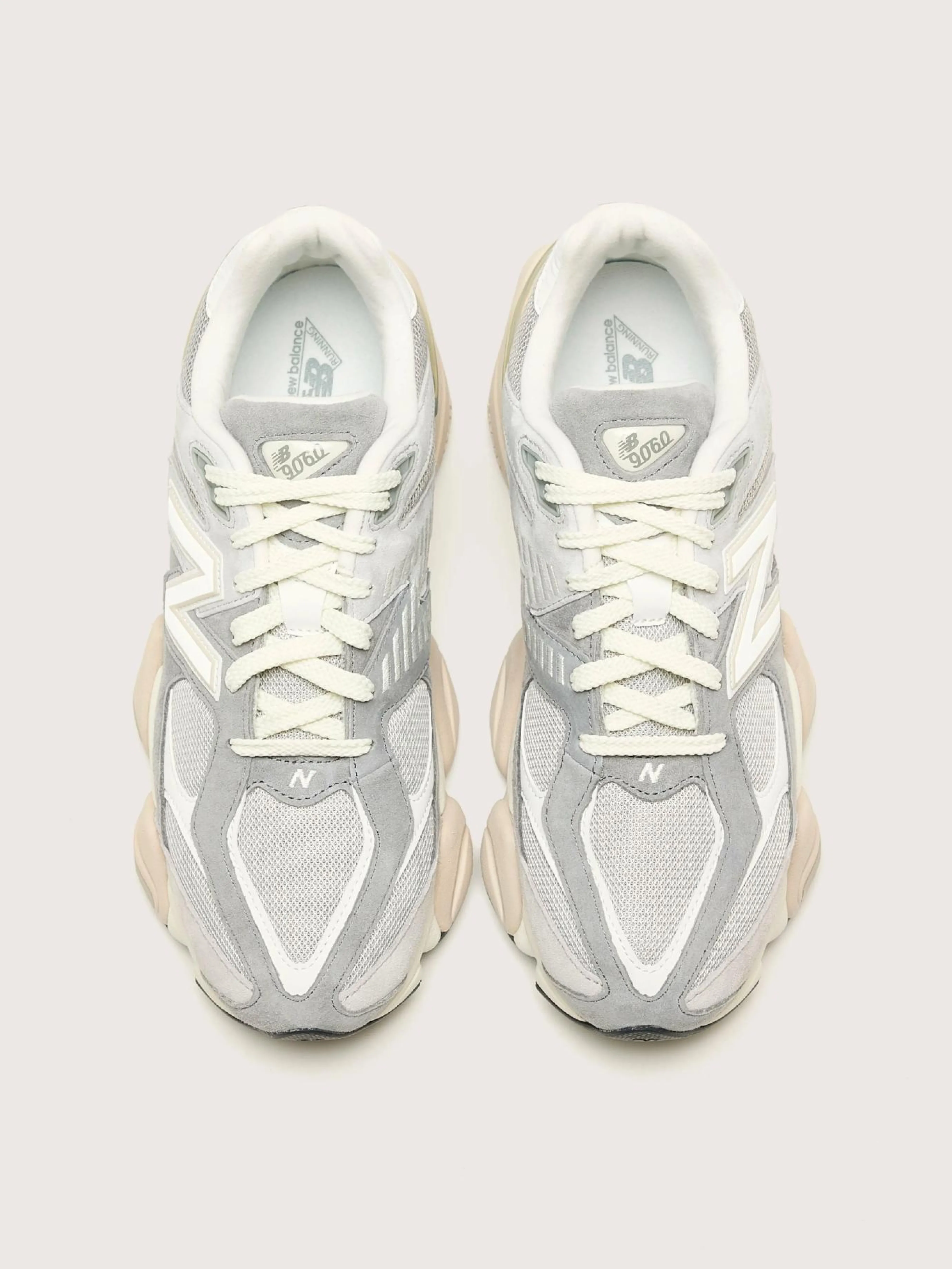 De New Balance 9060 sneakers hebben een technisch bovenwerk van leder, suède en mesh, een dempende middenzool en een buitenzool met een diamanten patroon..