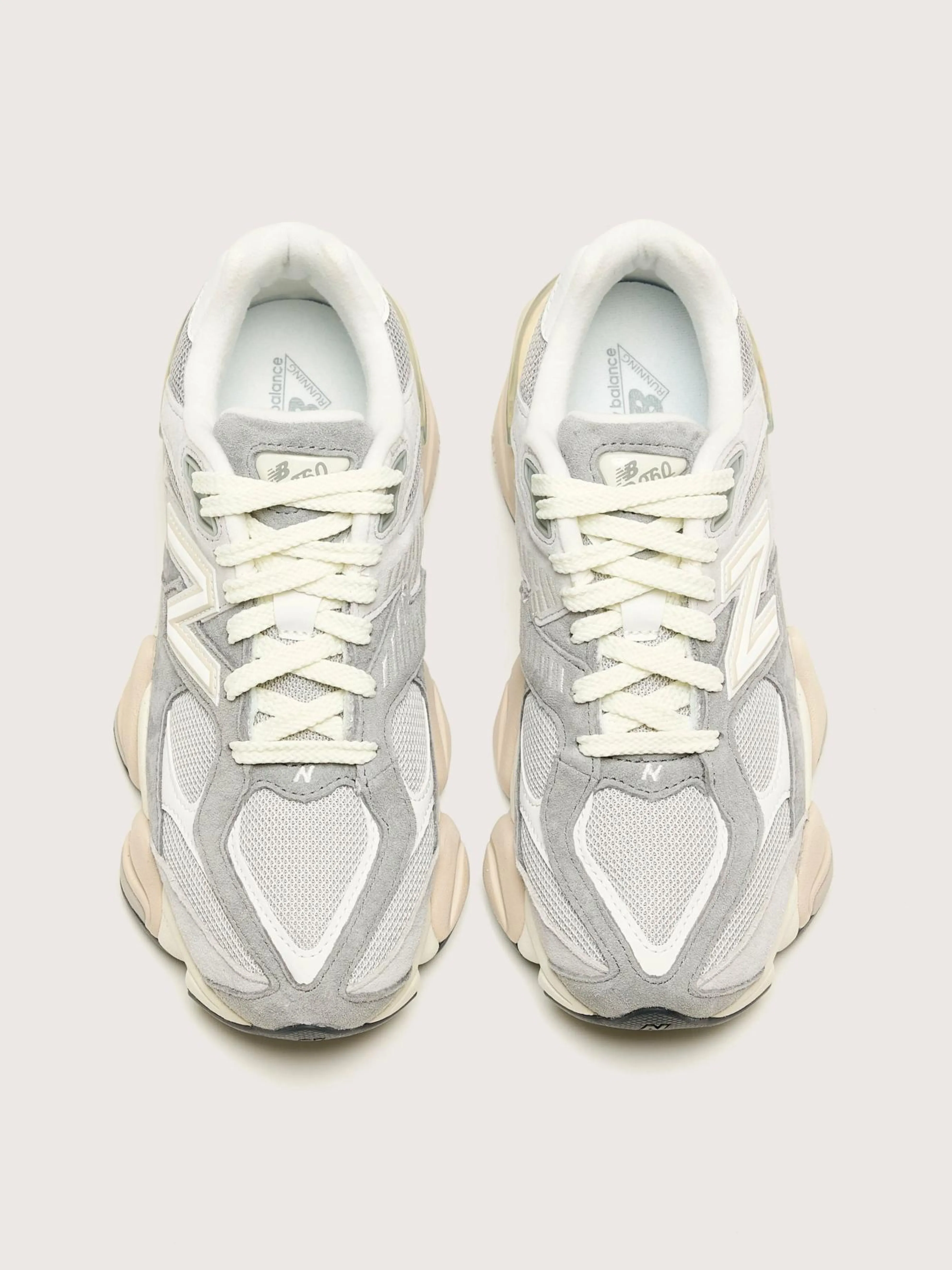 De New Balance 9060 sneakers hebben een technisch bovenwerk van leder, suède en mesh, een dempende middenzool en een buitenzool met een diamanten patroon.