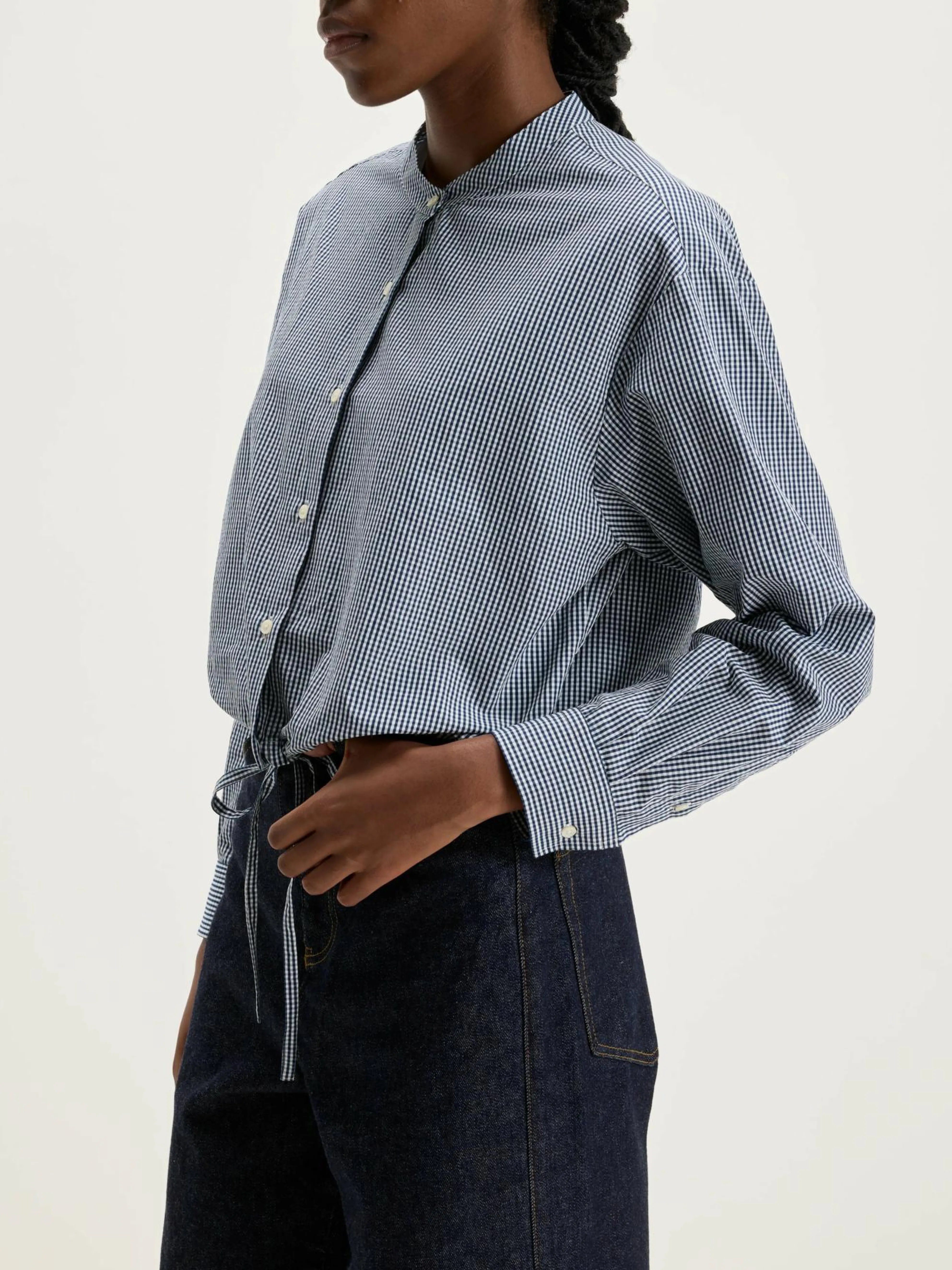 De Lucy blouse van het Japanse luxemerk Nicholson & Nicholson heeft een veelzijdige, relaxte pasvorm met een drawstring in de cropped zoom.