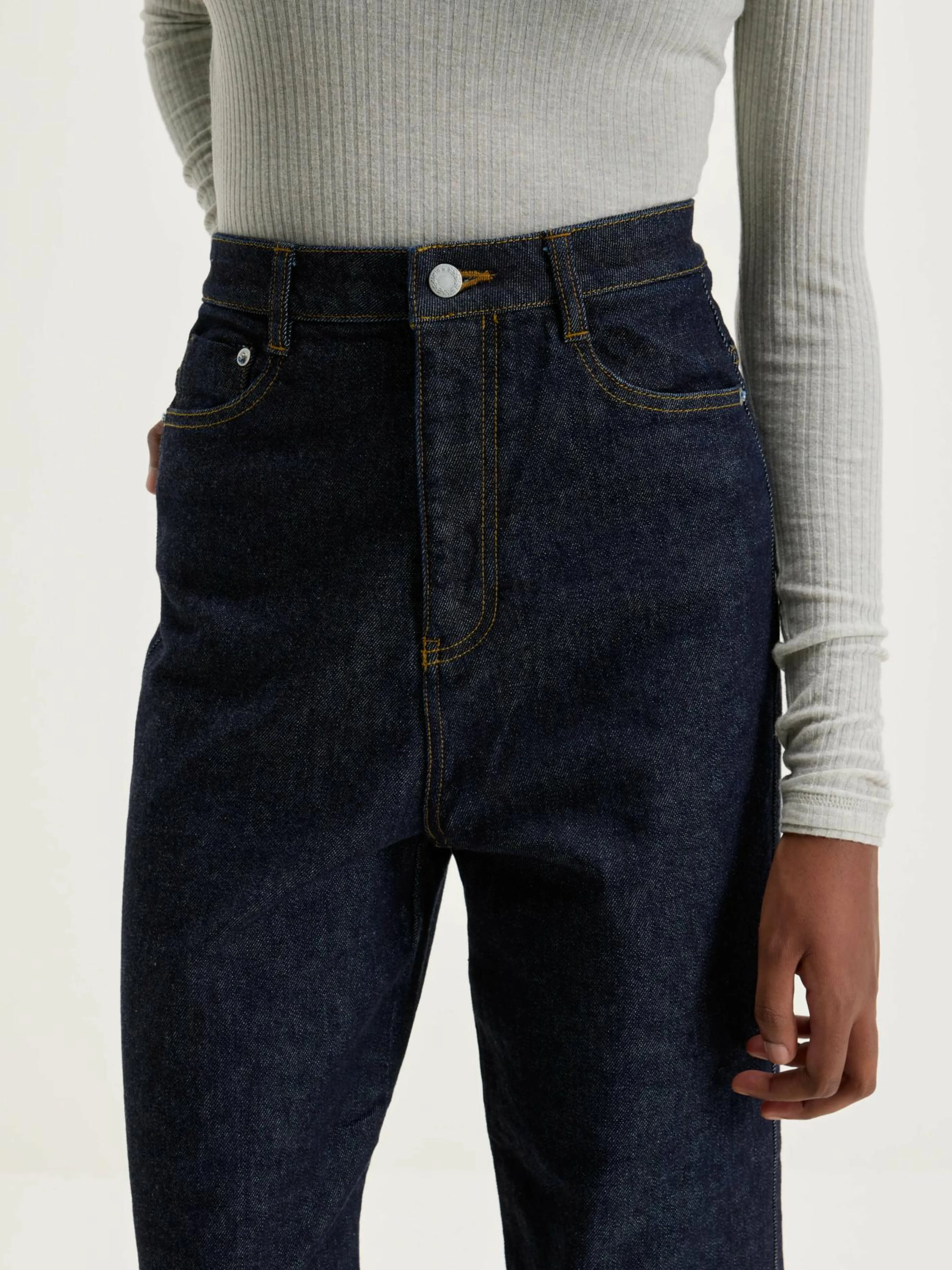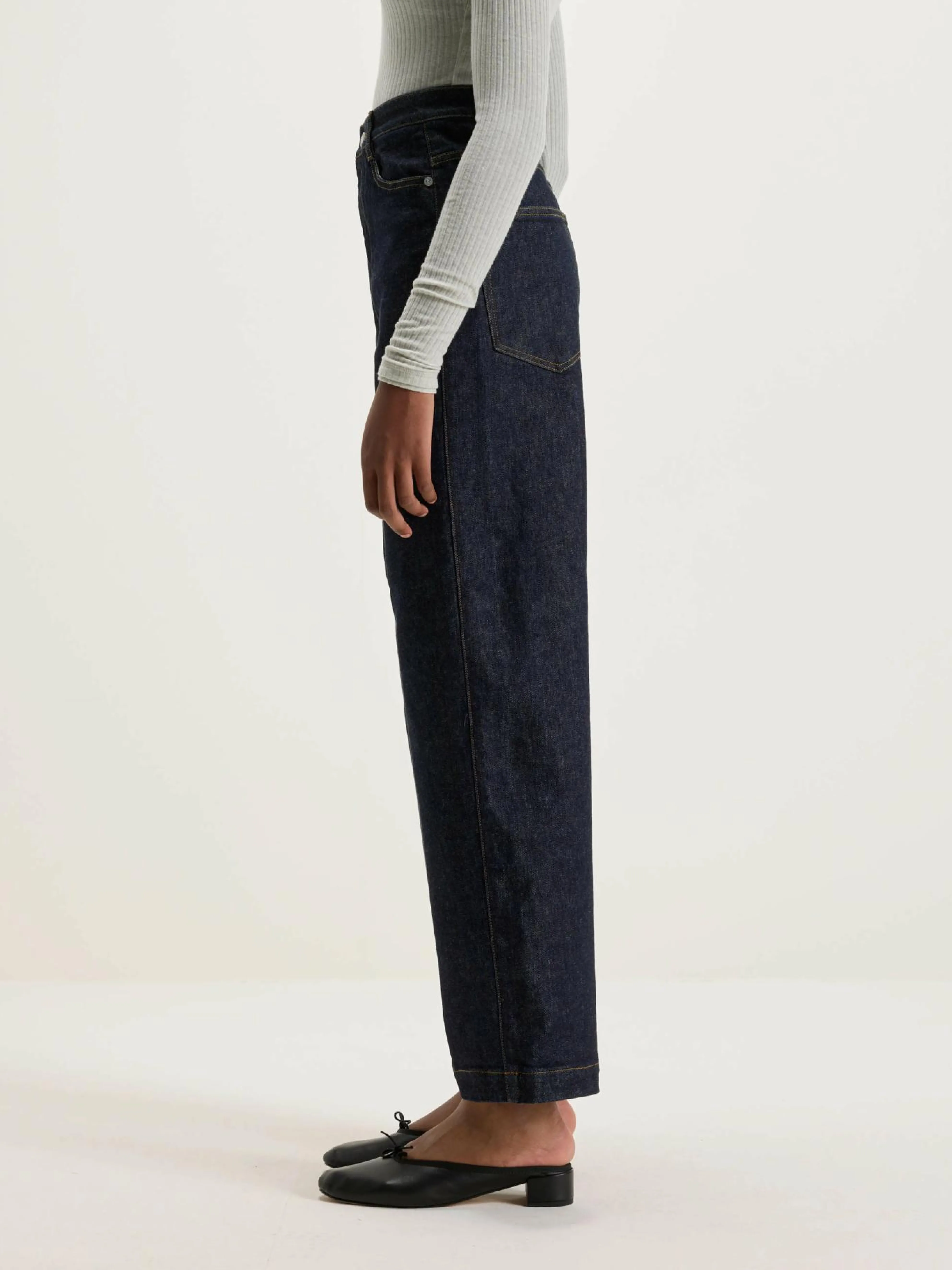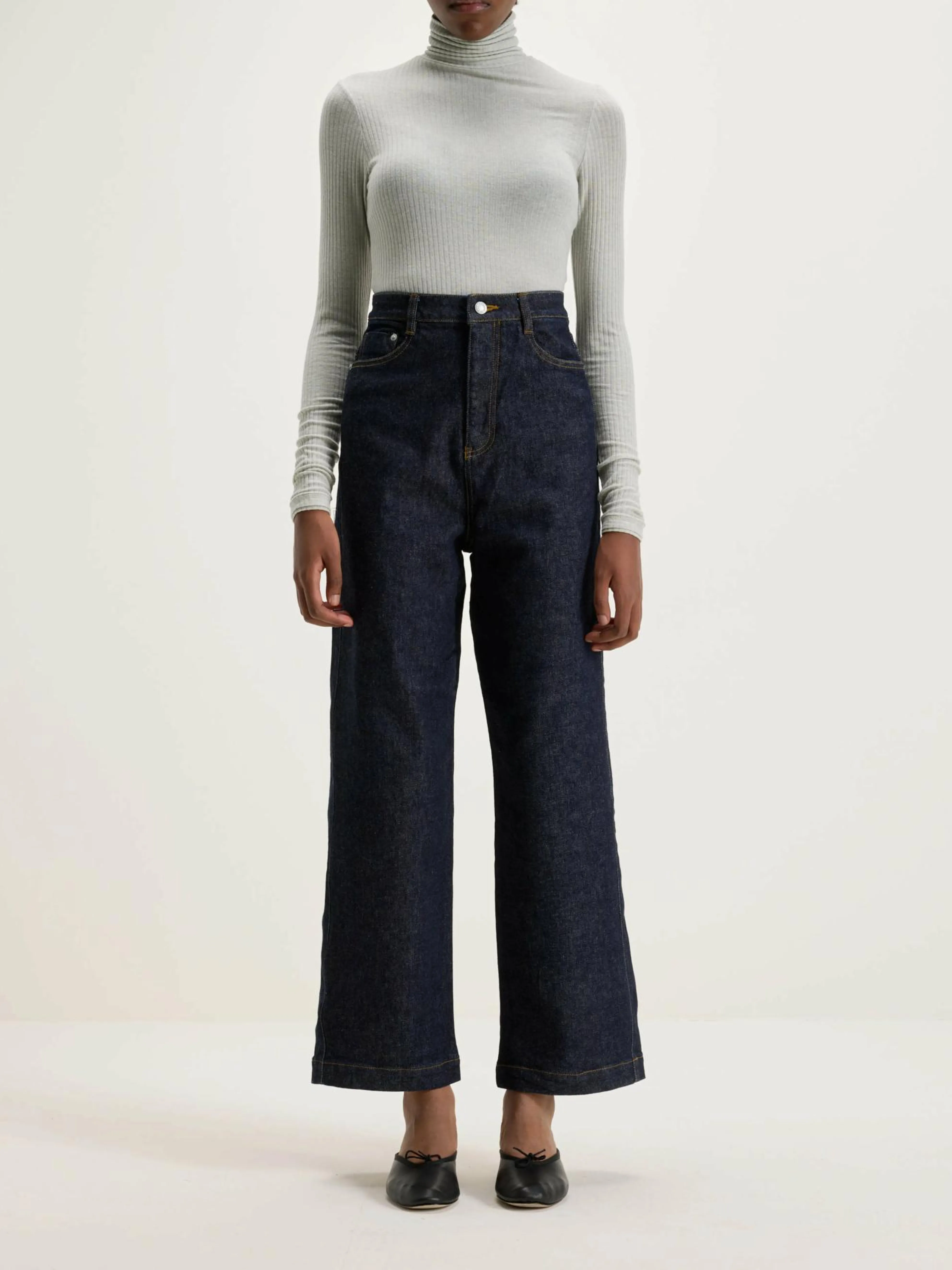 De Sophia Japanese Denim van het Japanse luxemerk Nicholson & Nicholson heeft een wijd, flared silhouet.