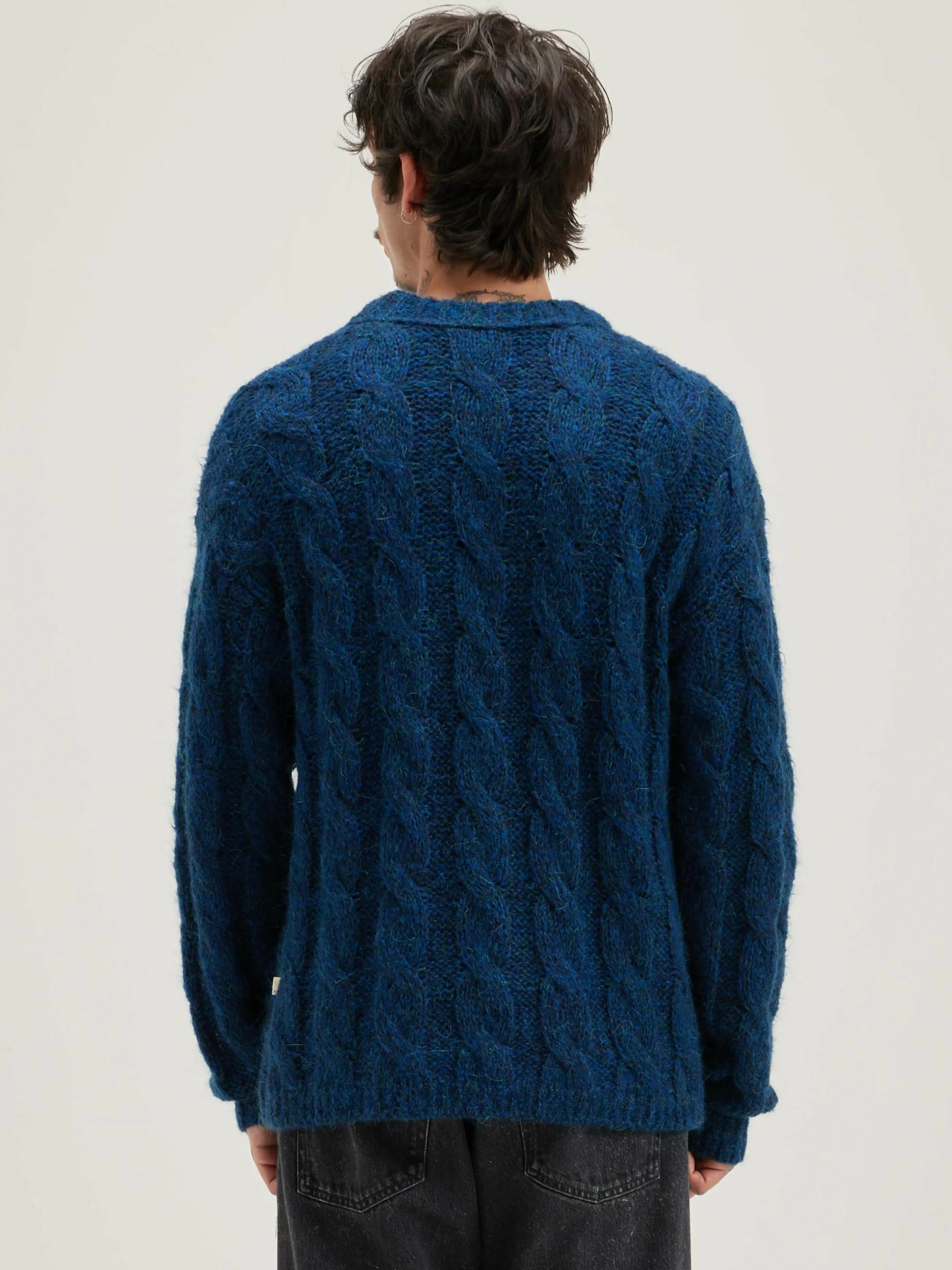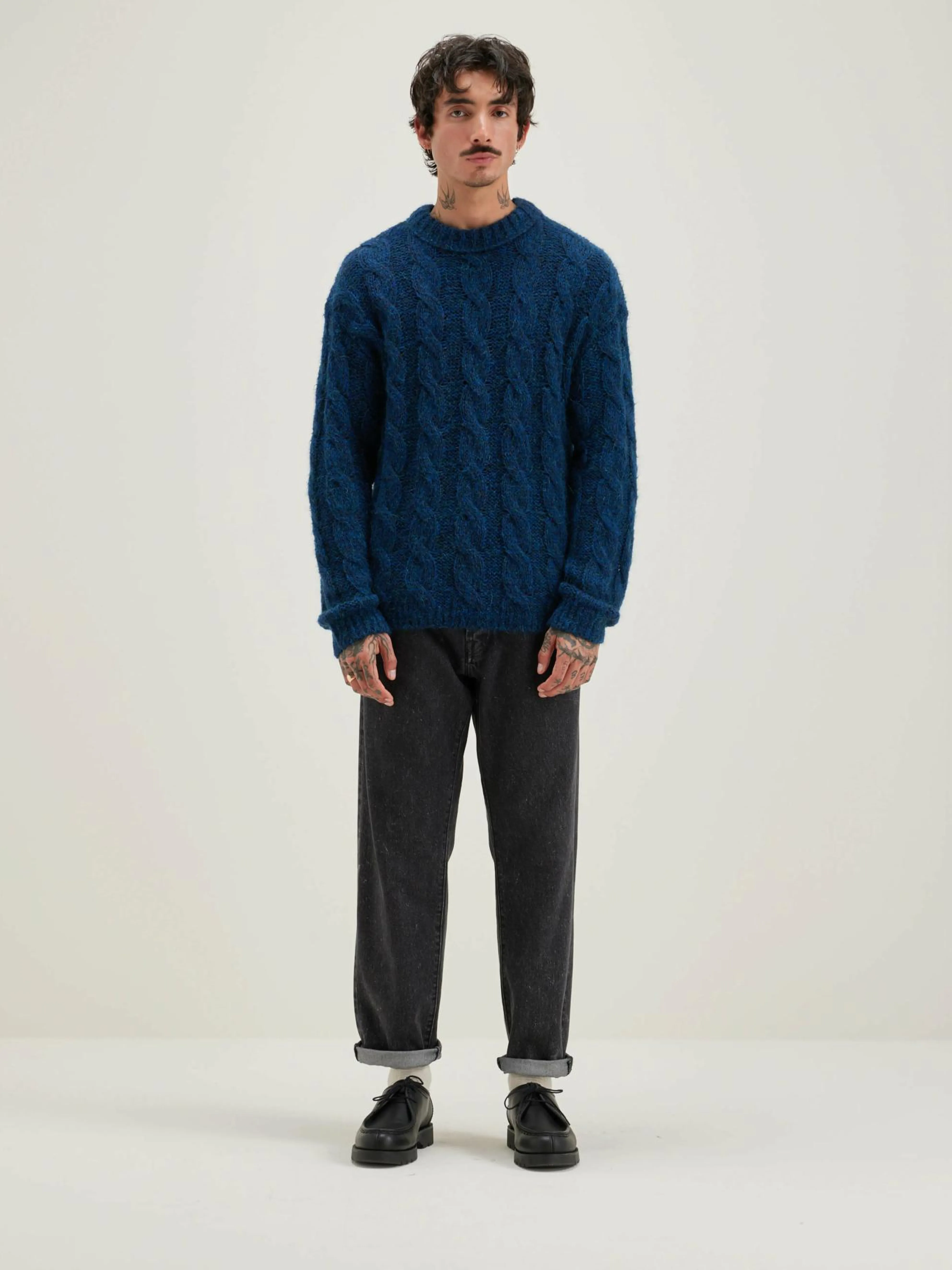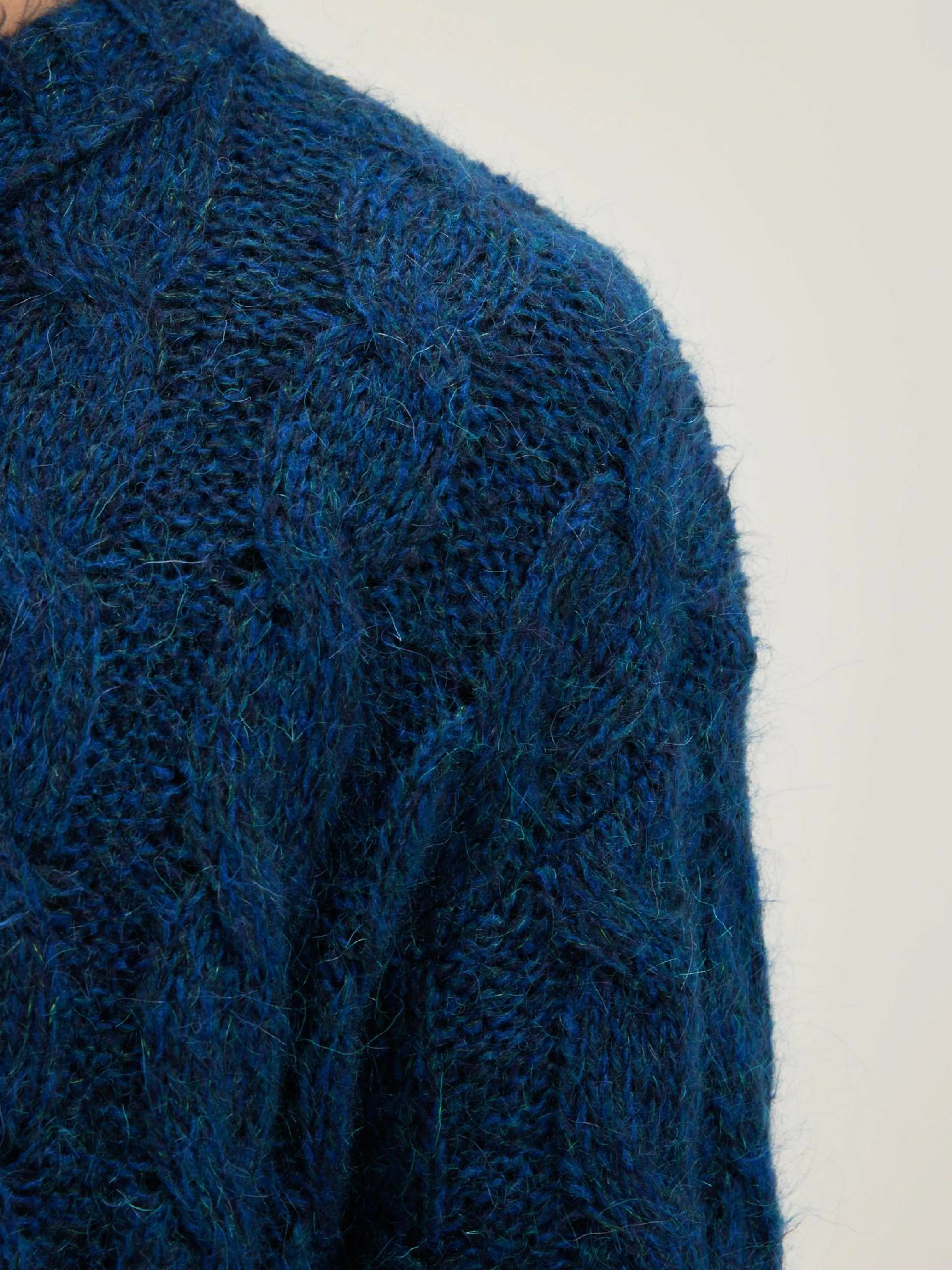 Klassieke, heideblauwe kabeltrui met mock neck.