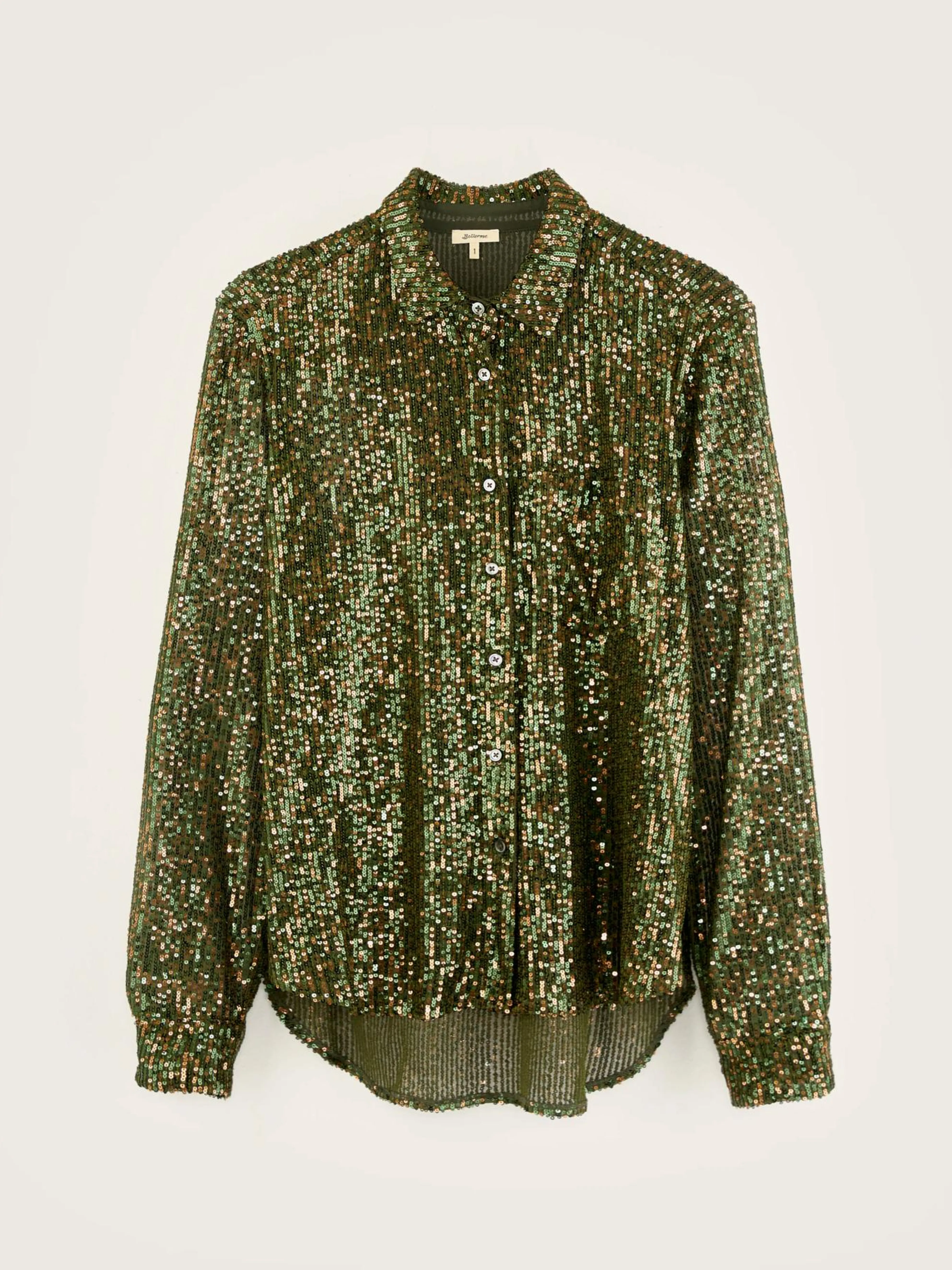 Lang hemd met een kraag en een recht model, volledig bezet met fonkelende mosgroene lovertjes.