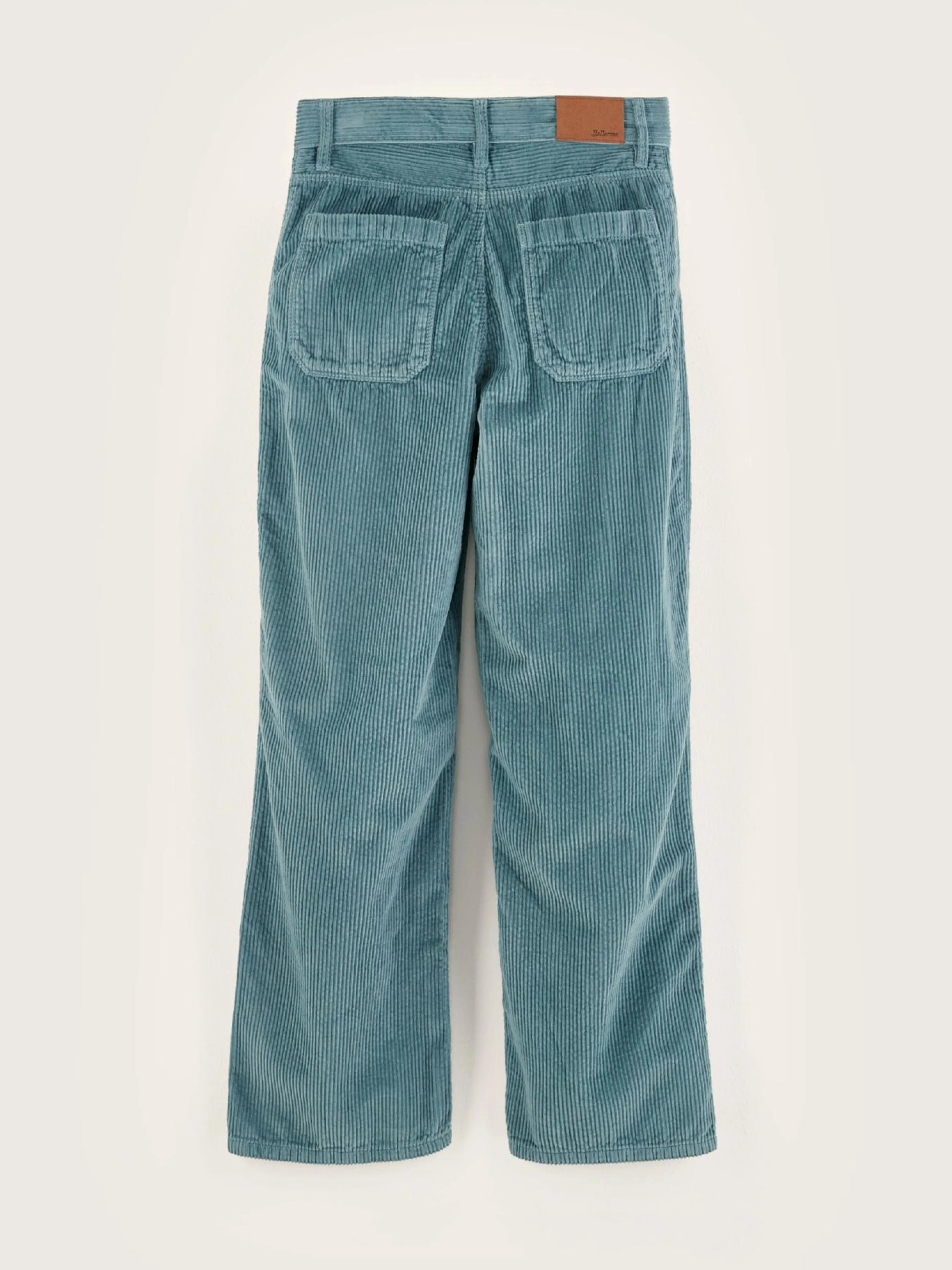 Metaalblauwe broek met hoge taille en wijde pijpen, van corduroy katoen.