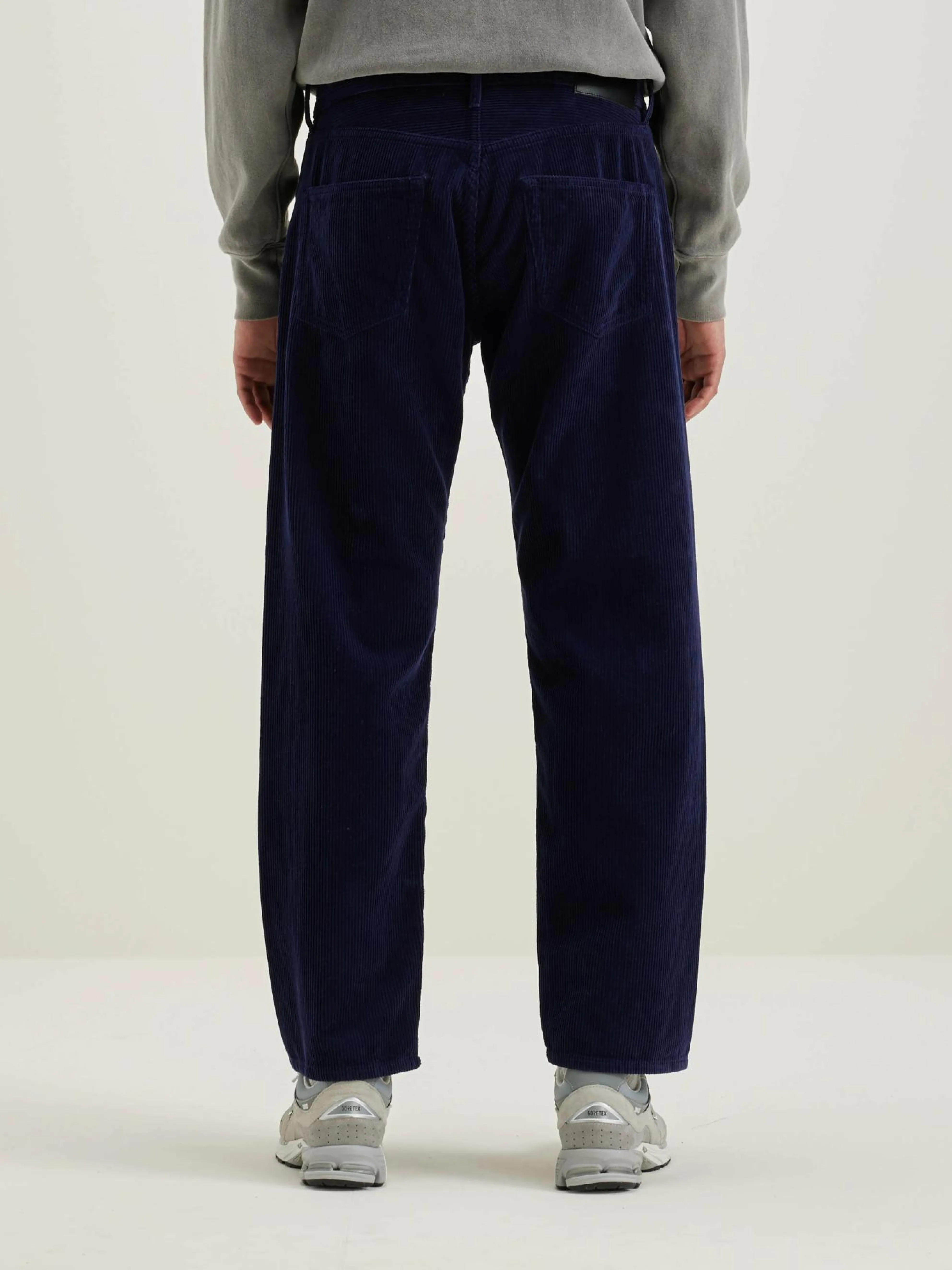 “Dad-style” broek met lage taille en rechte pijpen, in five-pocket uitvoering, van inktblauw corduroy katoen.