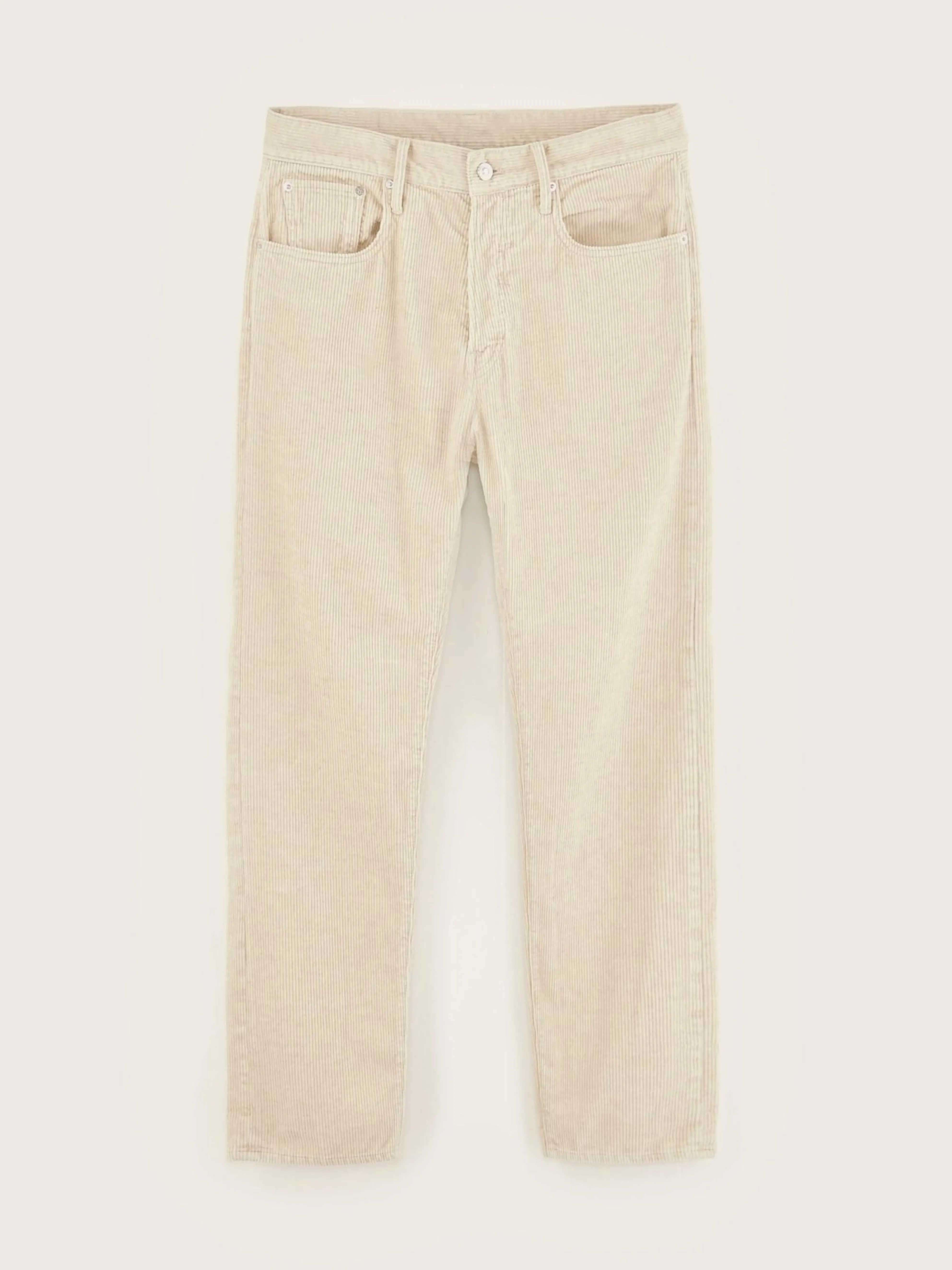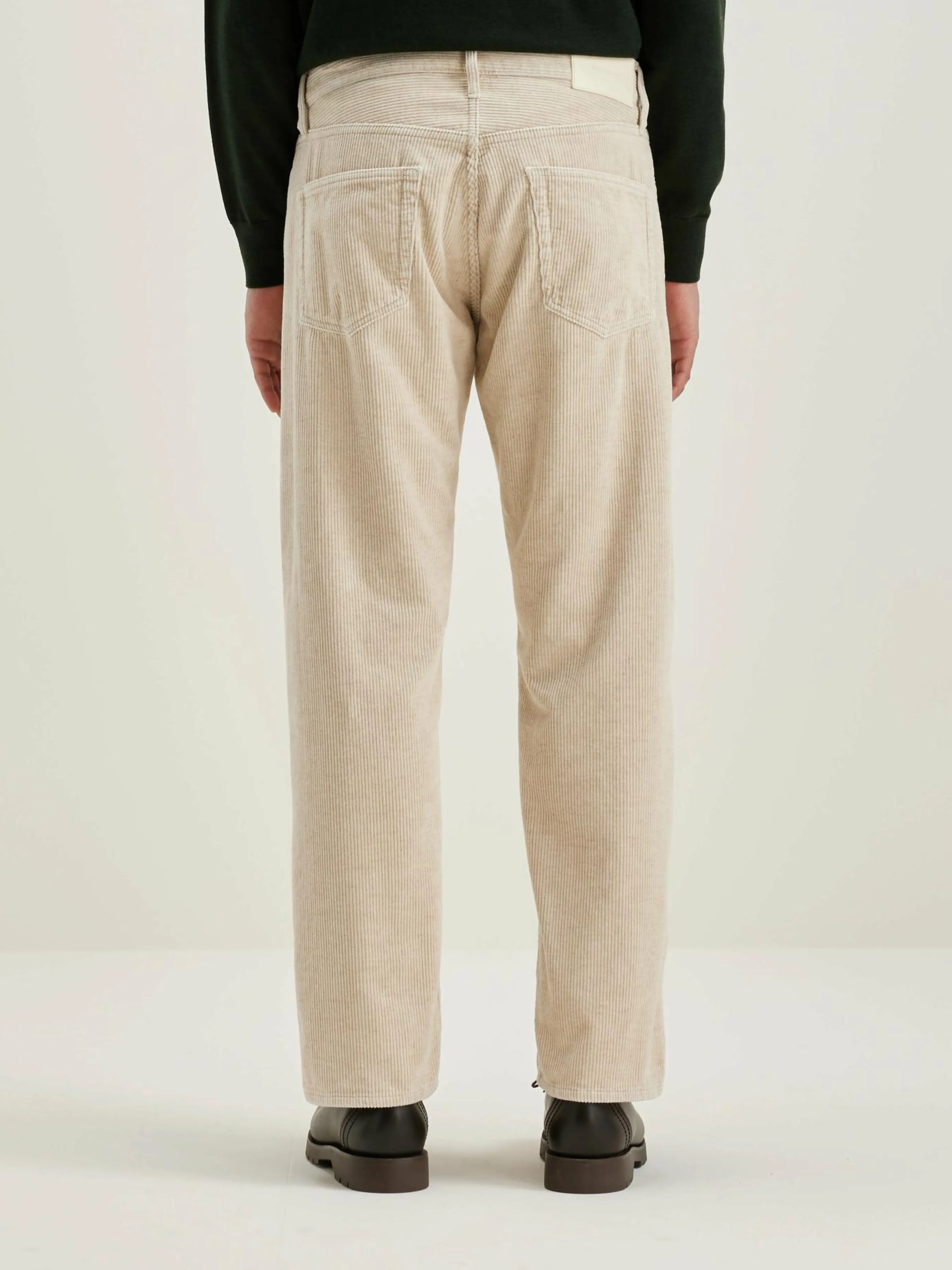 “Dad-style” broek met lage taille en rechte pijpen, in five-pocket uitvoering, van kalkkleurig katoen en linnen corduroy.