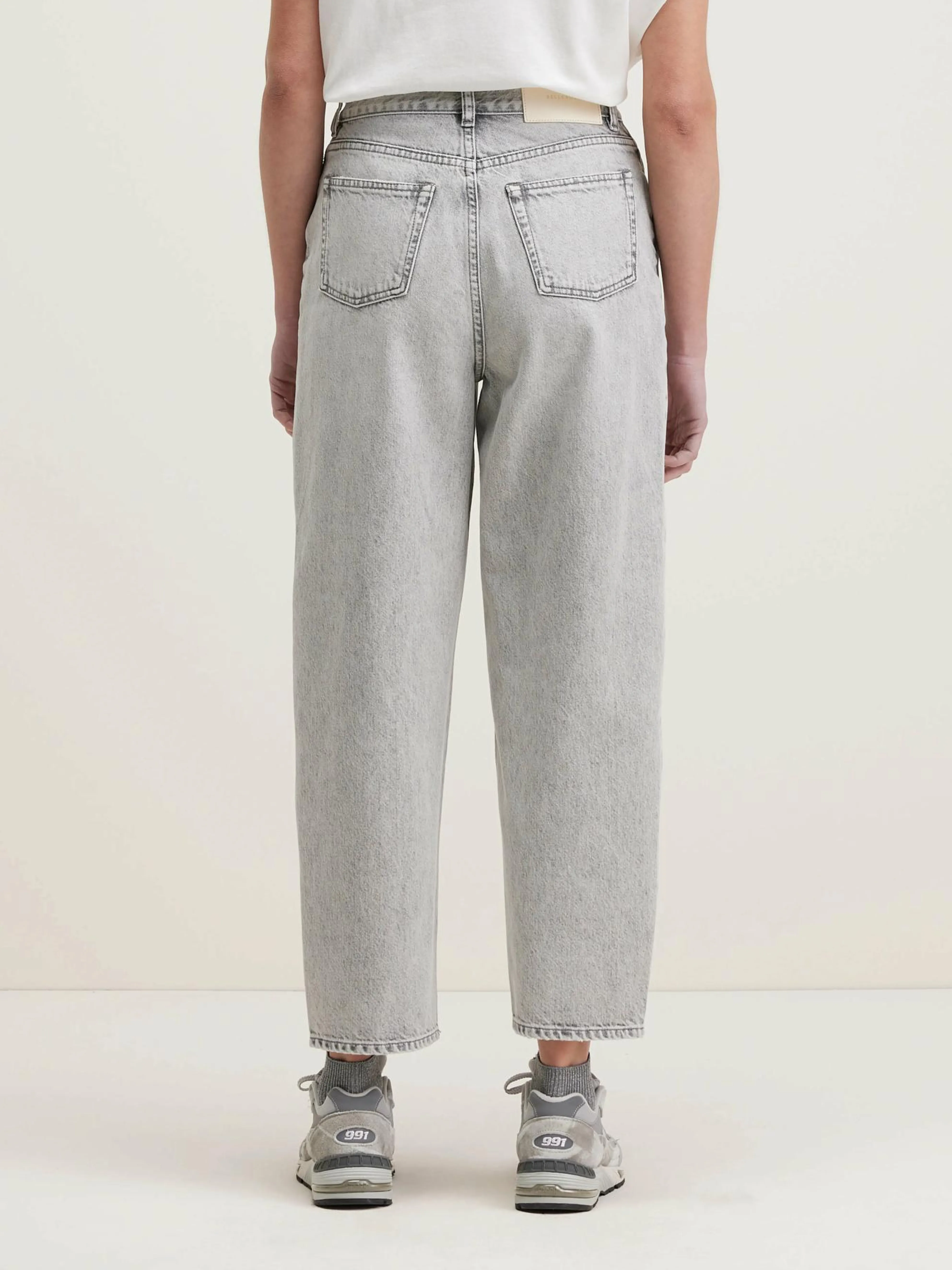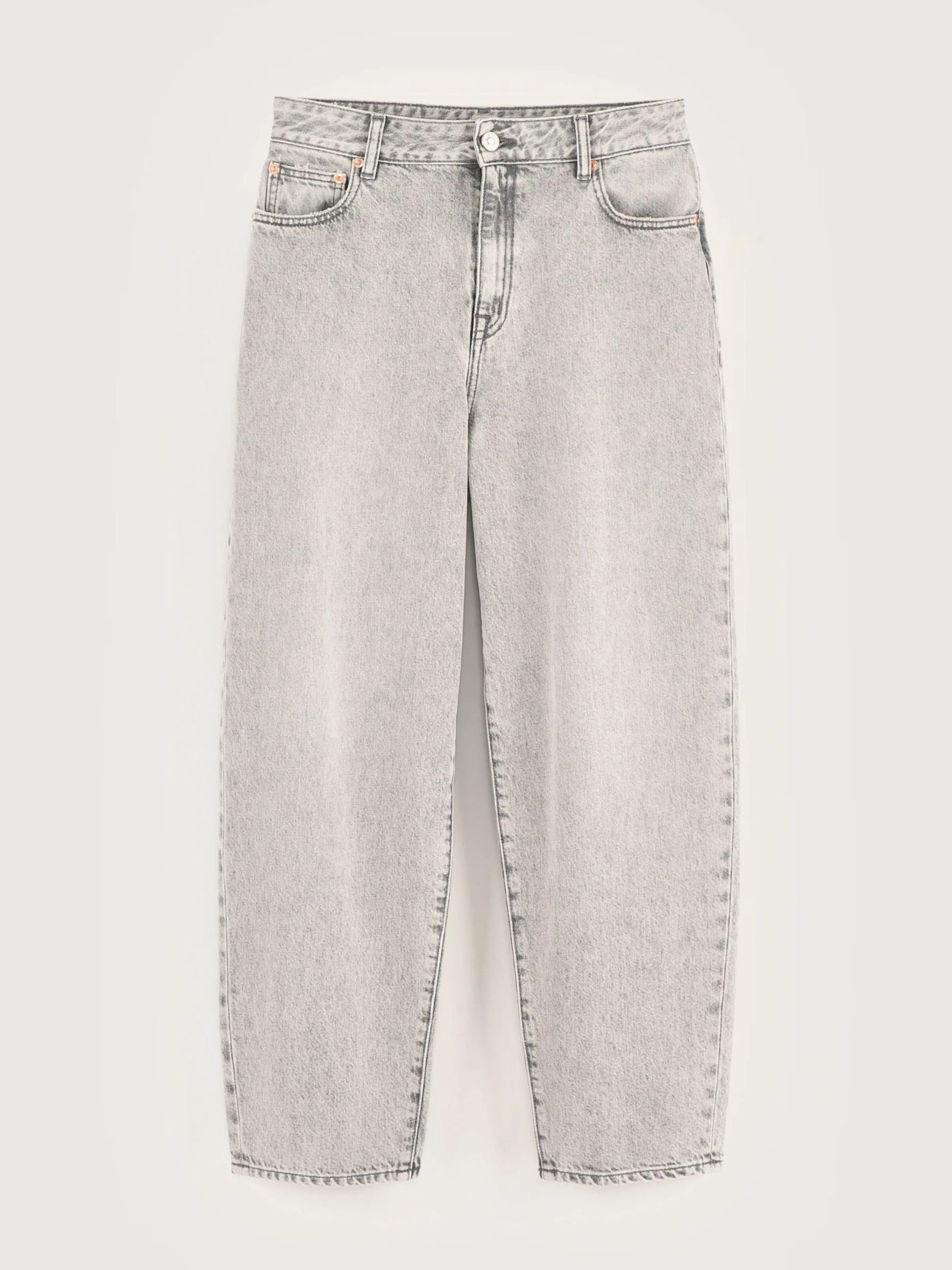 High-waist, mom jeans met pofpijpen van versleten grijs denim.