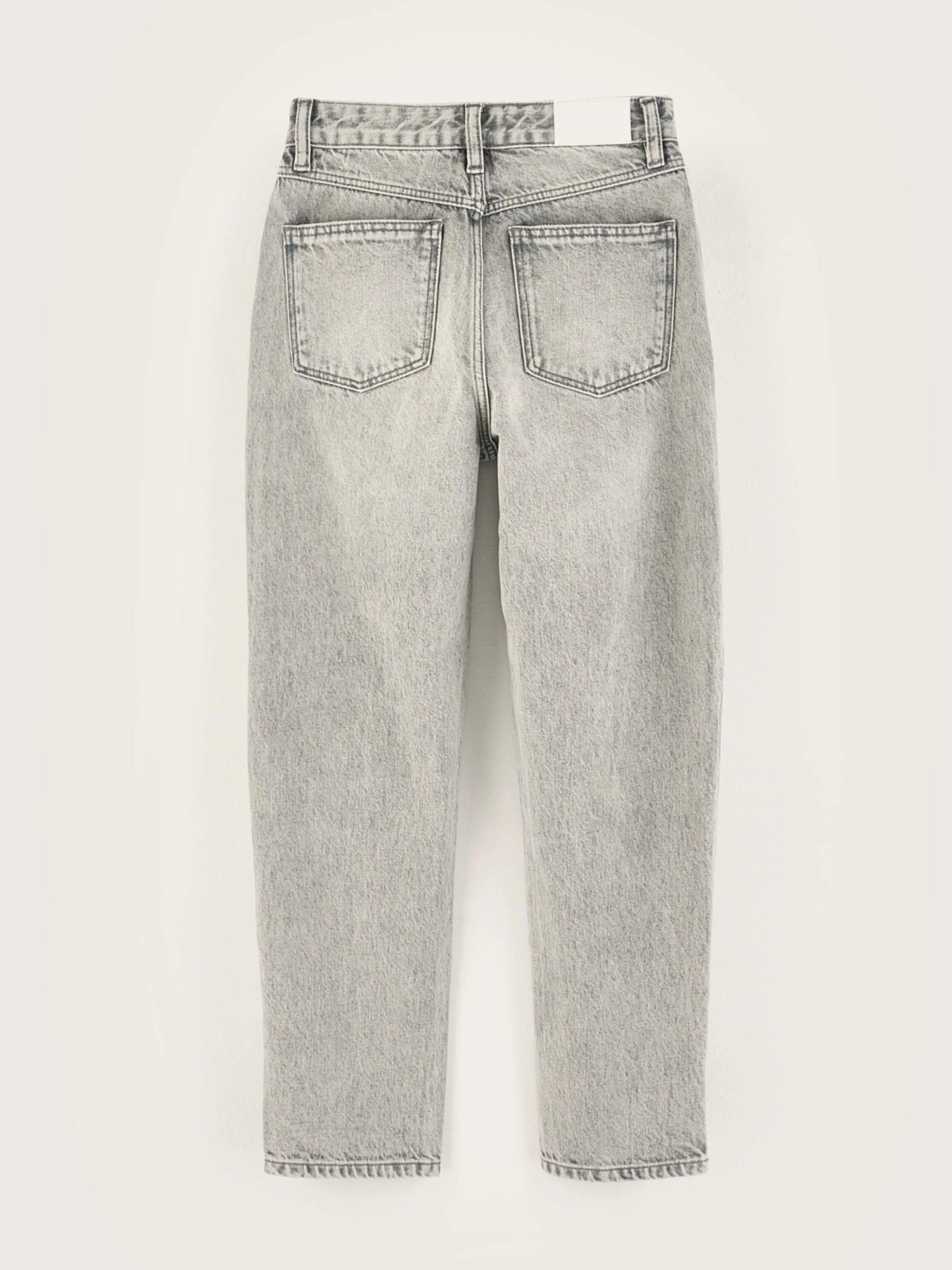 Hoge taille grijze jeans met taps toelopende pijpen en een versleten look.