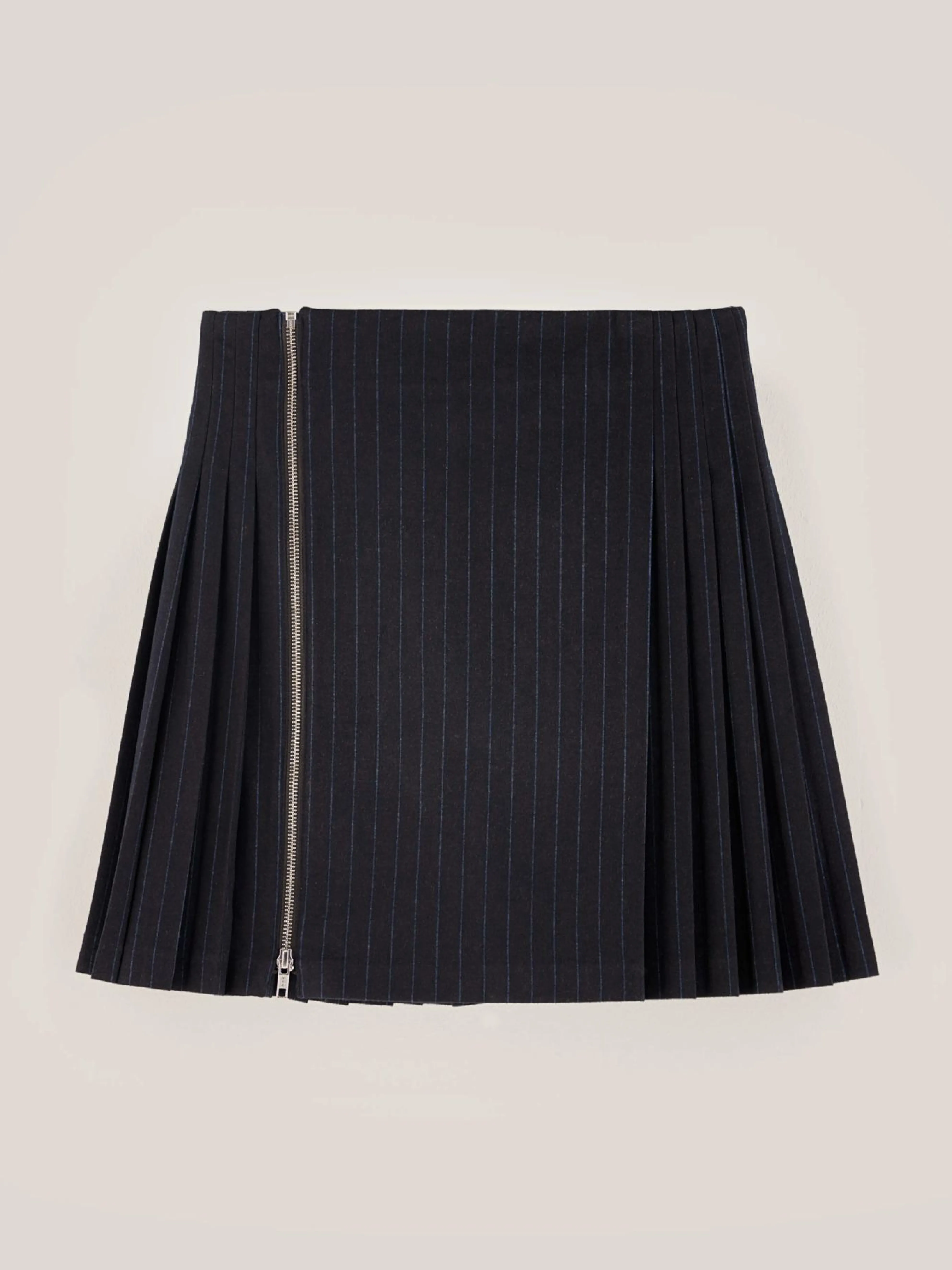 Plooirok met ritssluiting vooraan, van flanel met krijtstreep.