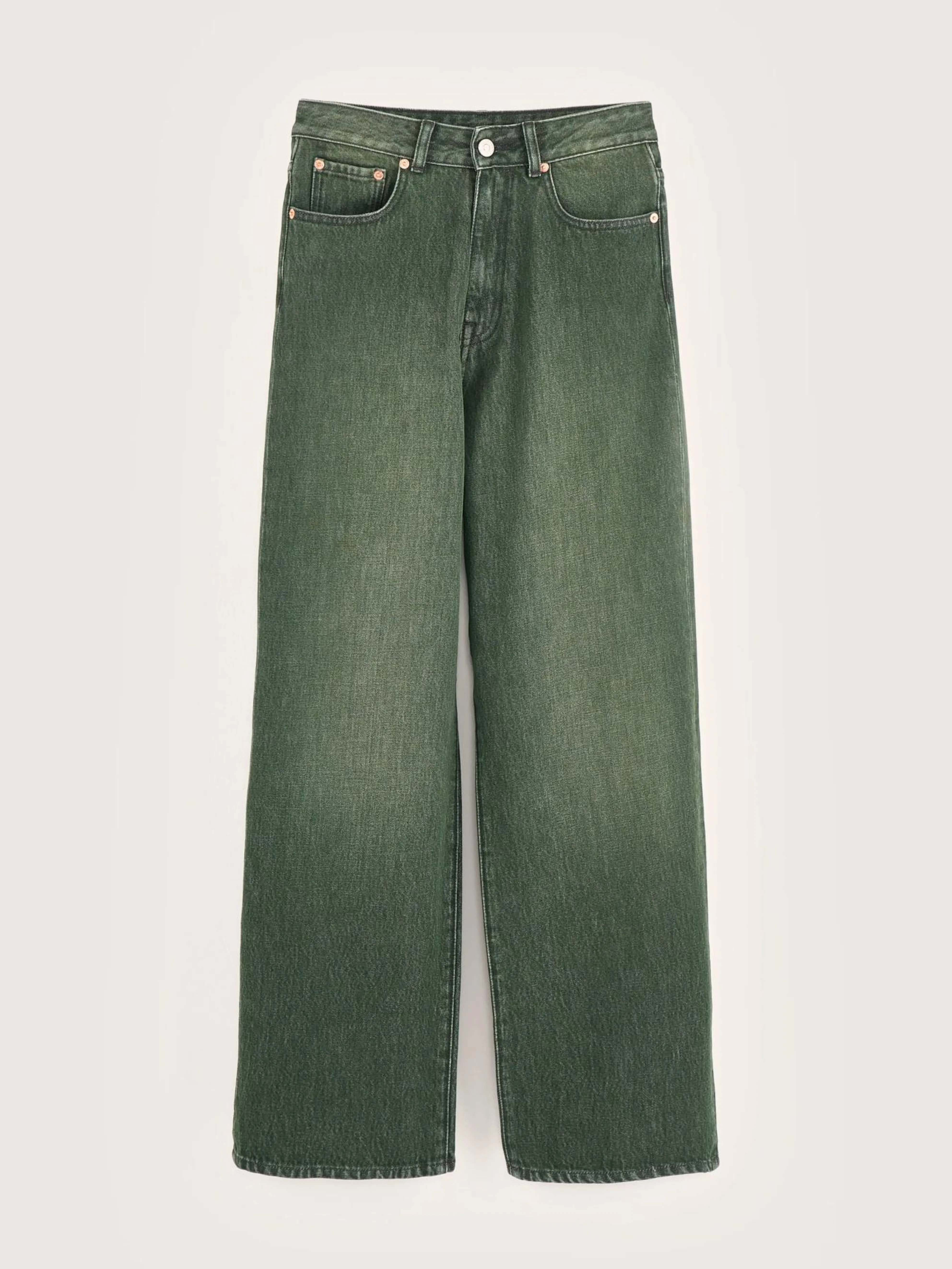 Wijde pijpen, superhoge taille, jeans van groen katoendenim met vijf zakken.
