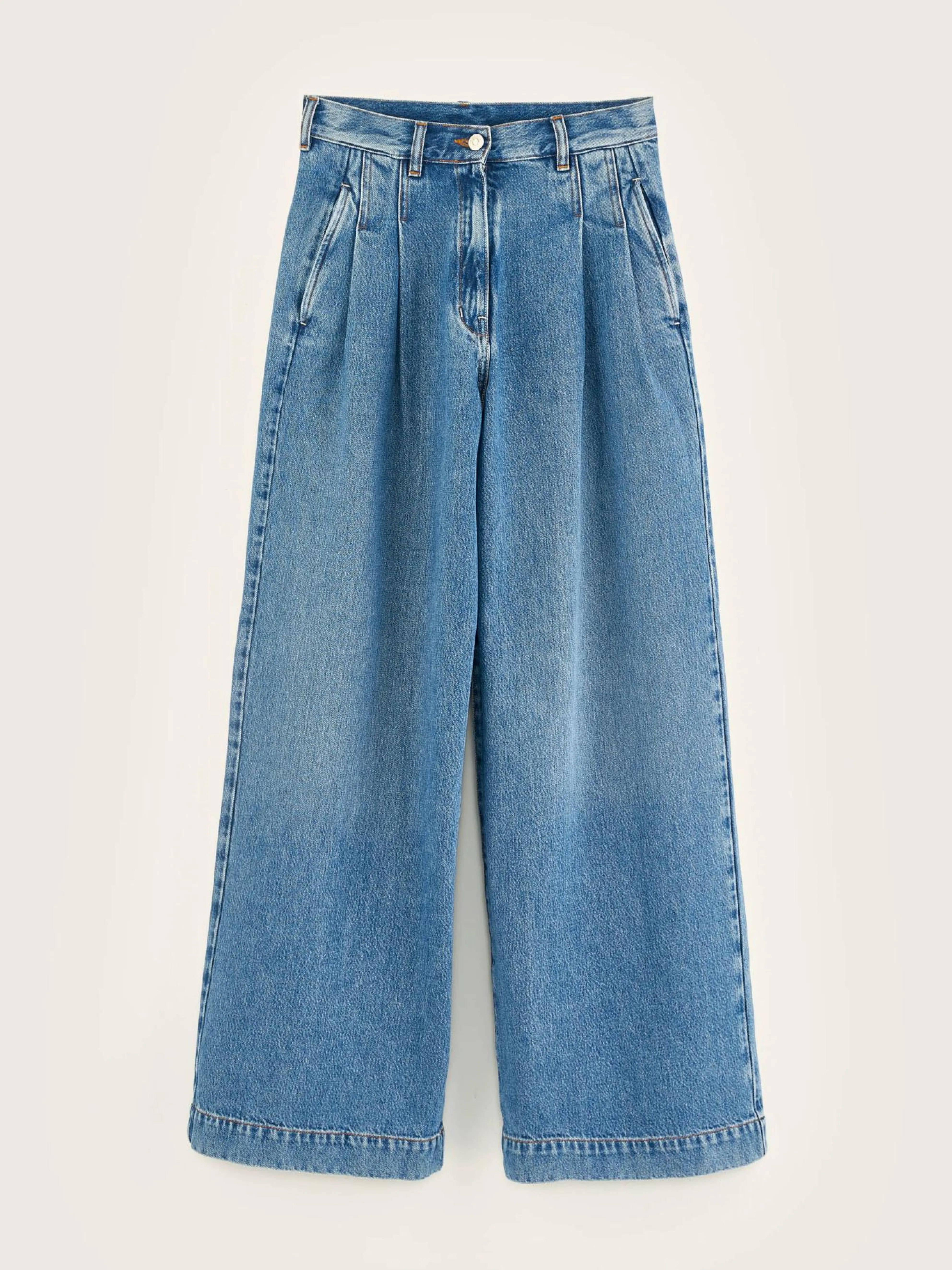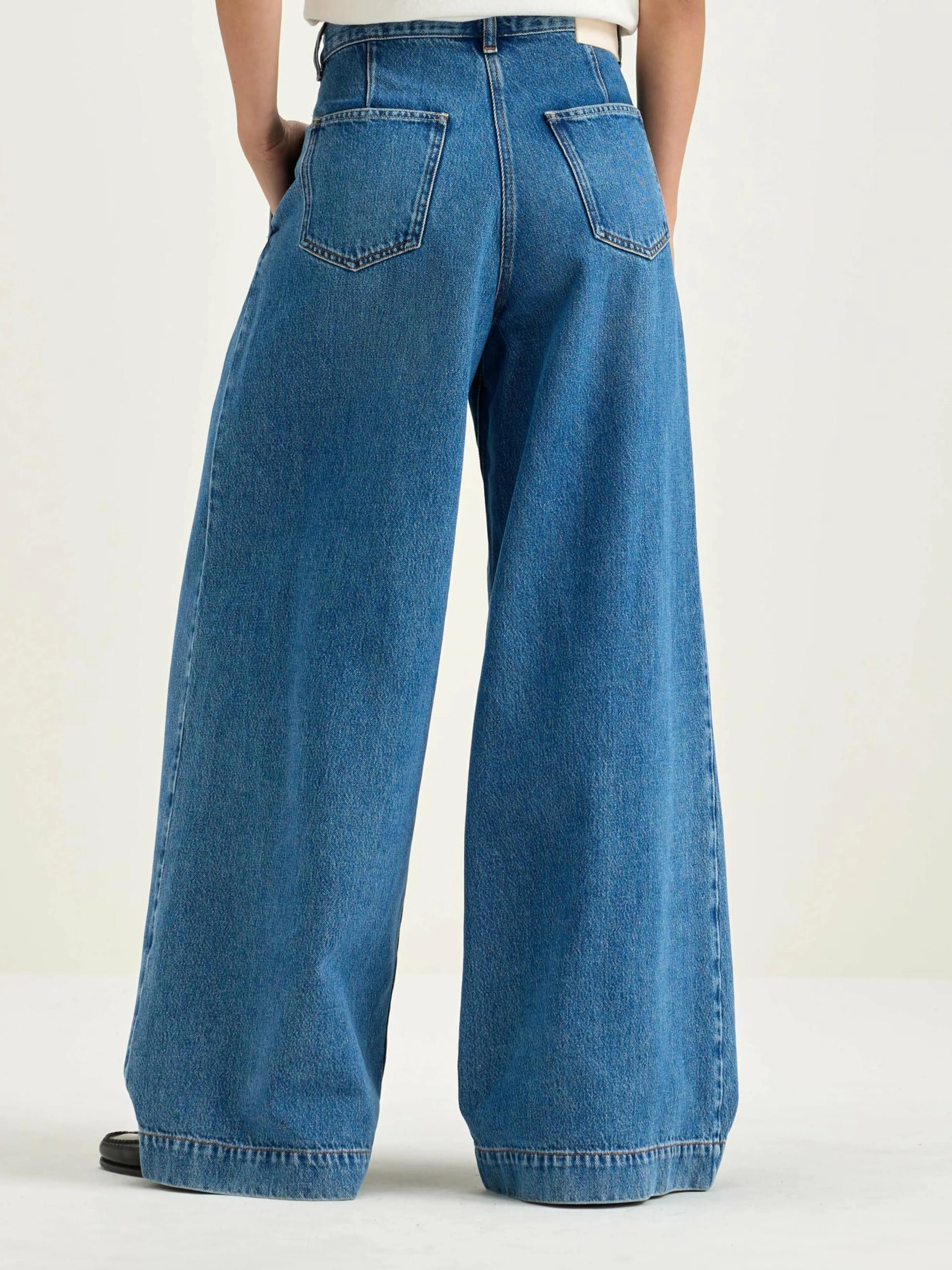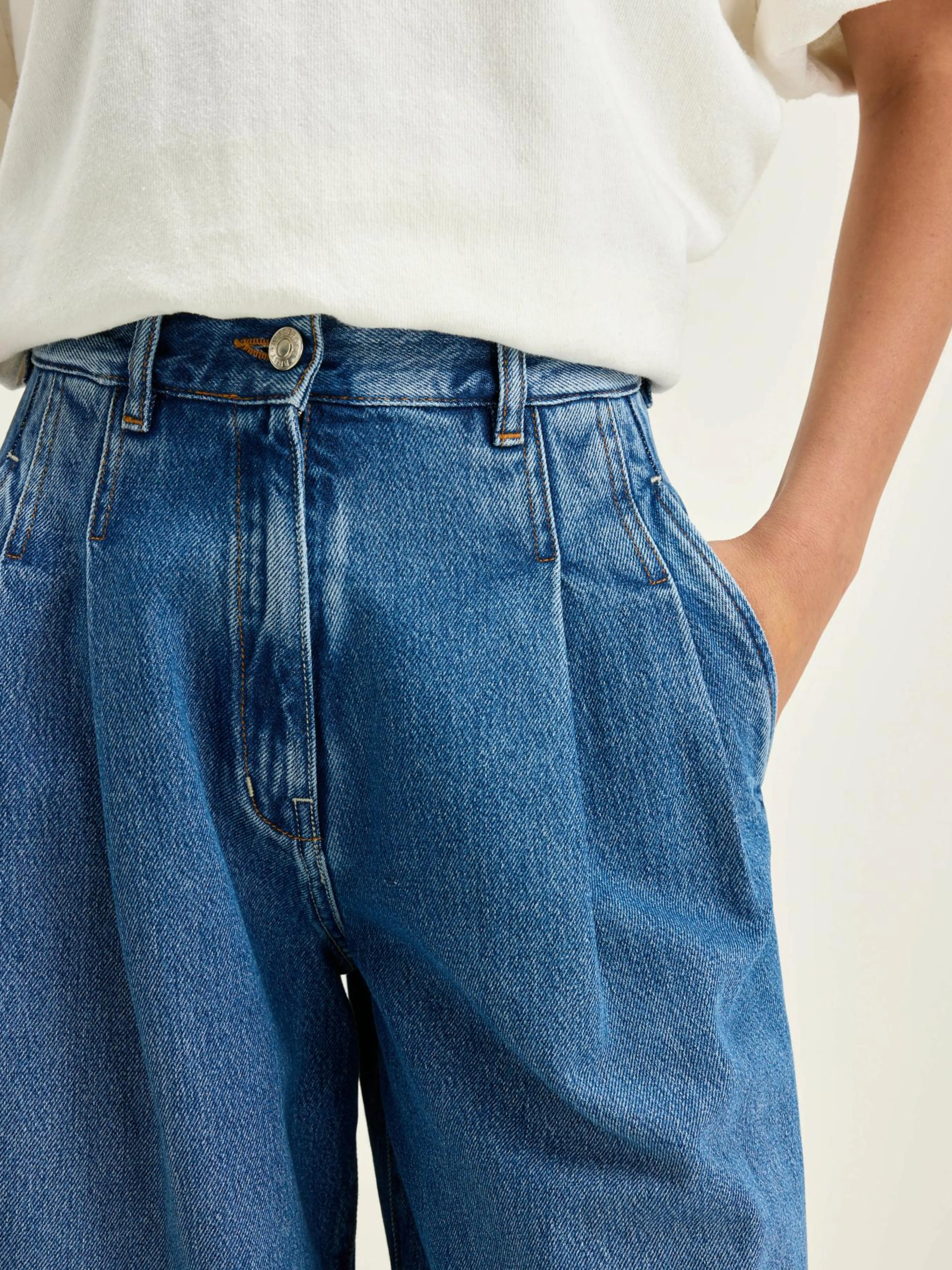 Geplooide high-waist jeans met superwijde pijpen, van stonewashed blauw denim met versleten look.