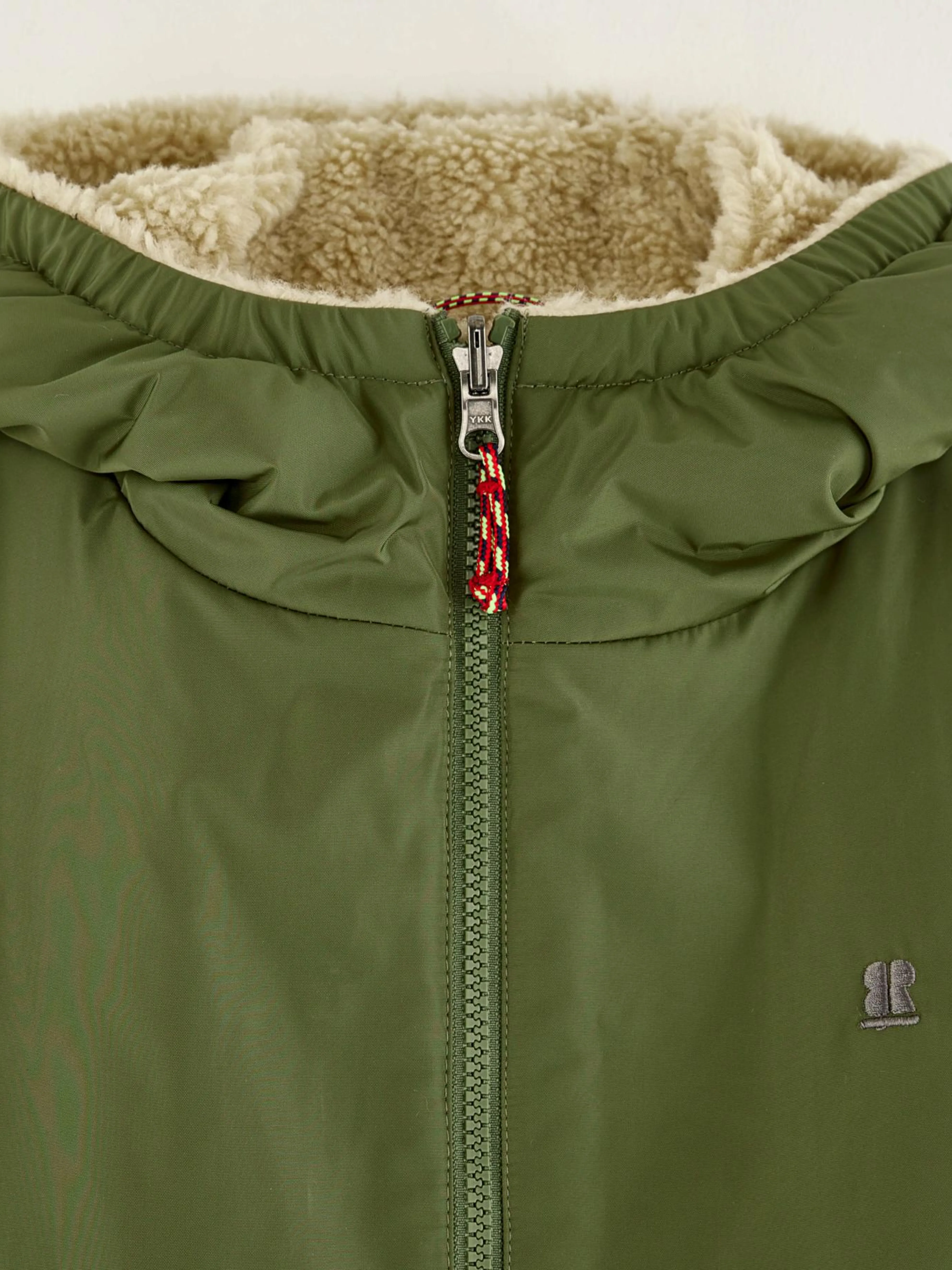 Klassieke, omkeerbare jas met capuchon, van waterafstotend groen ripstop textiel en teddystof.