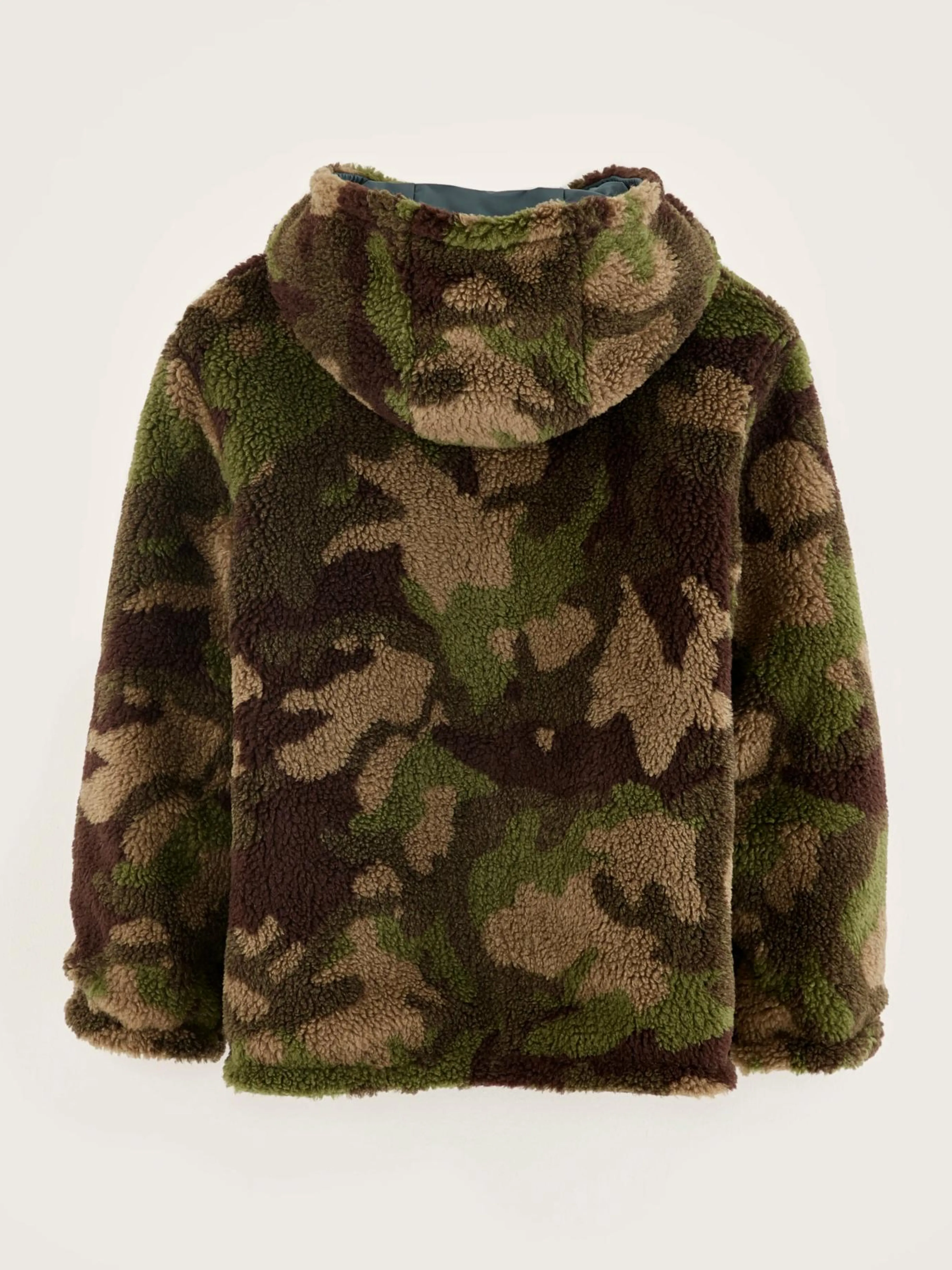 Klassieke, omkeerbare jas met capuchon, van waterafstotende, blauwgrijs ripstop textiel en teddystof met camouflageprint.