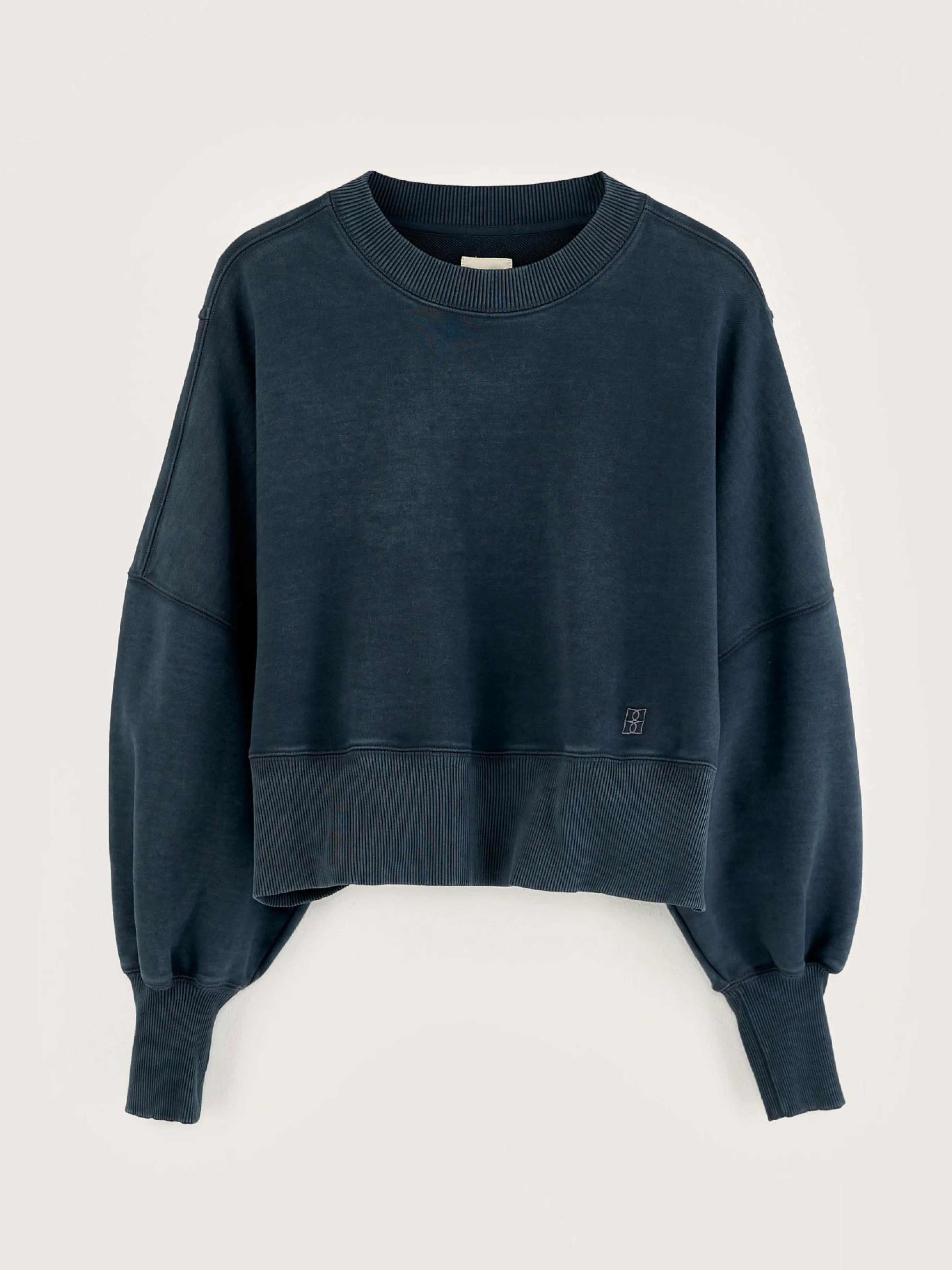 Oversized, cropped gewassen zwart sweatshirt van biologische katoenfleece.