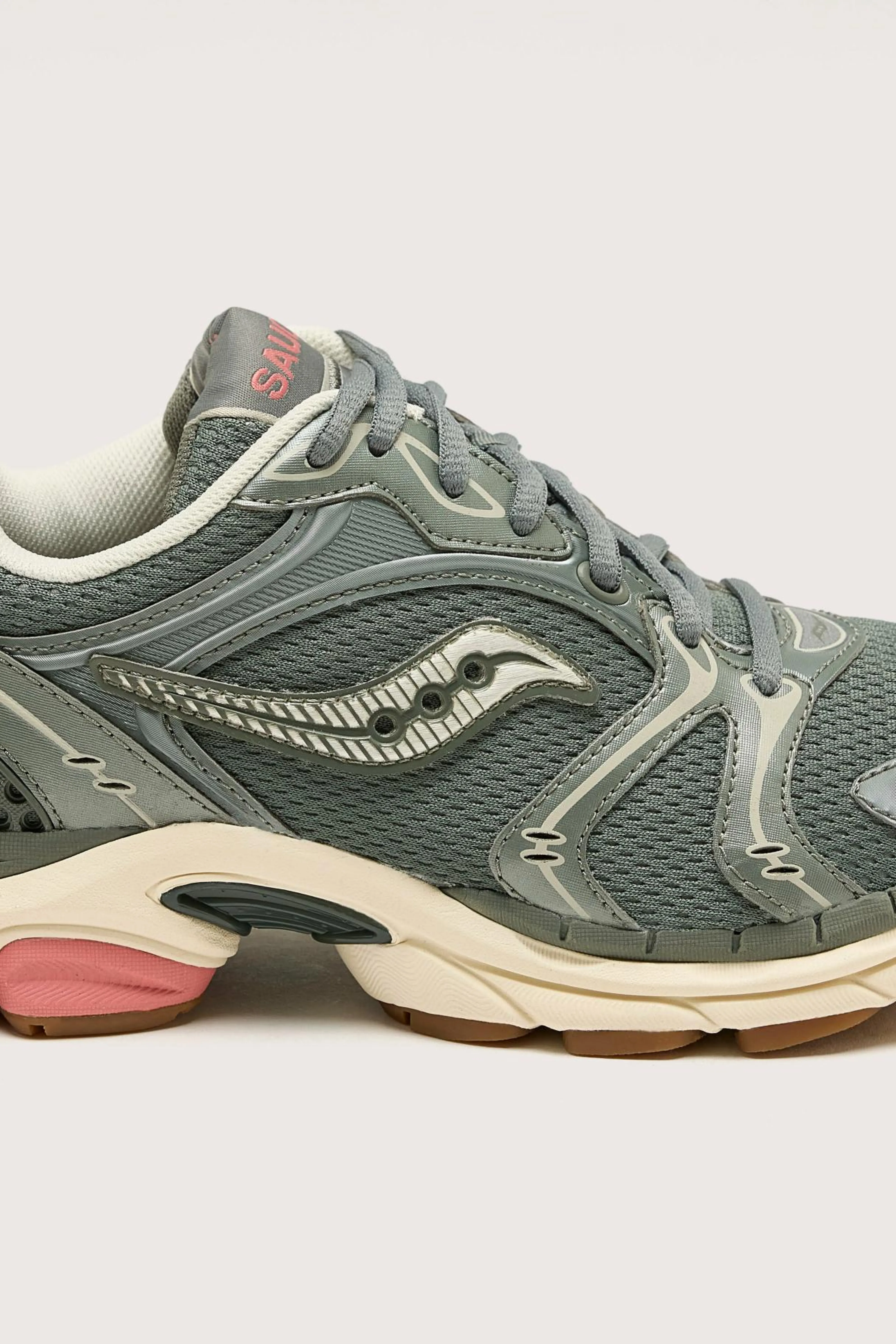 The Saucony ProGrid Triumph 4 sneaker features a closed mesh and chrome leather upper with arch-lock and ProGrid technologies for comfort.