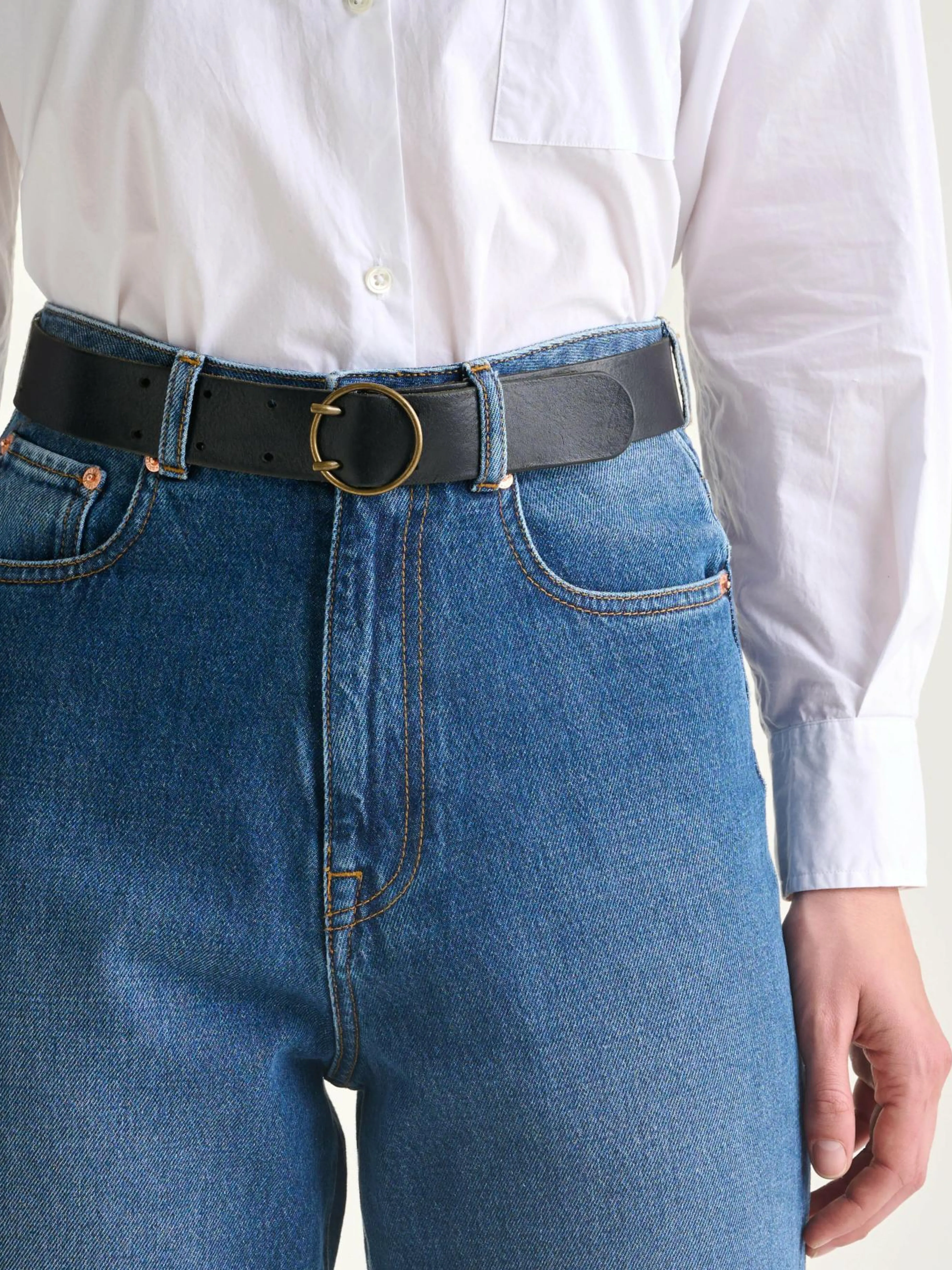 Klassieke leren riem gemaakt van glad zwart leer die wordt vastgezet met een ronde gesp van verouderd messing.