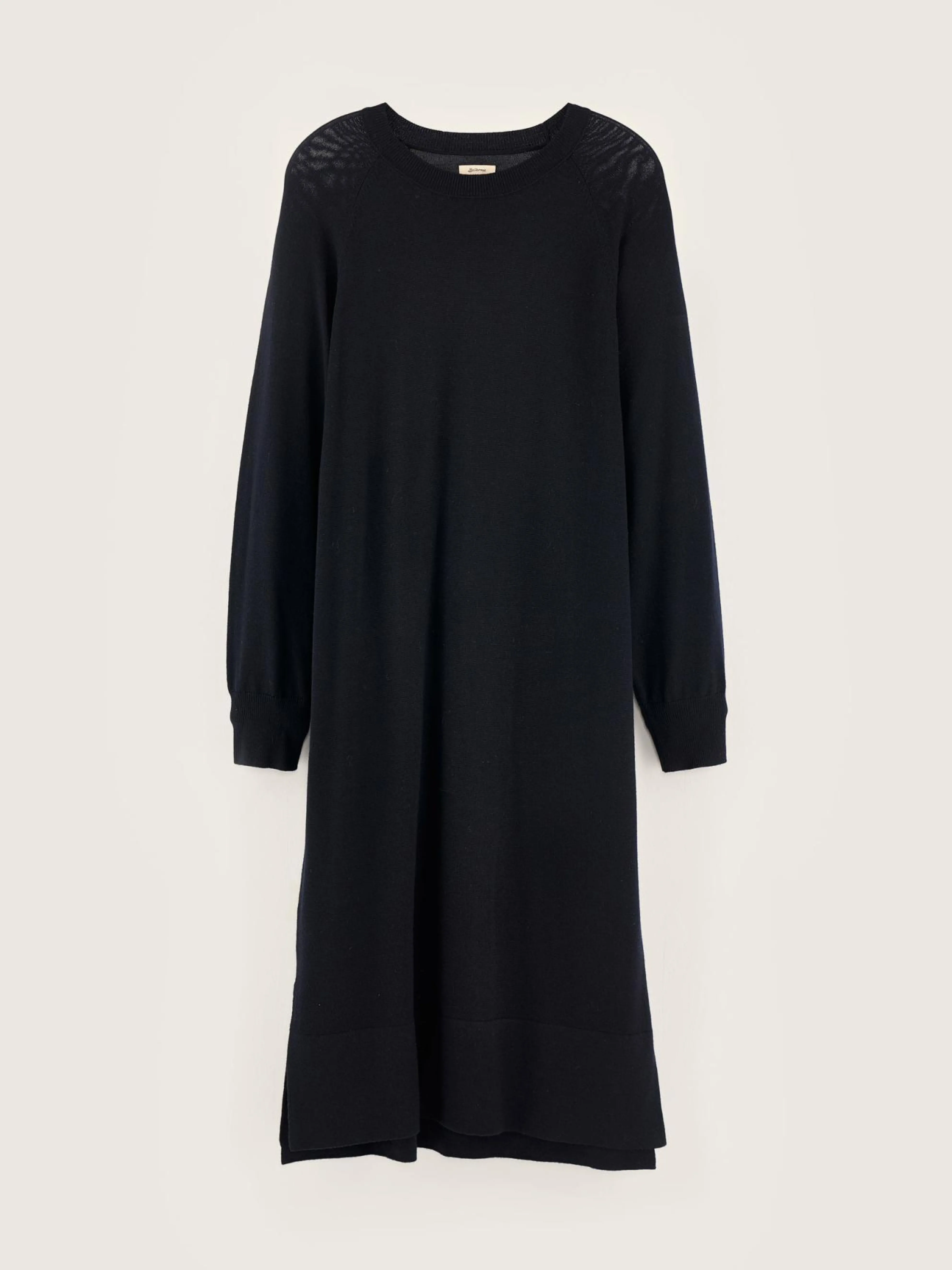 Marineblauwe midi-jurk van extra fijne merino, met lange raglanmouwen en zijsplitten.