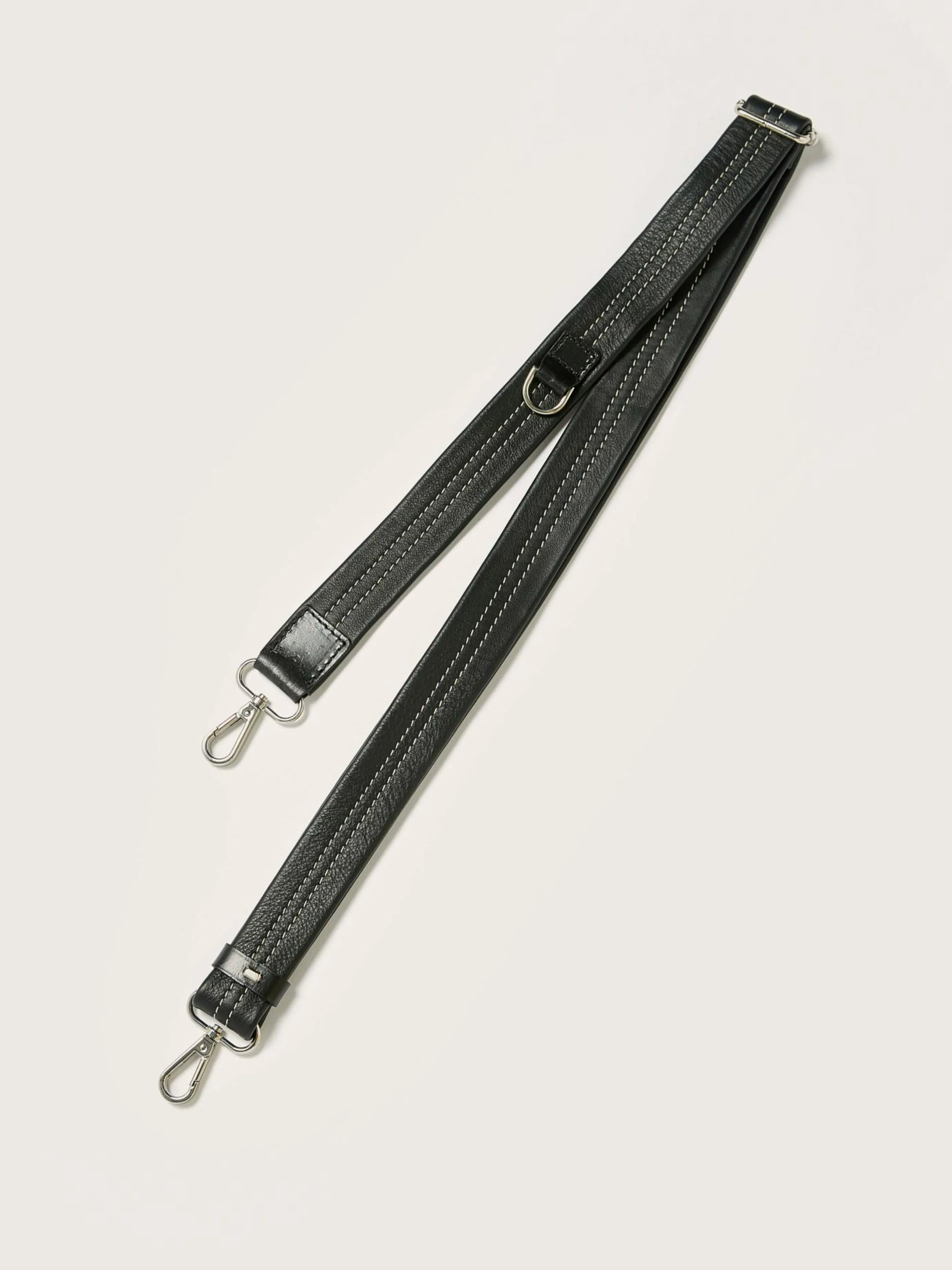 Verstelbare riem van zwart glad leer met zilverkleurige hardware.