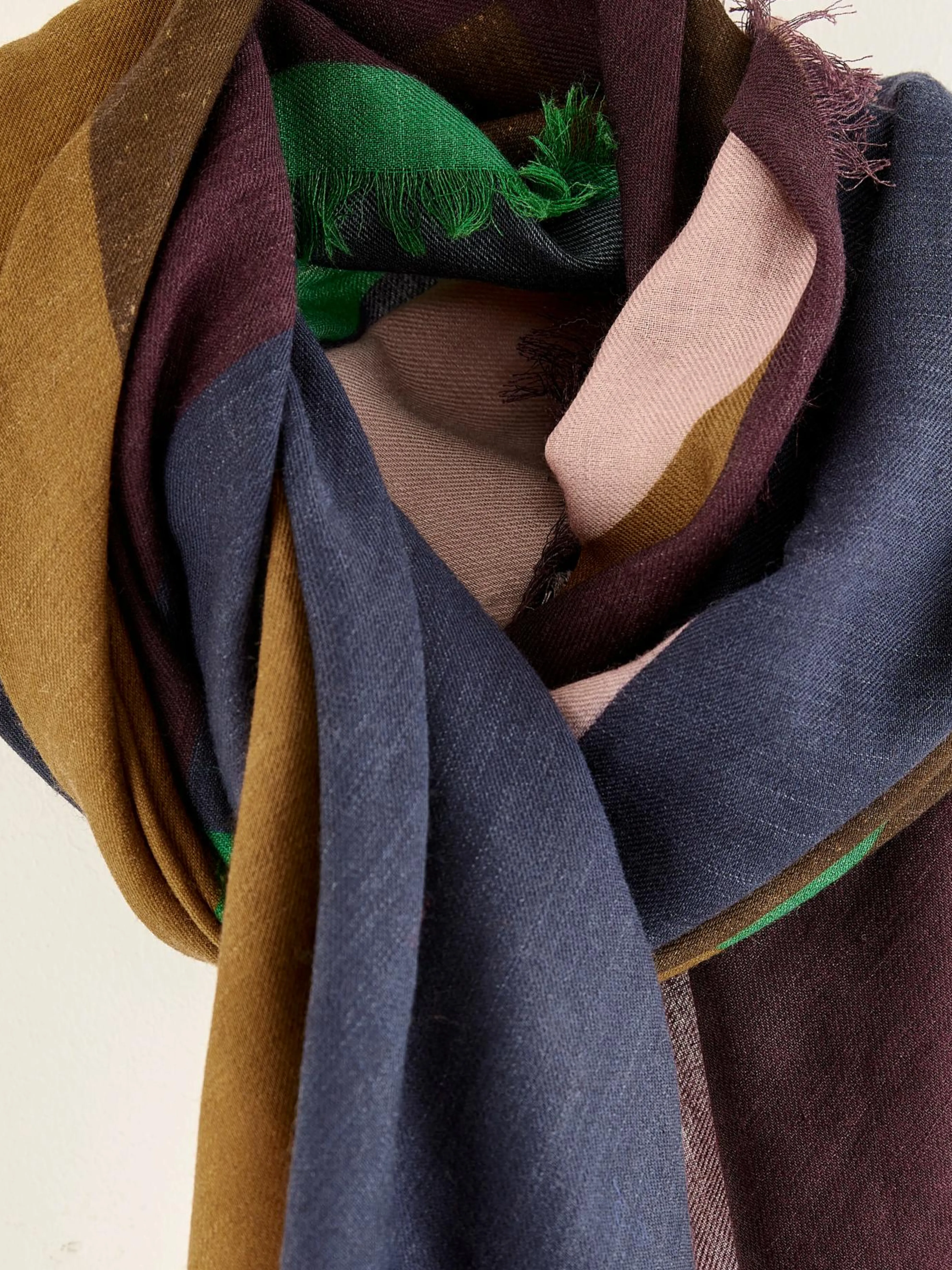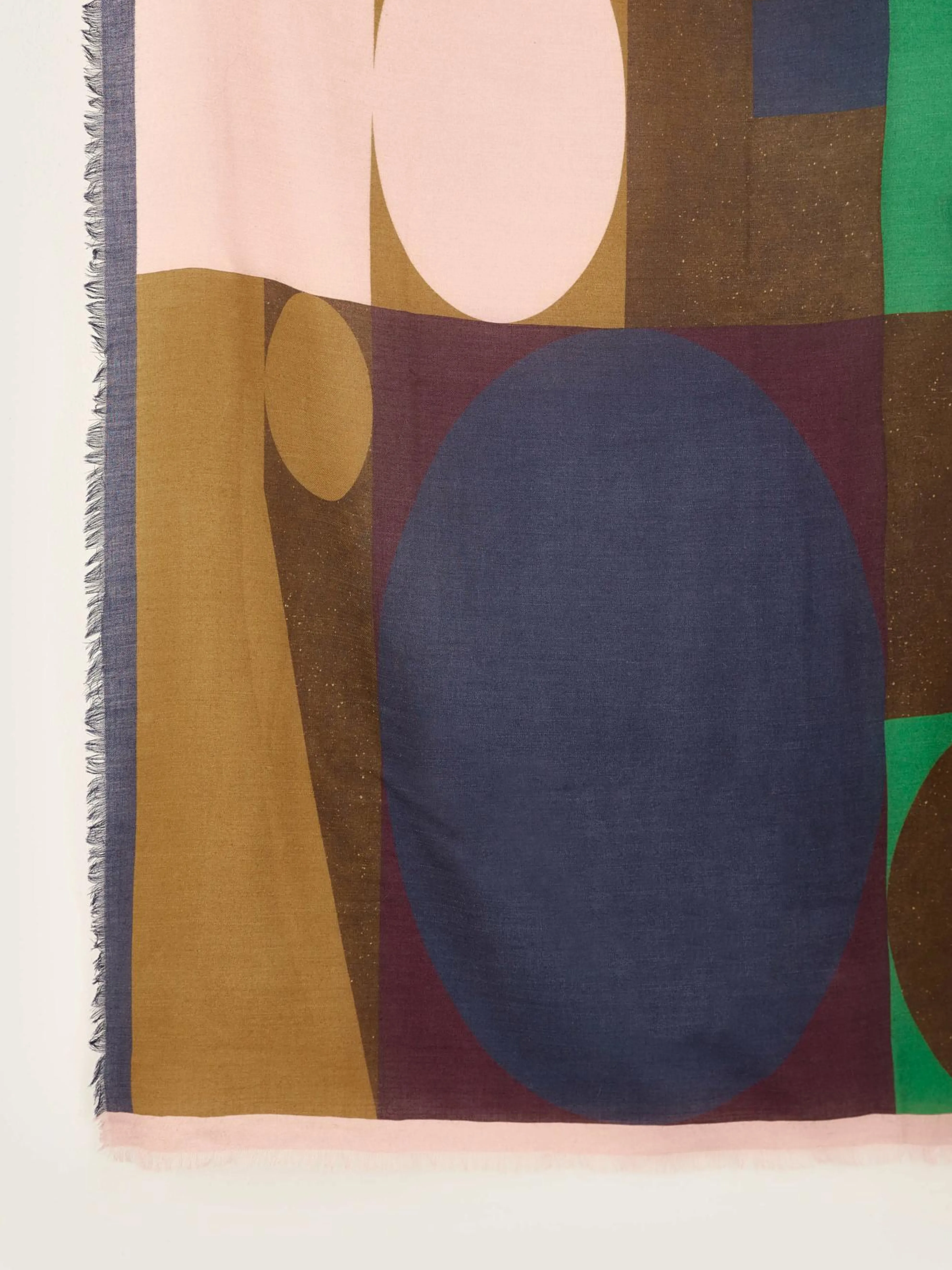 Vierkante sjaal met logo in veelkleurige letters op een gespikkelde achtergrond.
