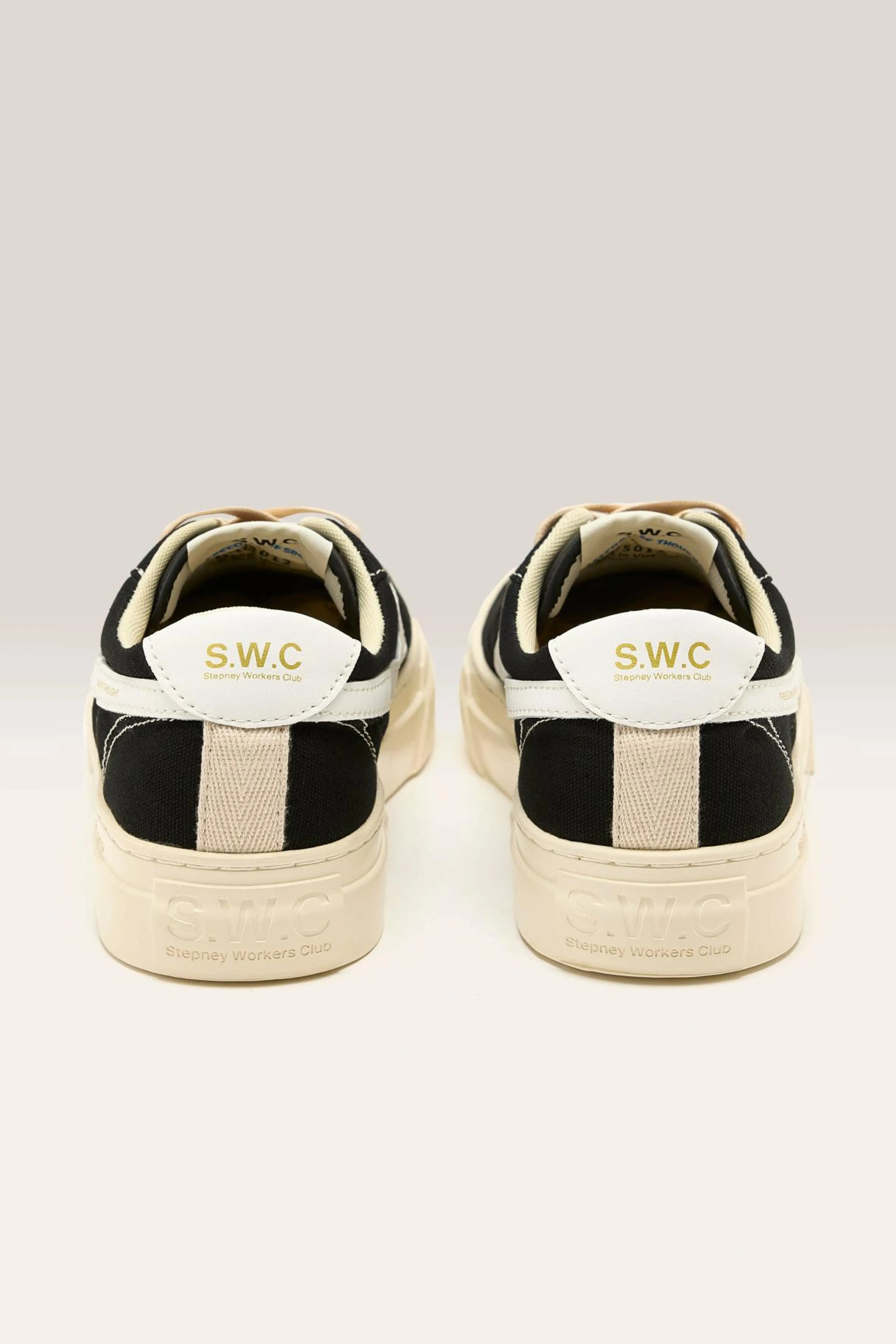 The Stepney Workers Club Dellow S-Strike sneaker features a canvas upper, a leather S-Strike, and high-wall foxings on a rubber cupsole.