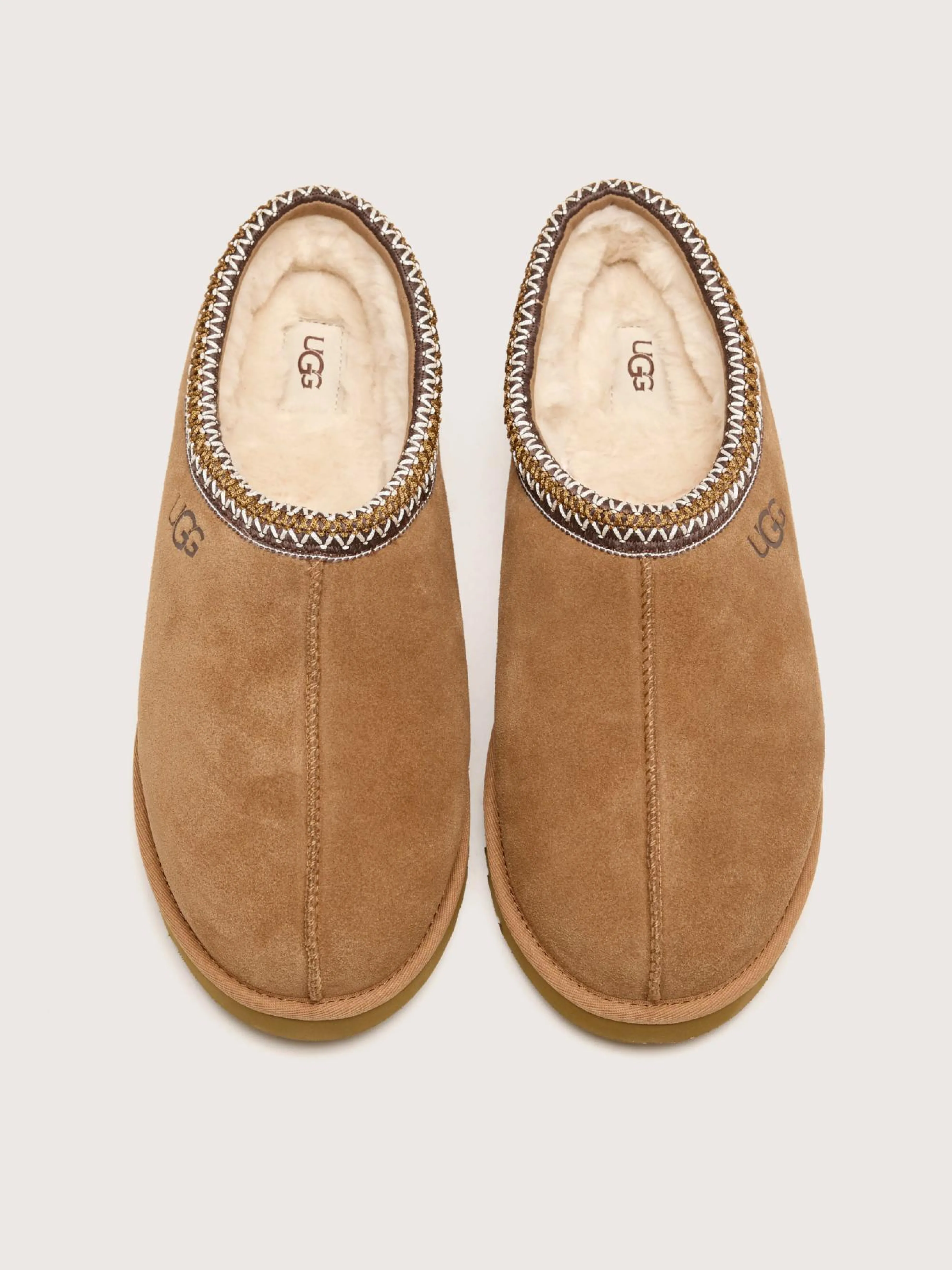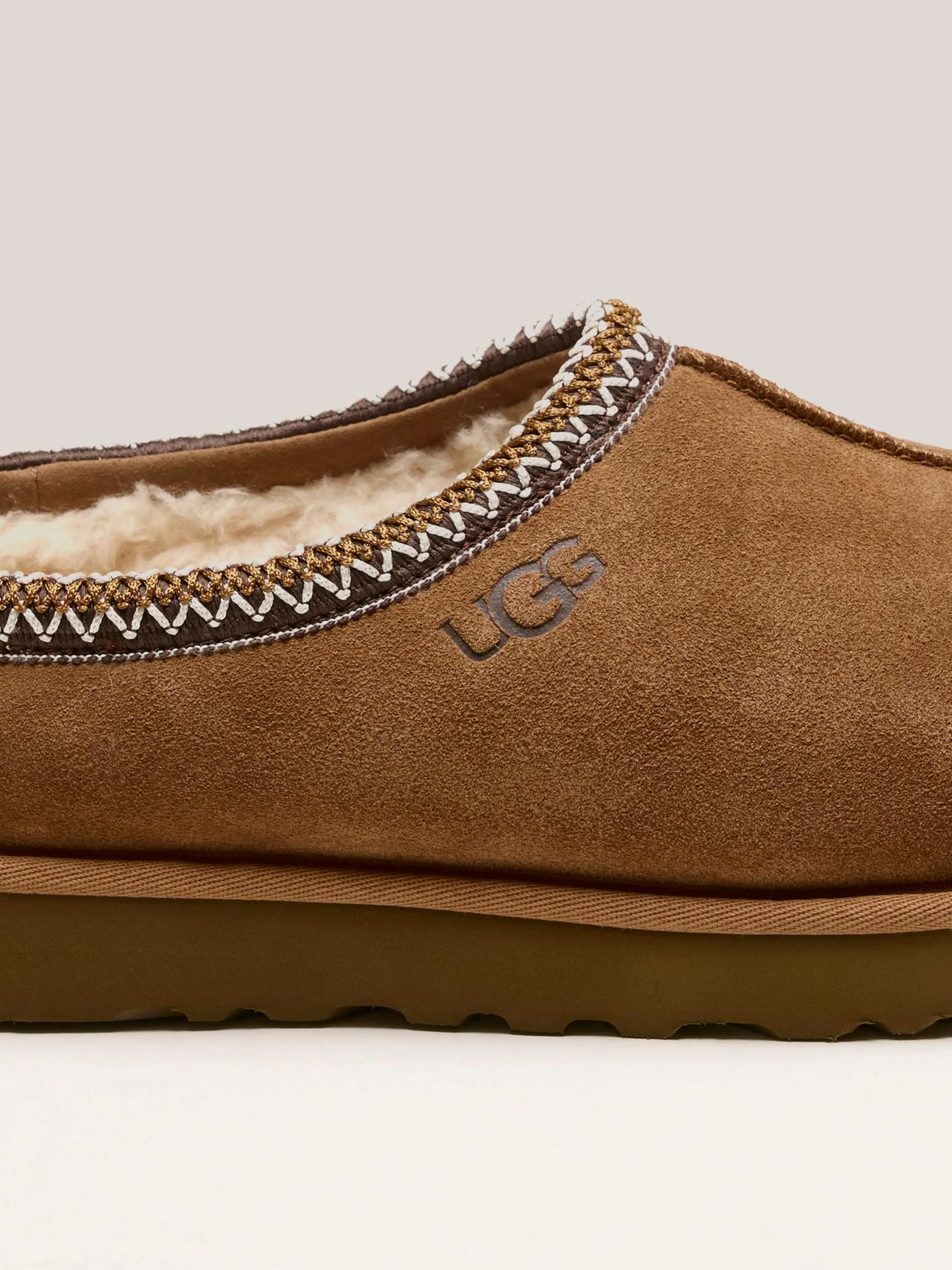 De UGG Tasman Slipper heeft een lichte, duurzame buitenzool, een pluche voering van wol en een bovenwerk van zacht suède.