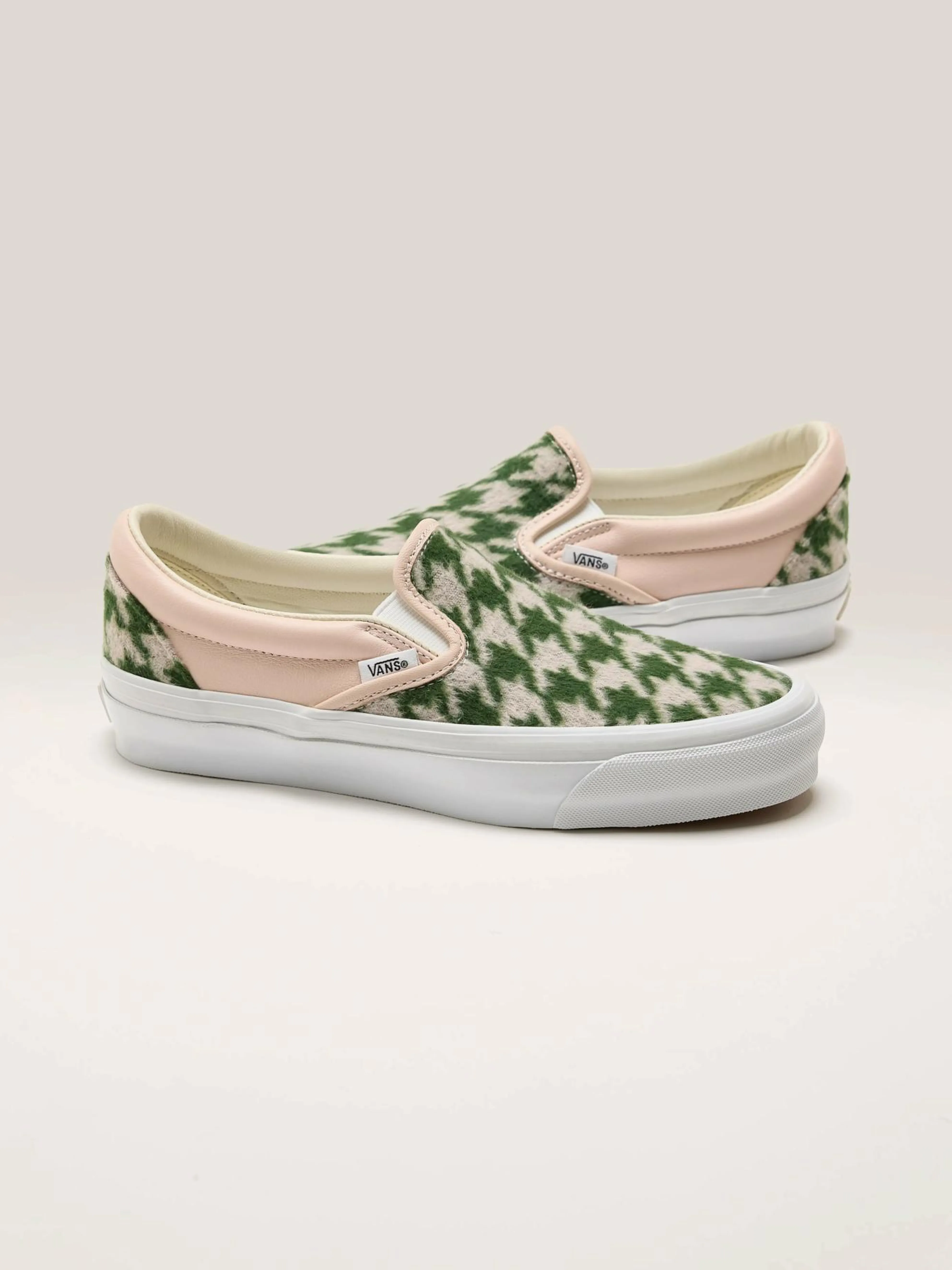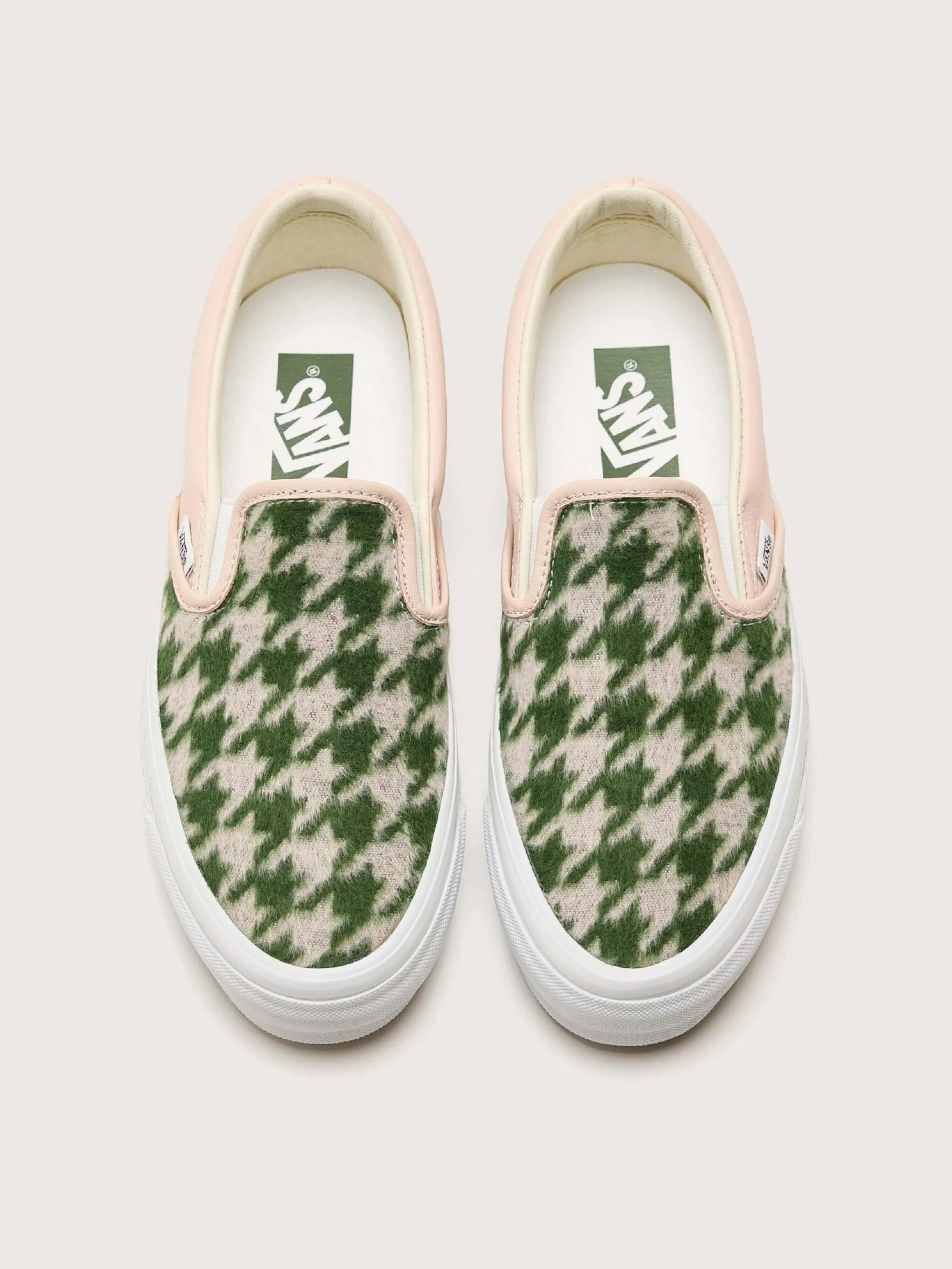 De Vans Slip-on Reissue 98 schoenen hebben een bovenwerk van canvas en leder met houndstooth print en een rubberen buitenzool met hoge zijwand.