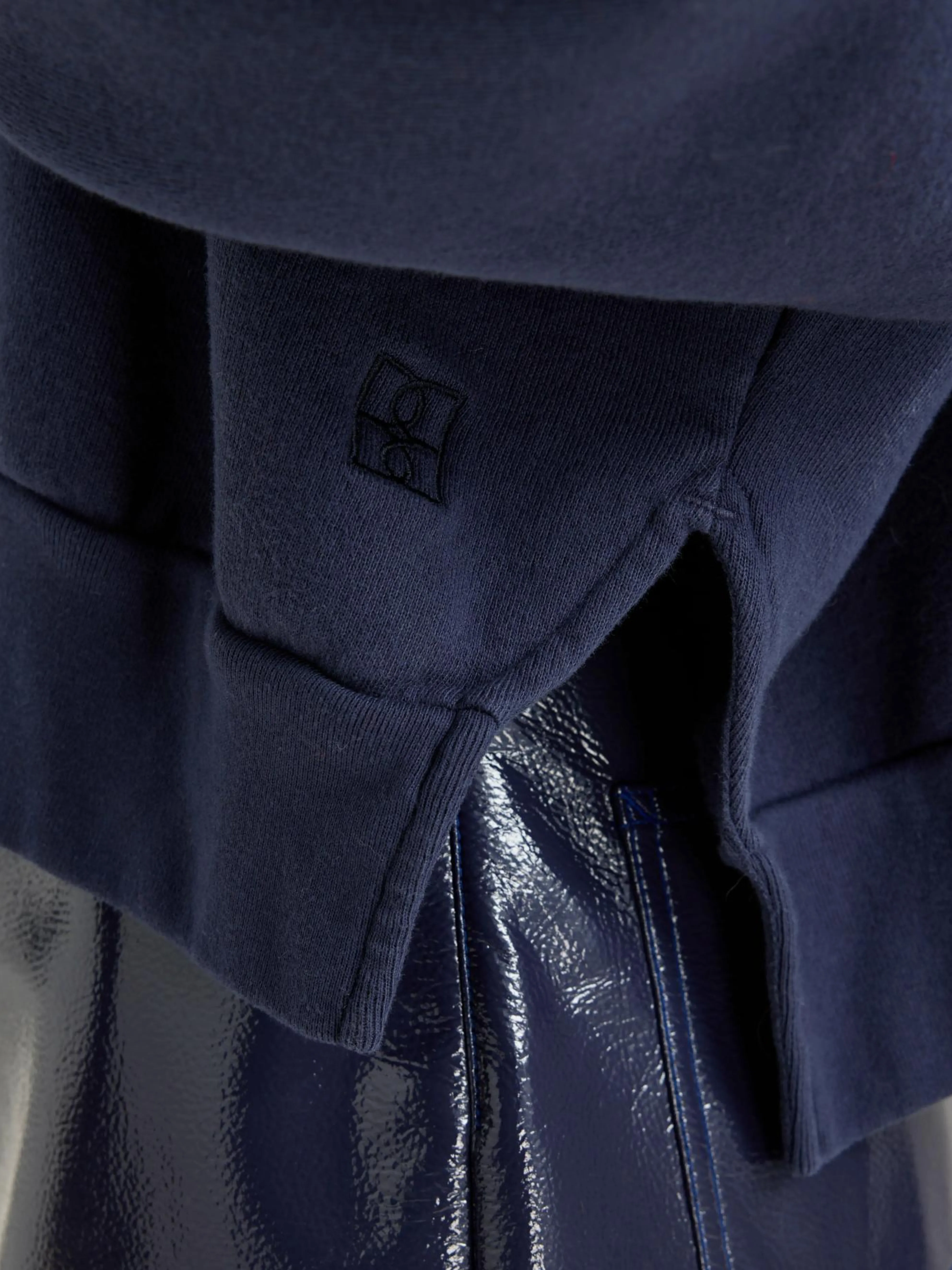 Marineblauwe V-hals sweatshirt met ruime, cropped pasvorm, pofmouwen en zijsplitten.