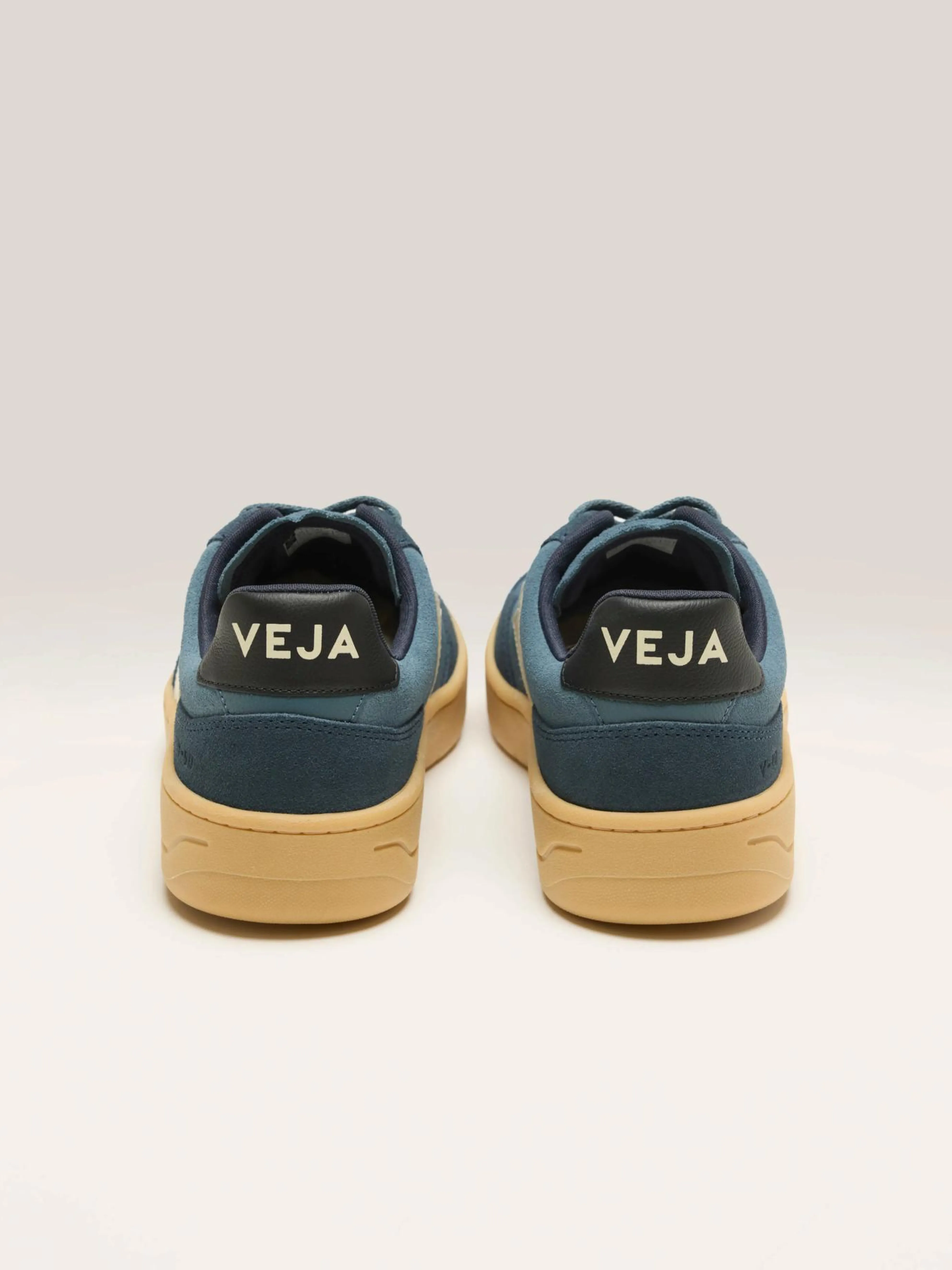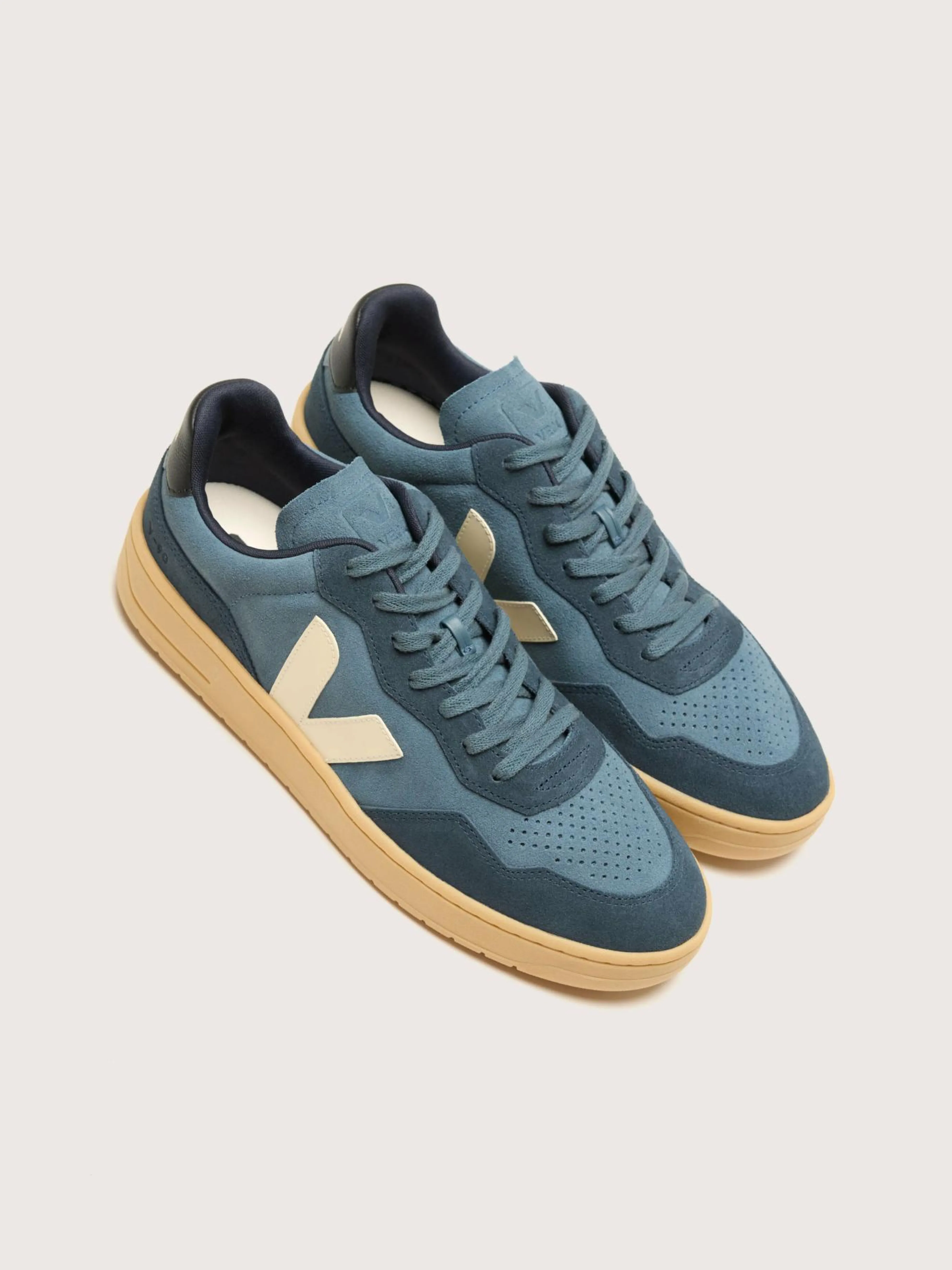 The Veja V-90 sneakers feature a suede upper with Amazonian rubber soles in an eco-friendly design.