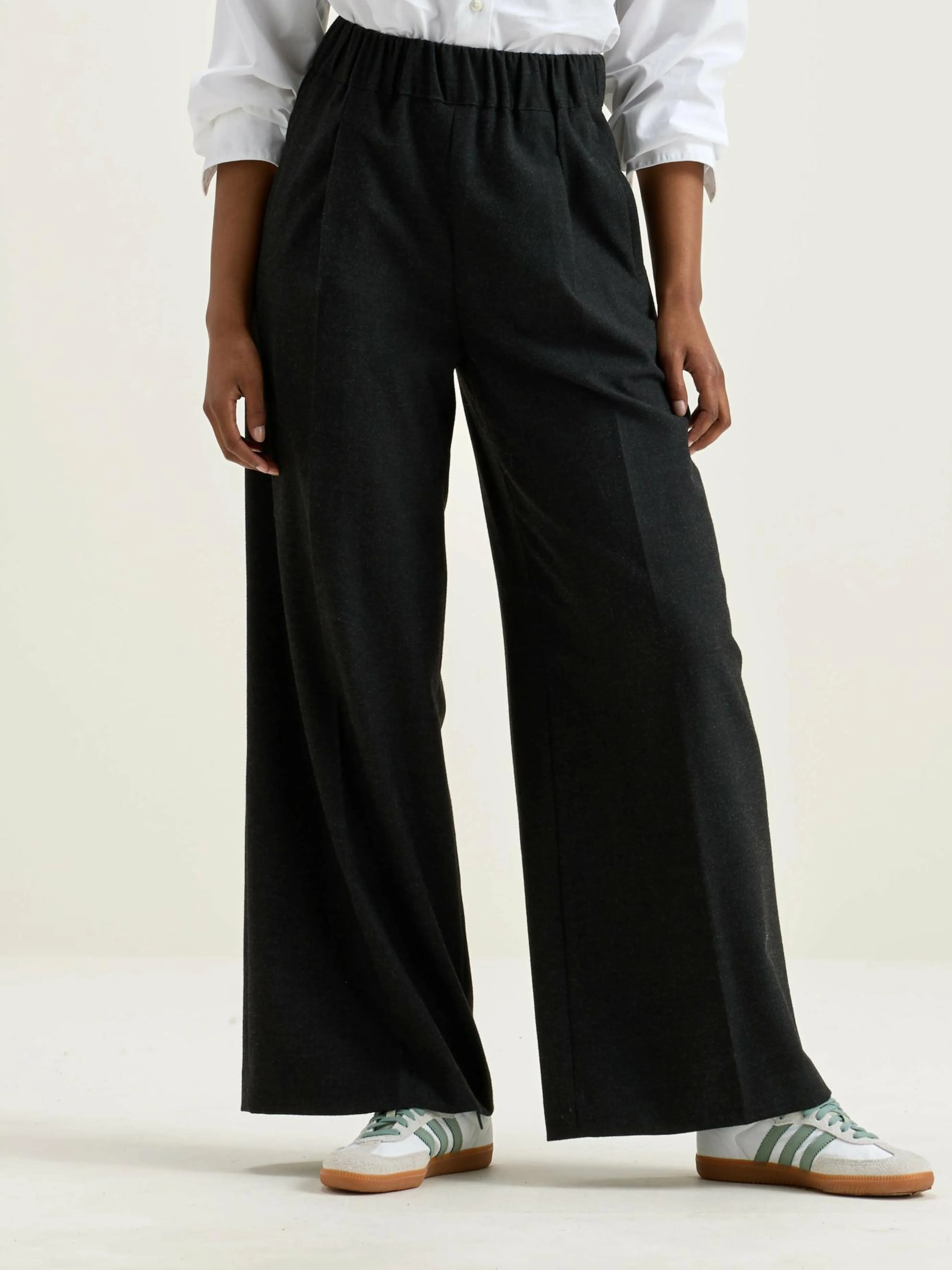 Antracietgrijze broek met wijde pijpen, een elastische tailleband en paspelzakken.