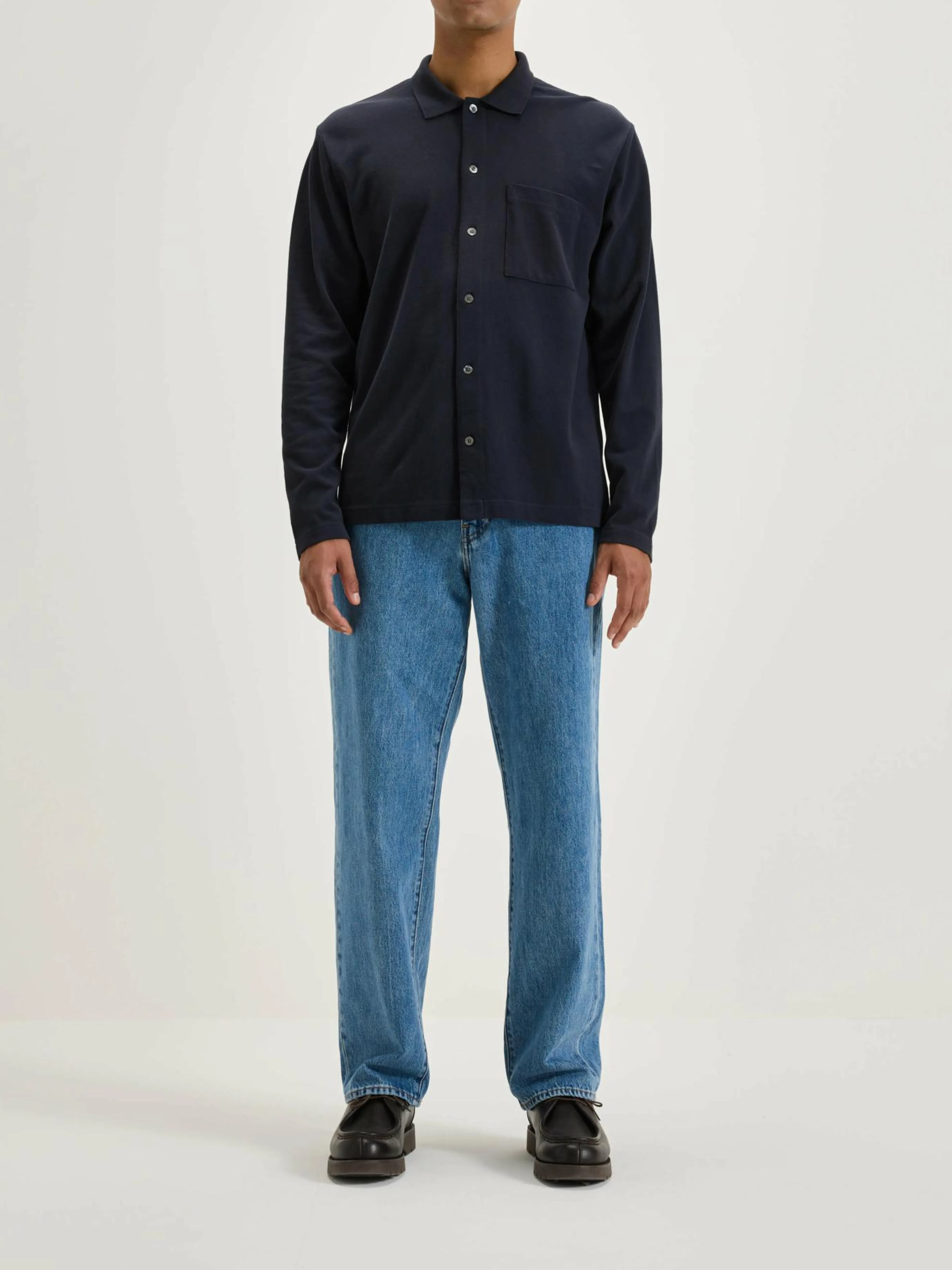 Relaxede polo met knoopsluiting in marineblauw katoen.