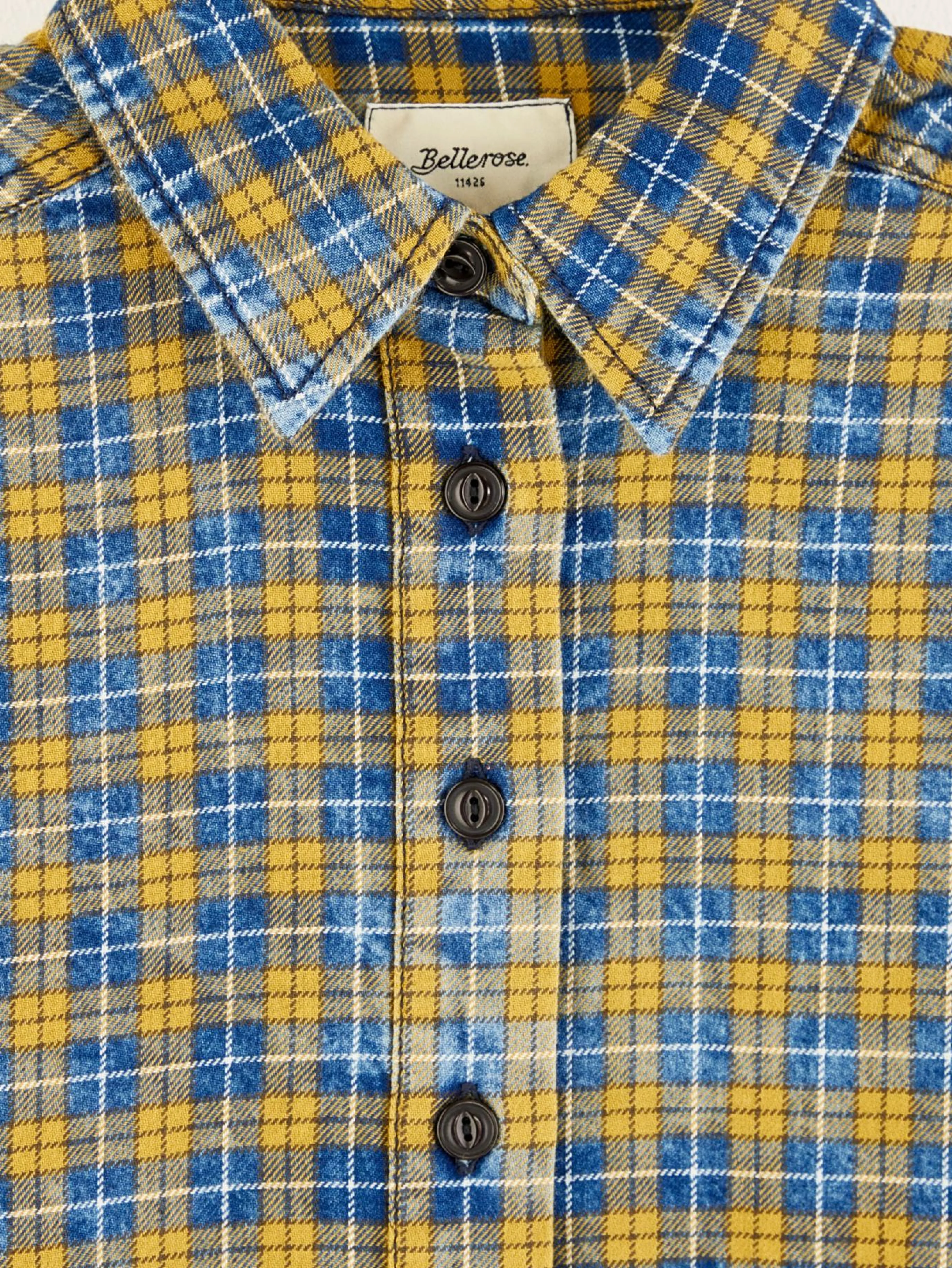 Korte hemdjurk met opgerolde mouwen, van katoen met afgewassen indigo ruiten.