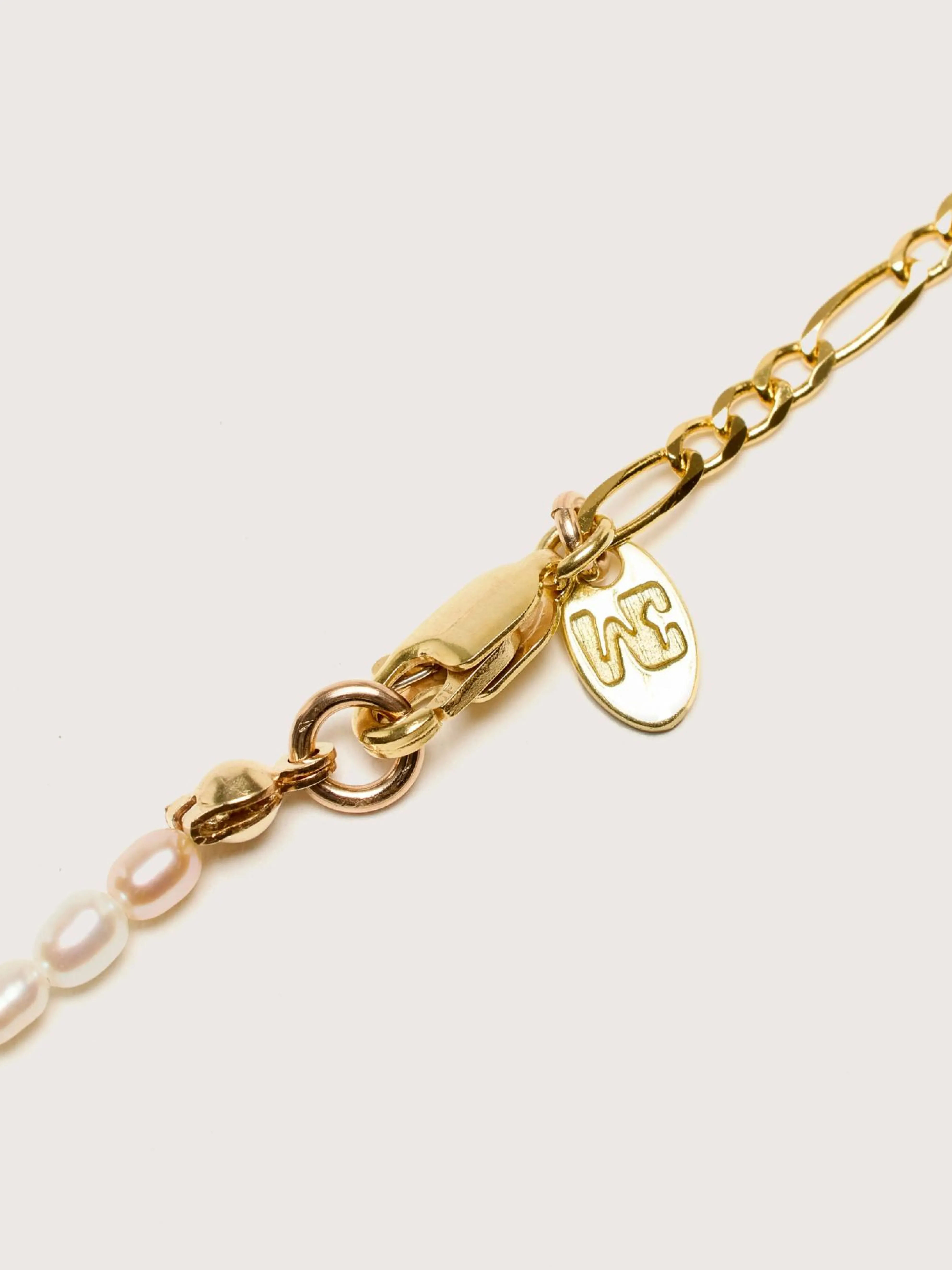 The Wolf Circus Mara Necklace features freshwater pearls on a gold vermeil Figaro chain.
